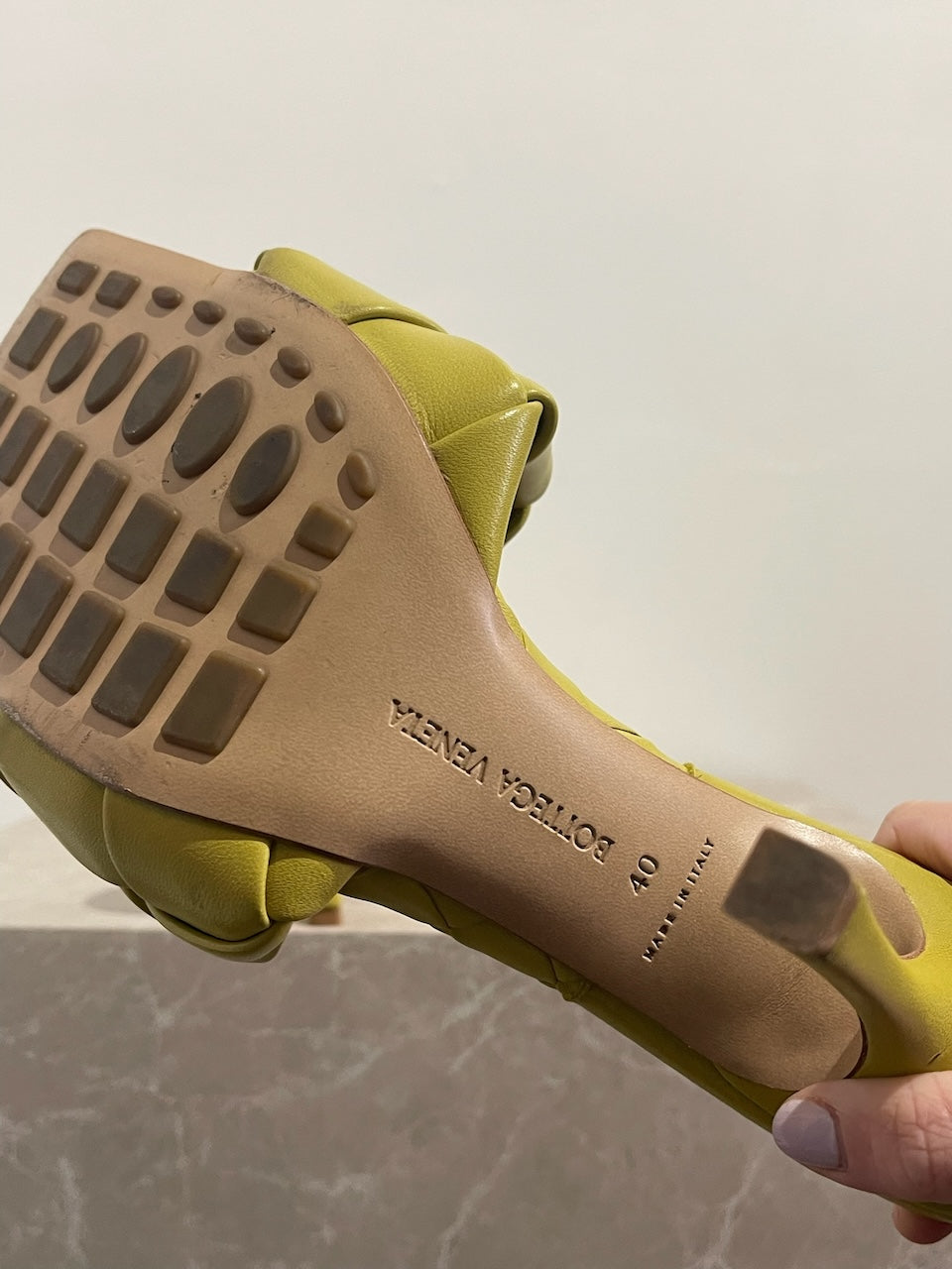 Mules à talons en cuir intrecciato vert. Bouts carrés.