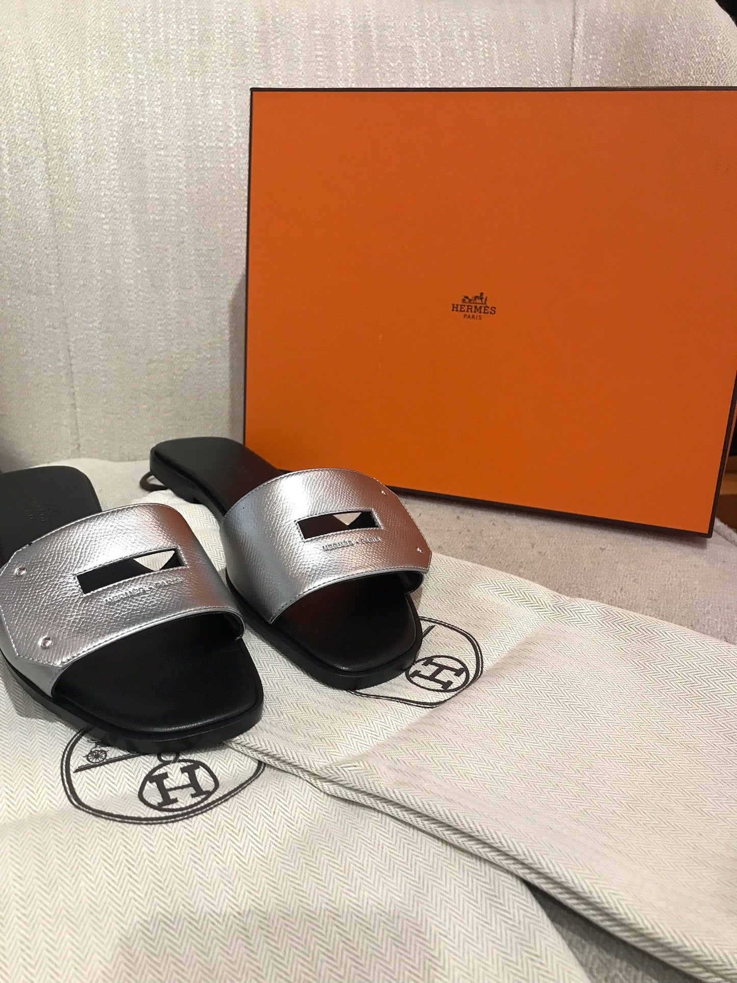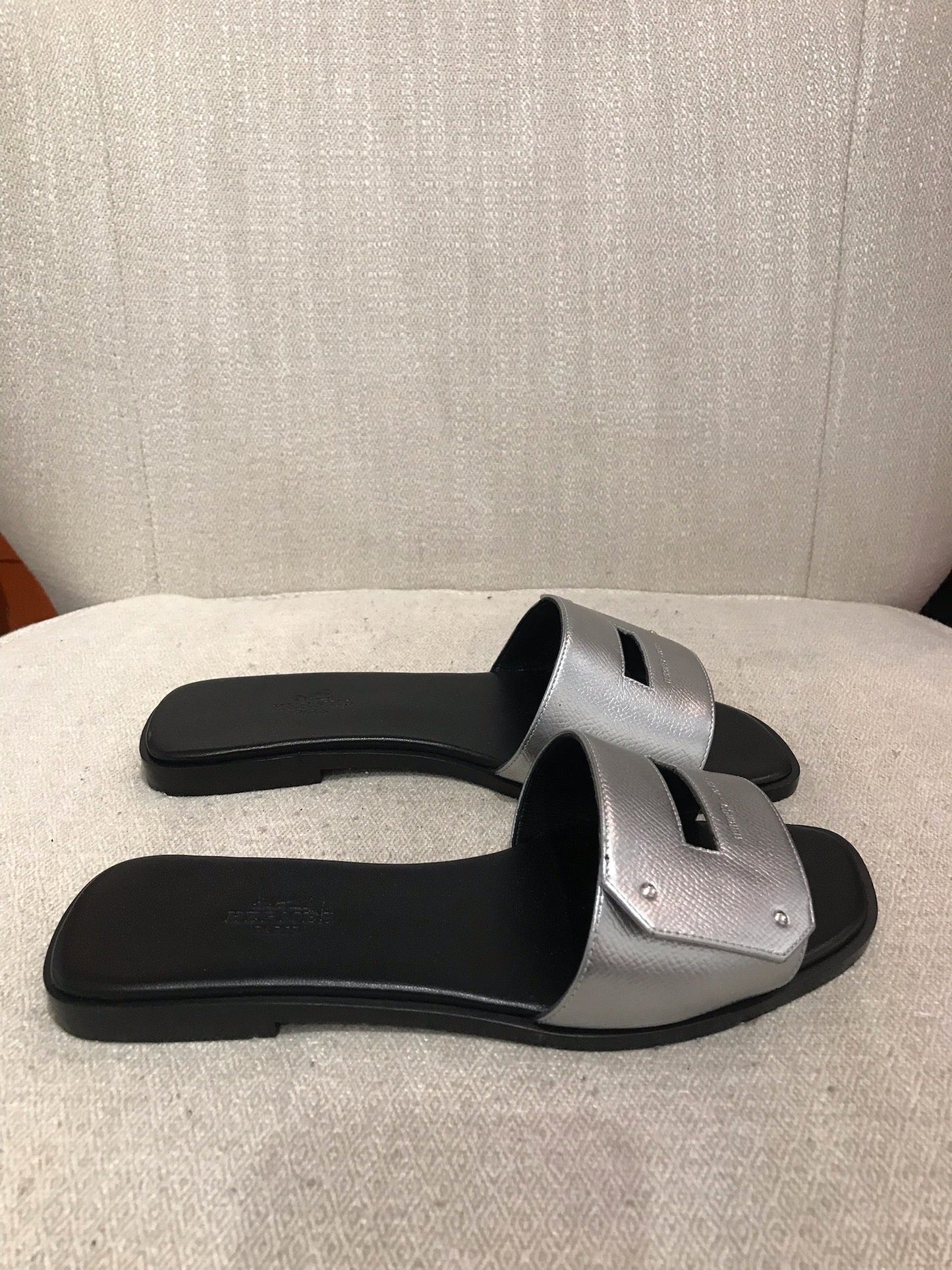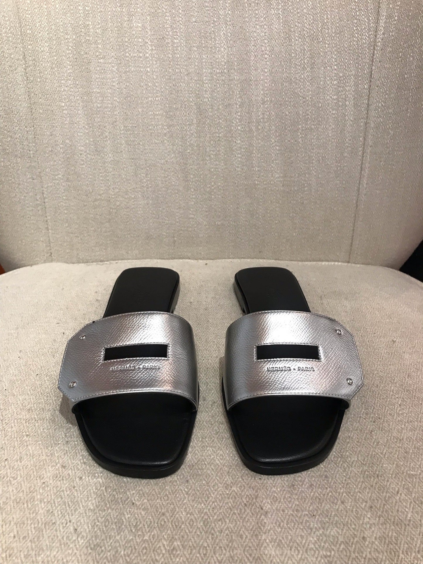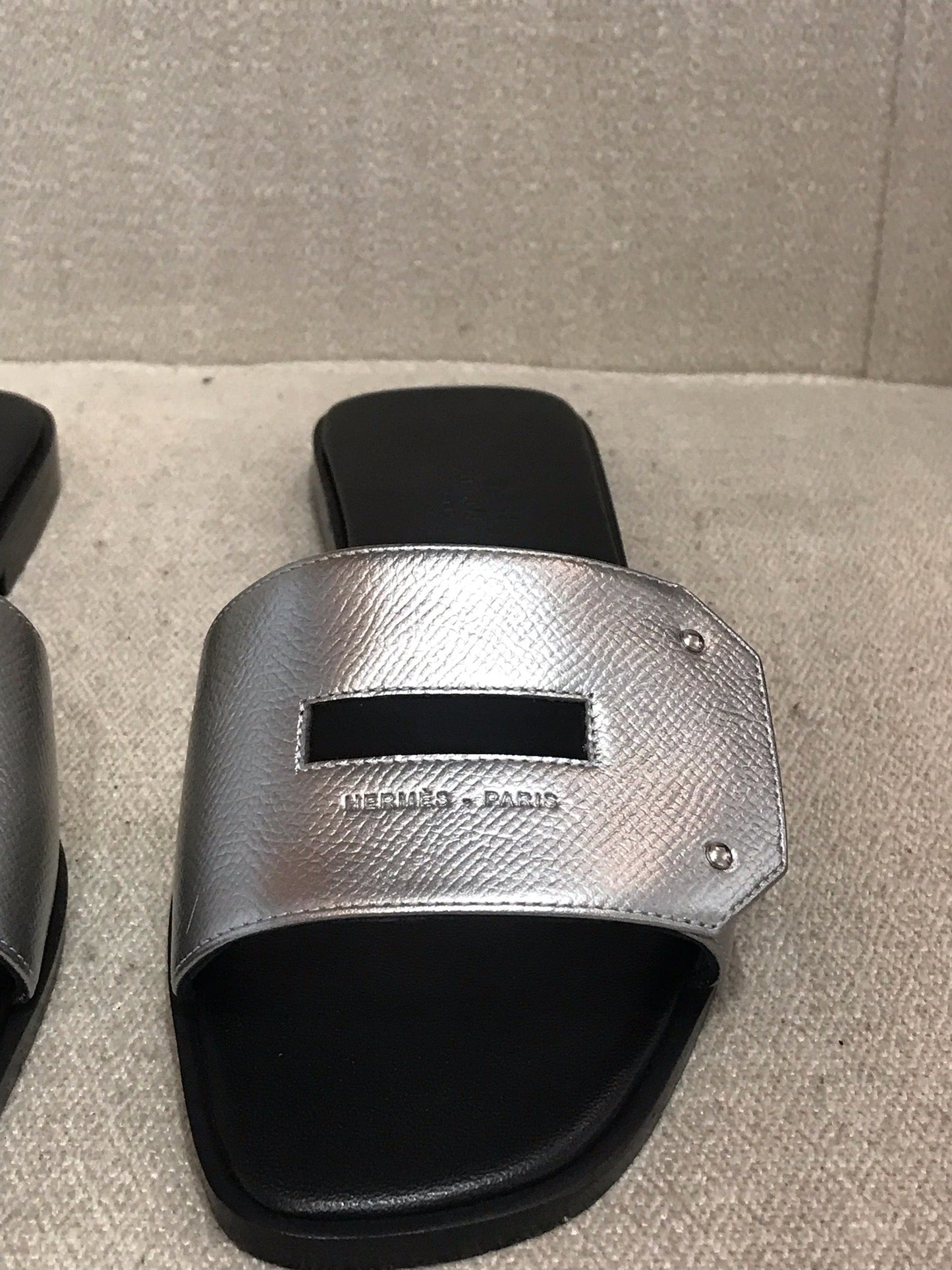 Mules en cuir argenté métallisé signé Hermès.