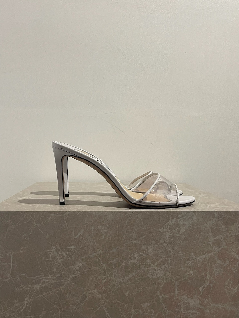 Mules en cuir blanc et plexi transparent avec bouts ouverts.