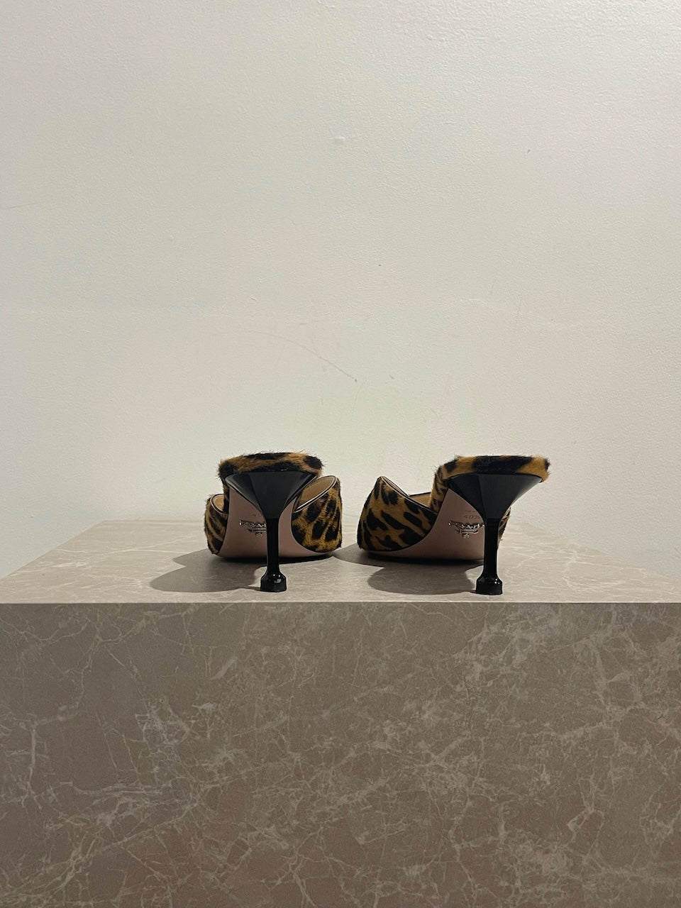 Mules à talons en poulain imprimé léopard avec bouts pointus et décolleté en V aux orteils.