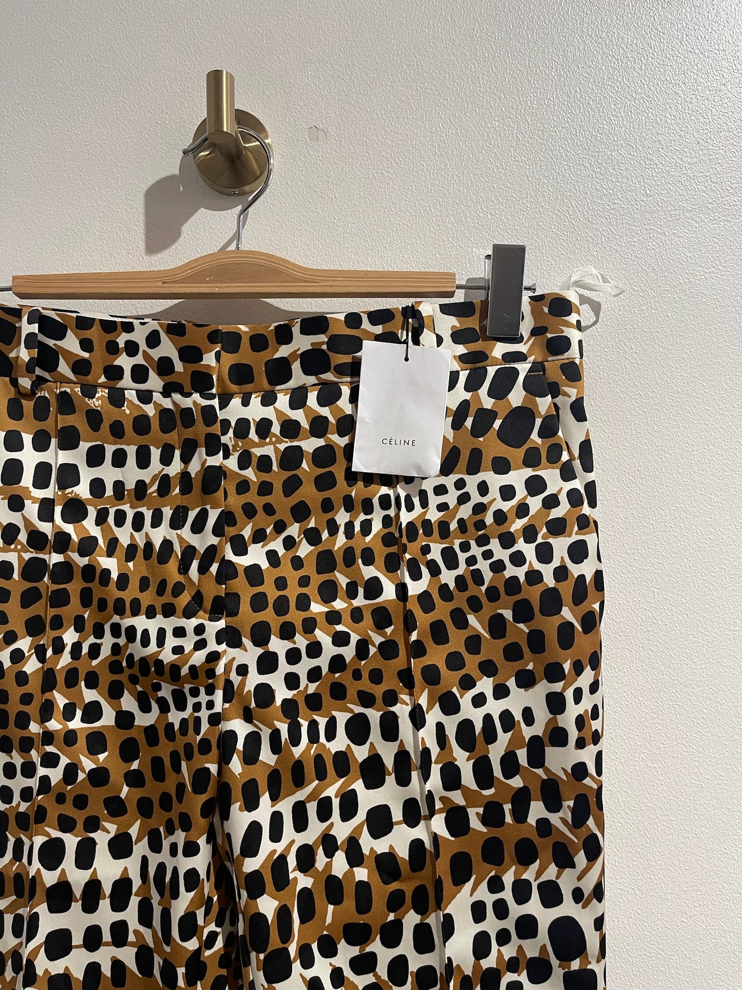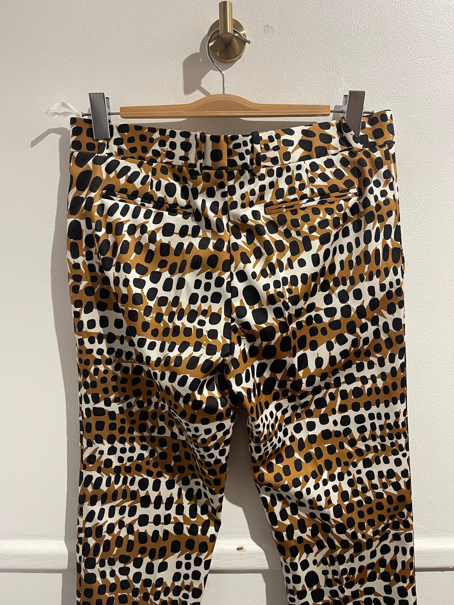 Pantalon en polyester imprimé noir, blanc et camel. Fermeture zip et agrafes à la taille. Coupe ajustée.