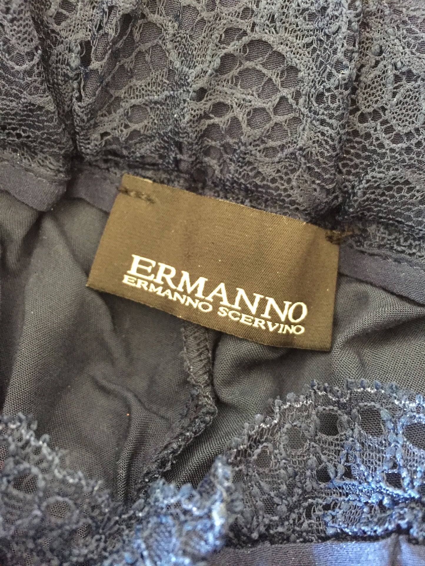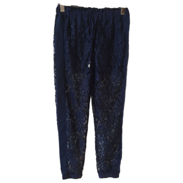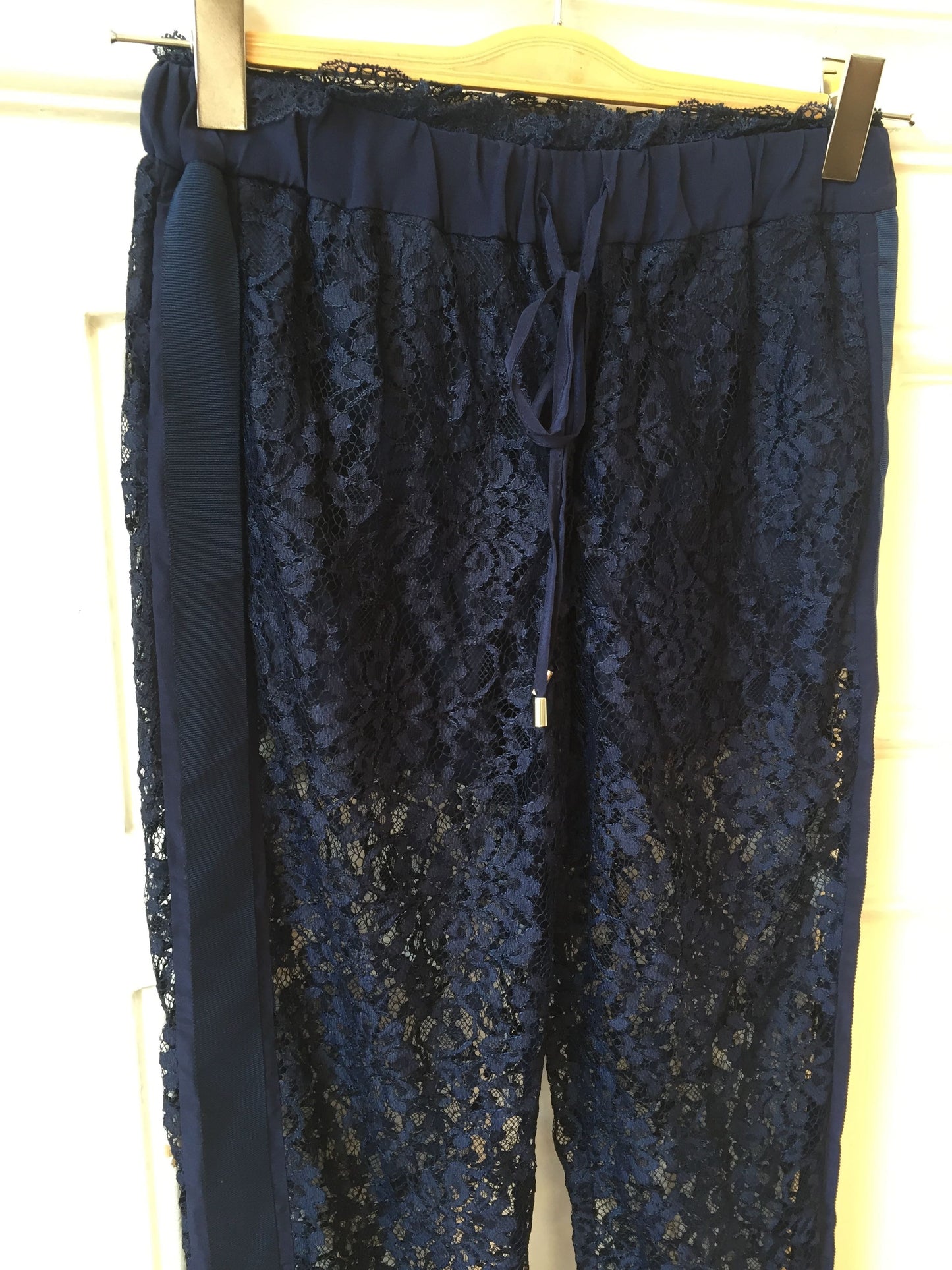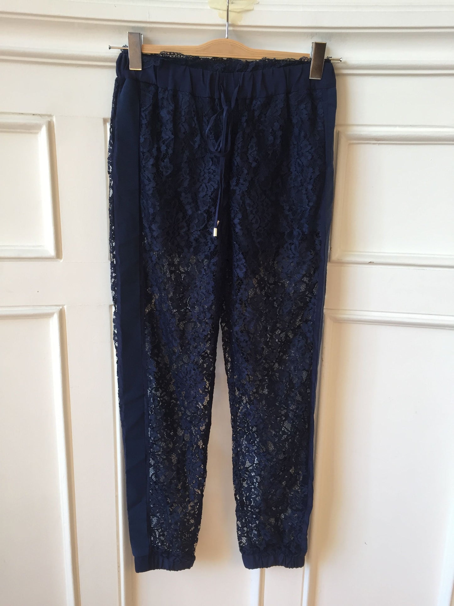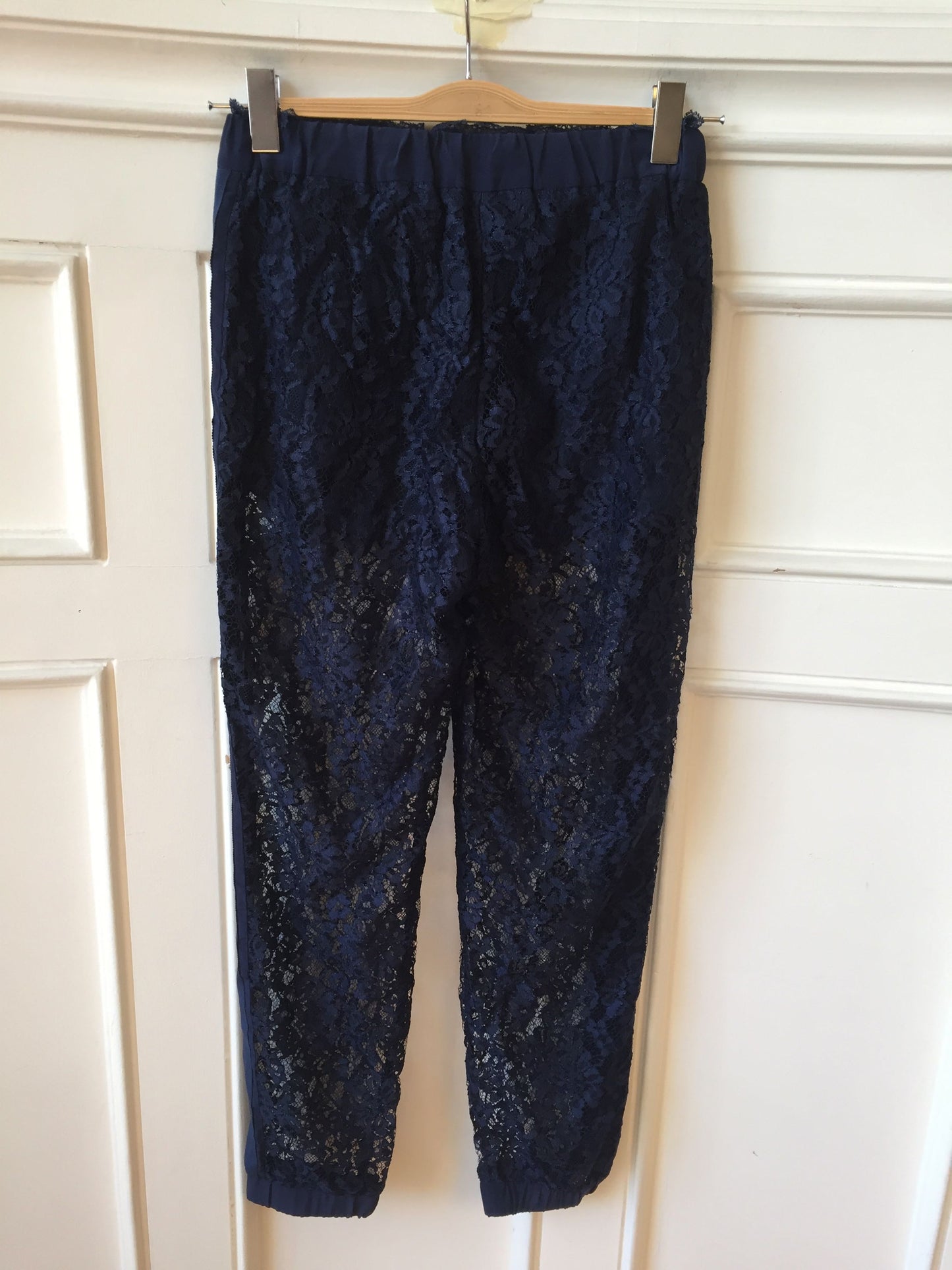 Pantalon en dentelle bleu marine, resserré à la taille et aux chevilles.
