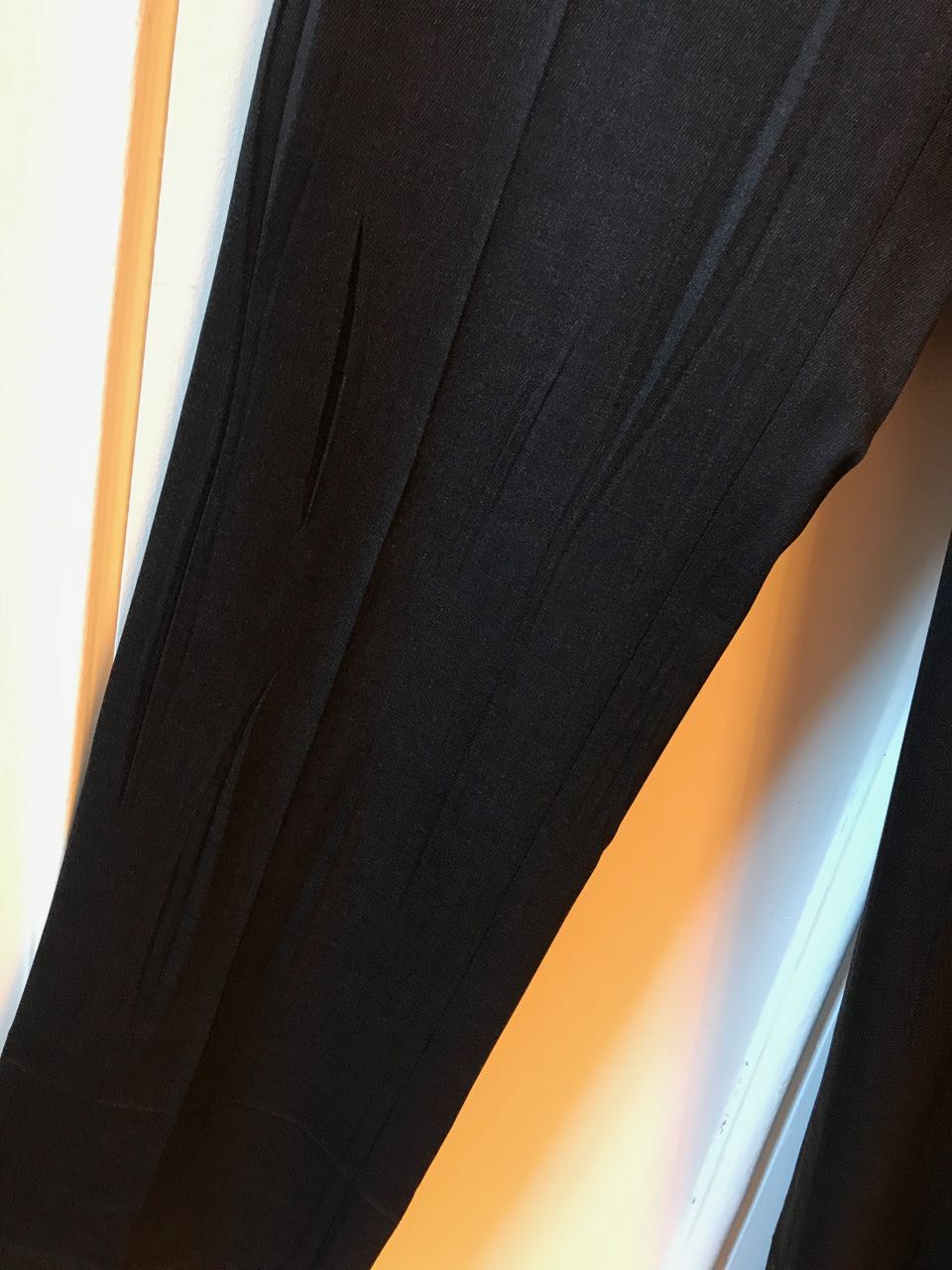 Pantalon coupe droite et large gris foncé avec effet froissé.