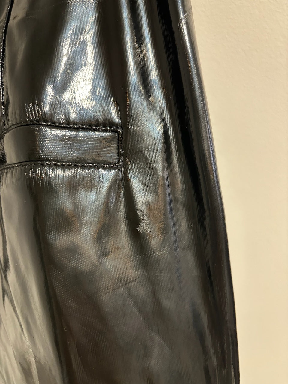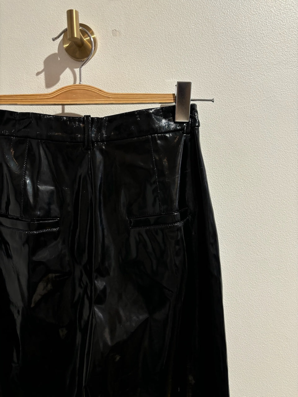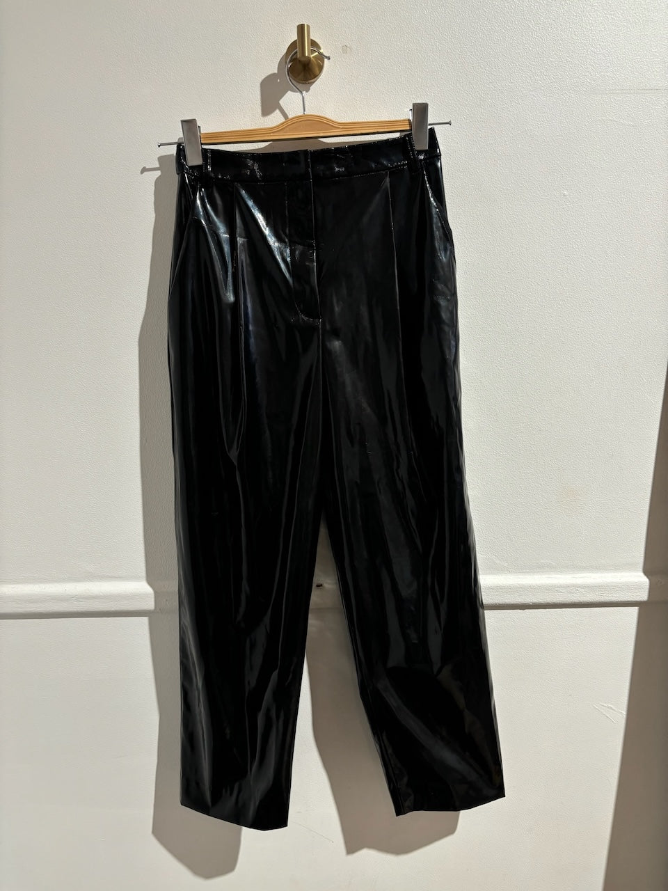 Pantalon en similicuir noir avec fermeture avant, poches latérales et poches arrière. Coupe large et droite. Taille haute.