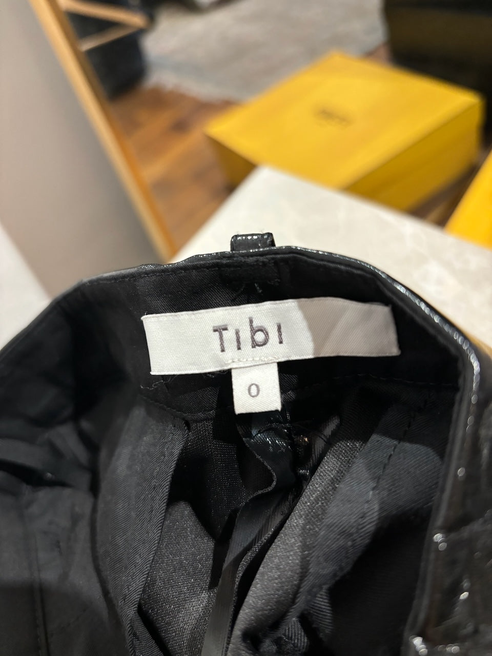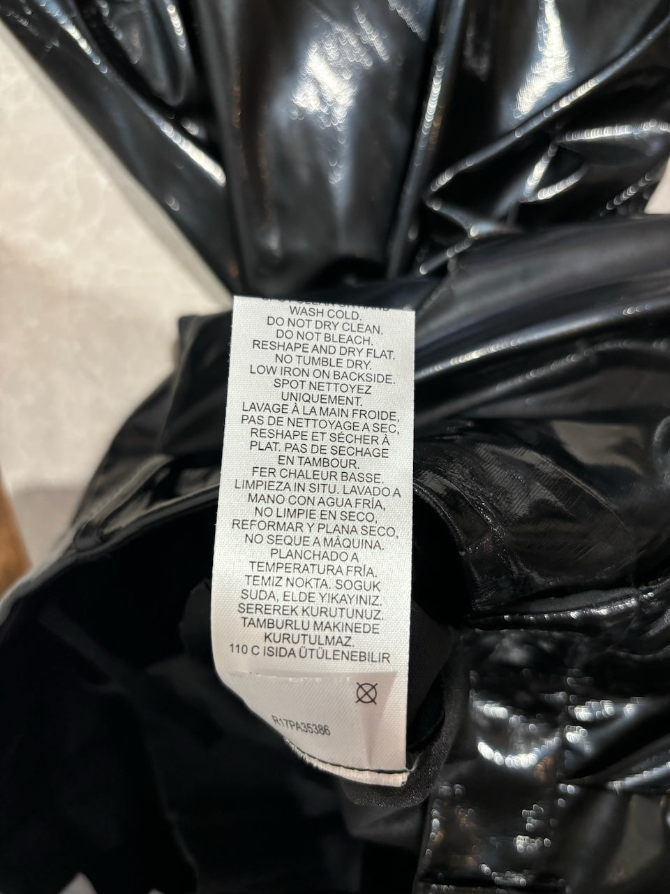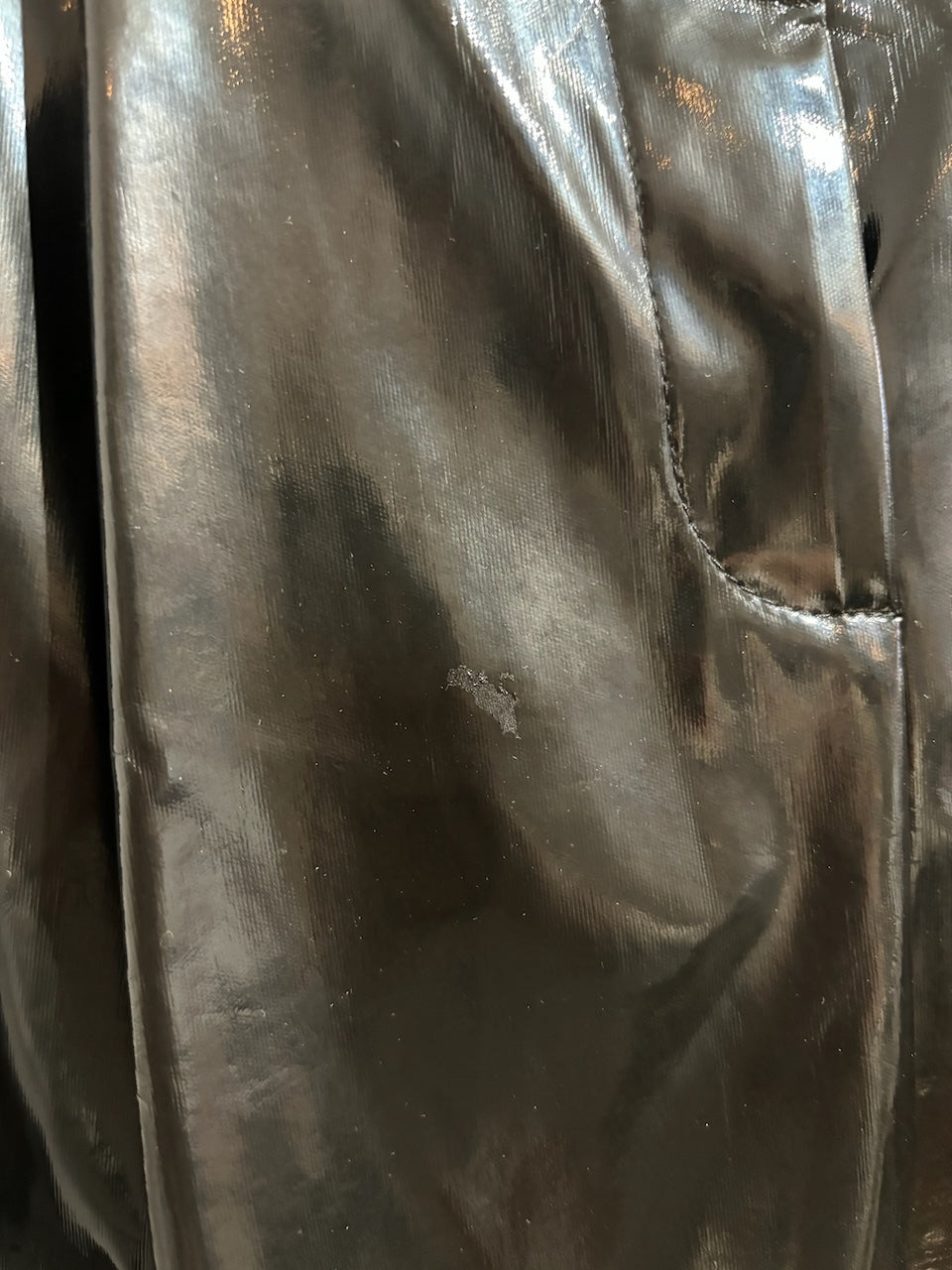 Pantalon en similicuir noir avec fermeture avant, poches latérales et poches arrière. Coupe large et droite. Taille haute.