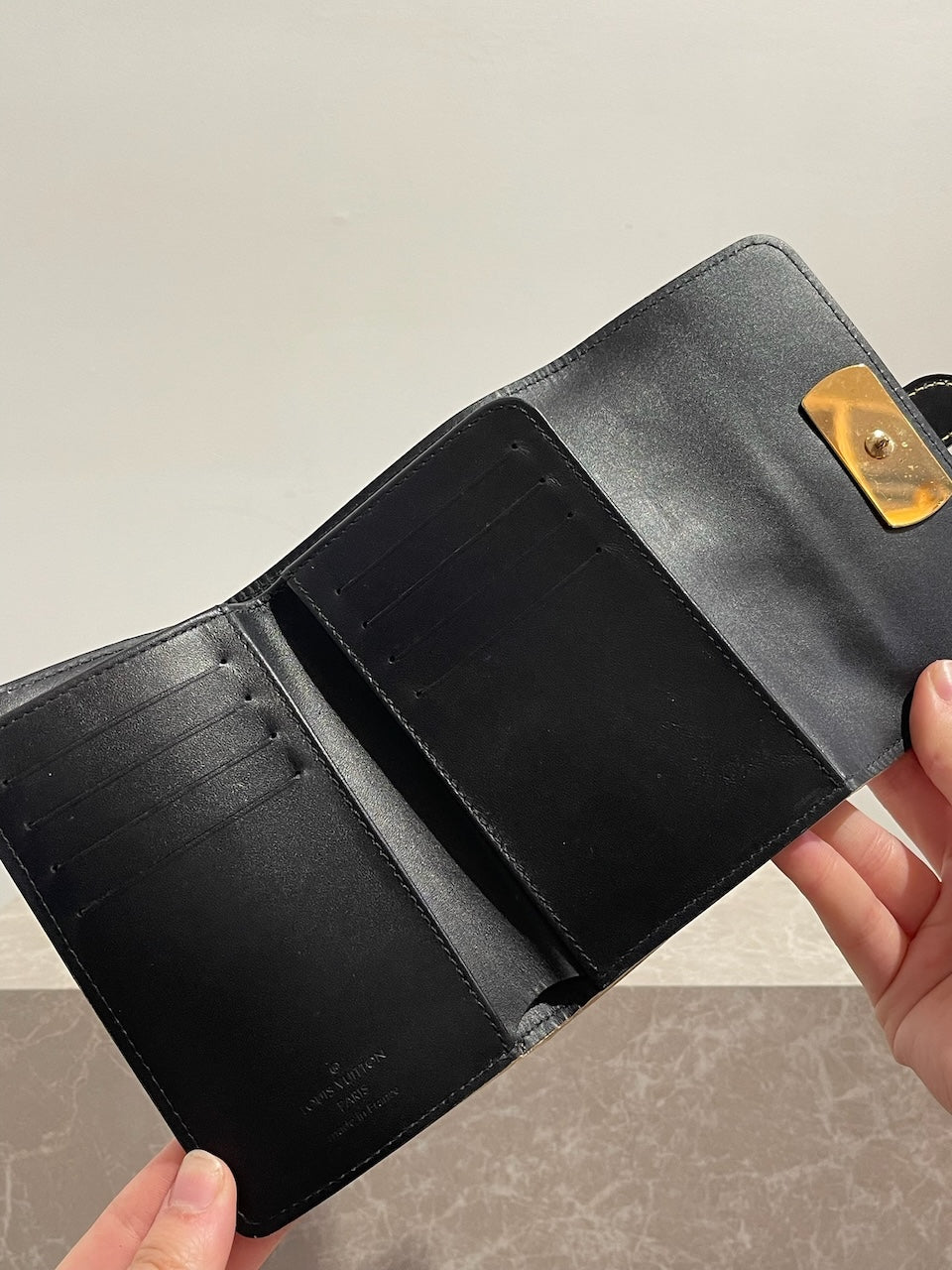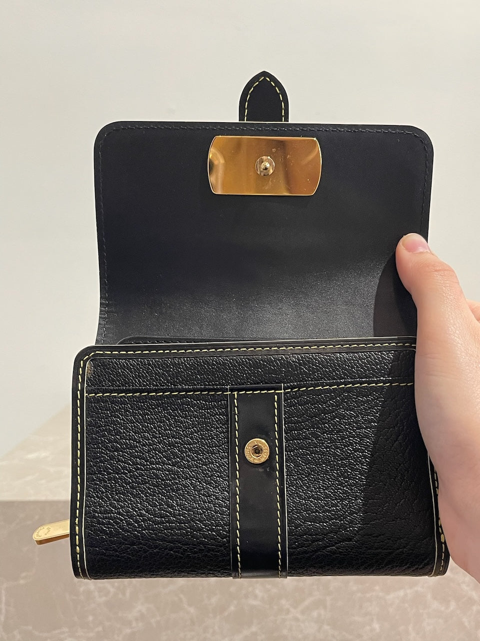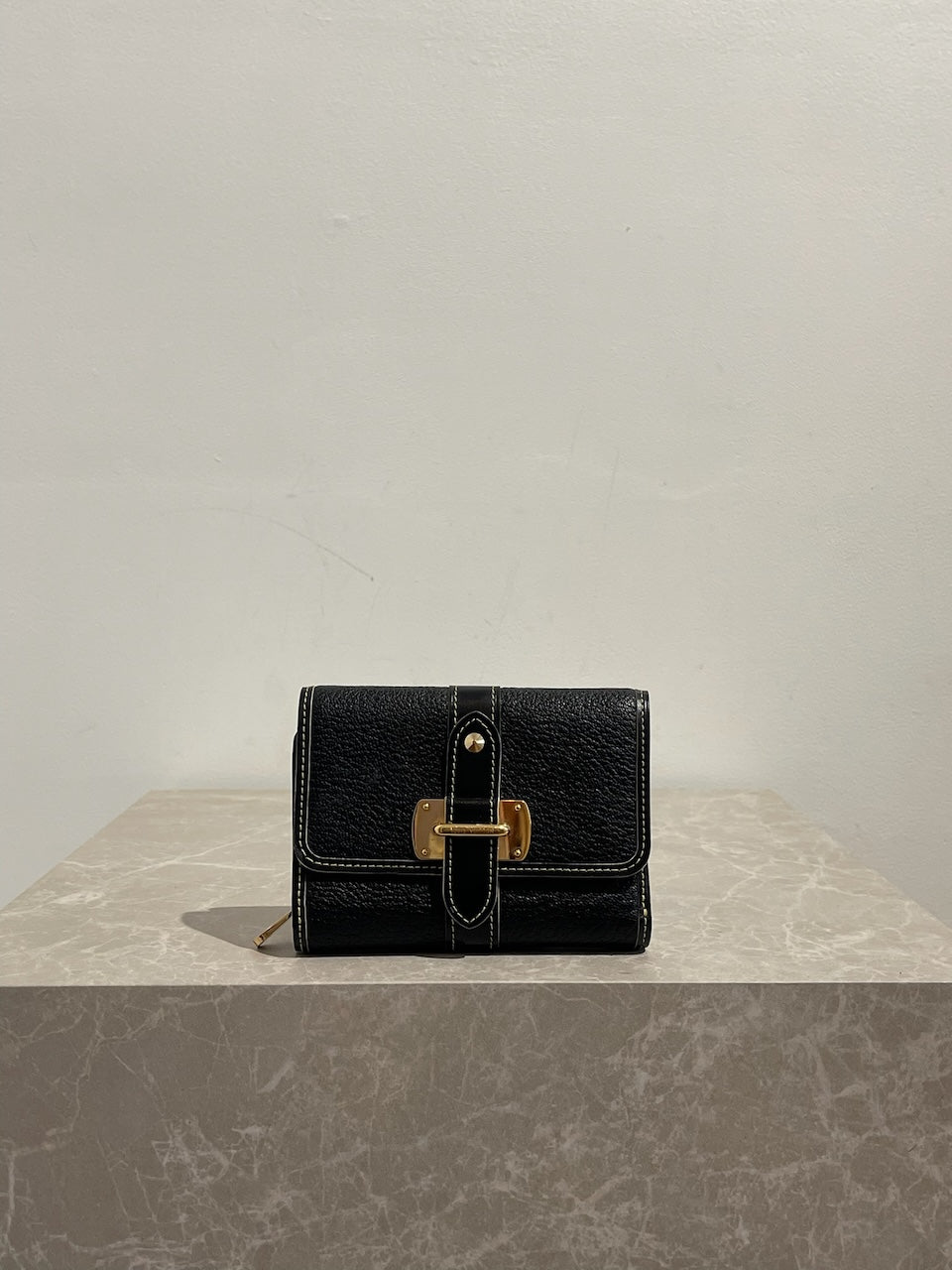 Portefeuille en cuir noir avec surpiqûres contrastantes et fermeture par bouton-pression signée Louis Vuitton. Poche arrière zippée. Compartiments intérieurs pour cartes et papiers. Bijouterie dorée.