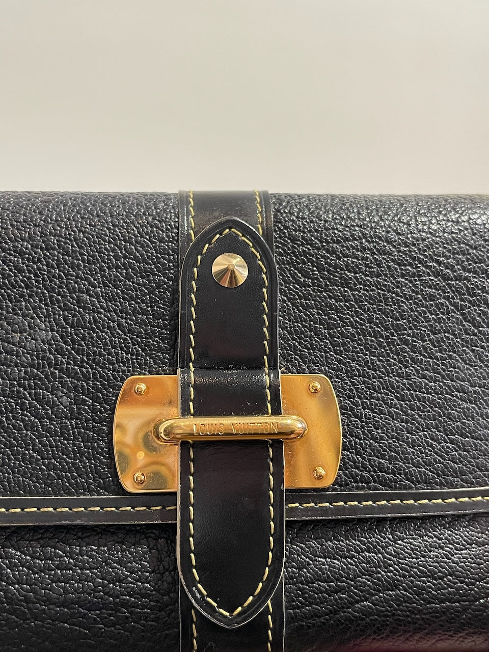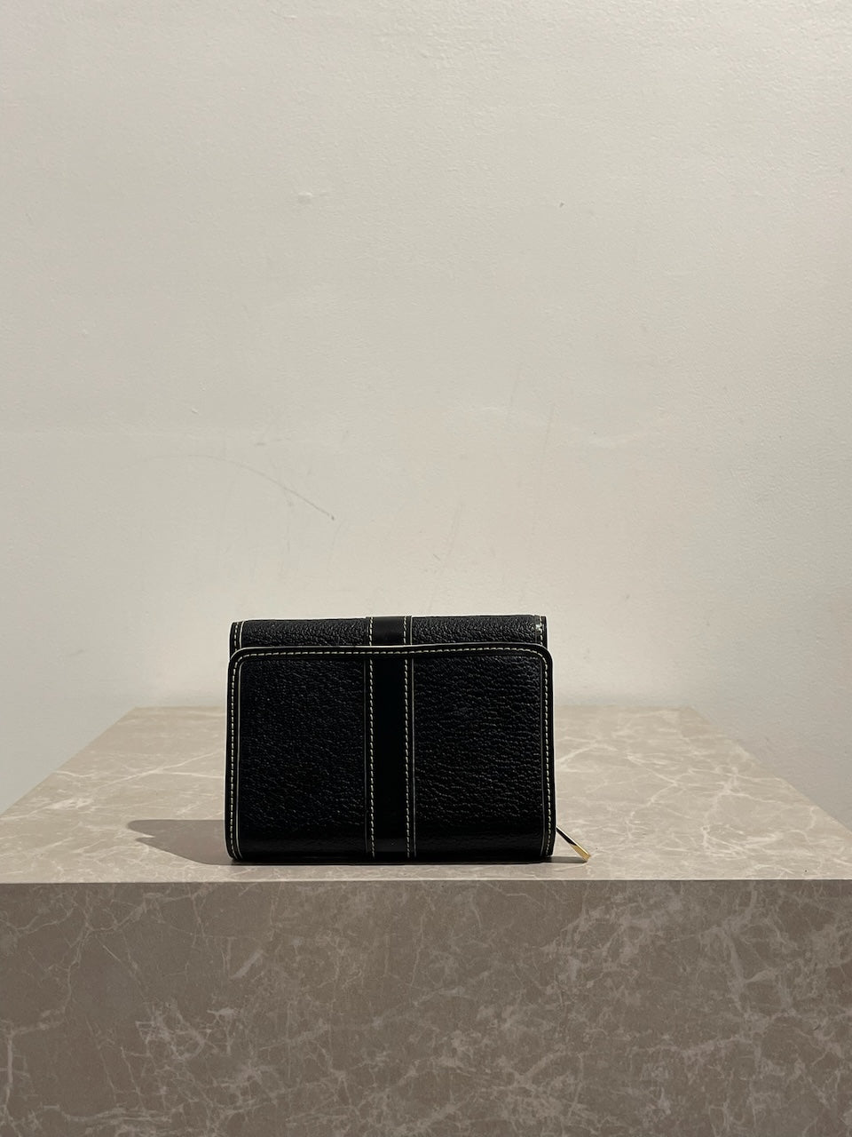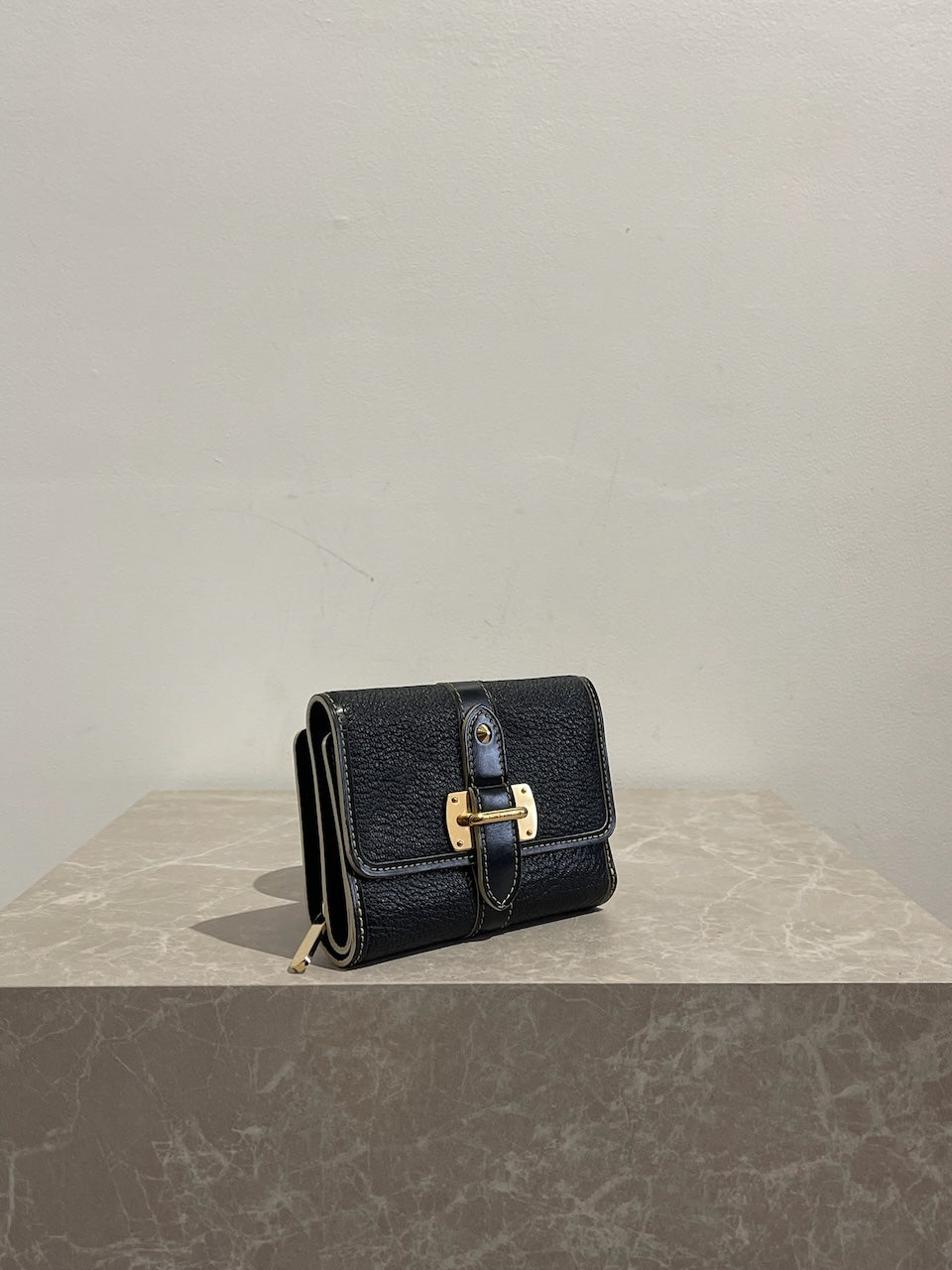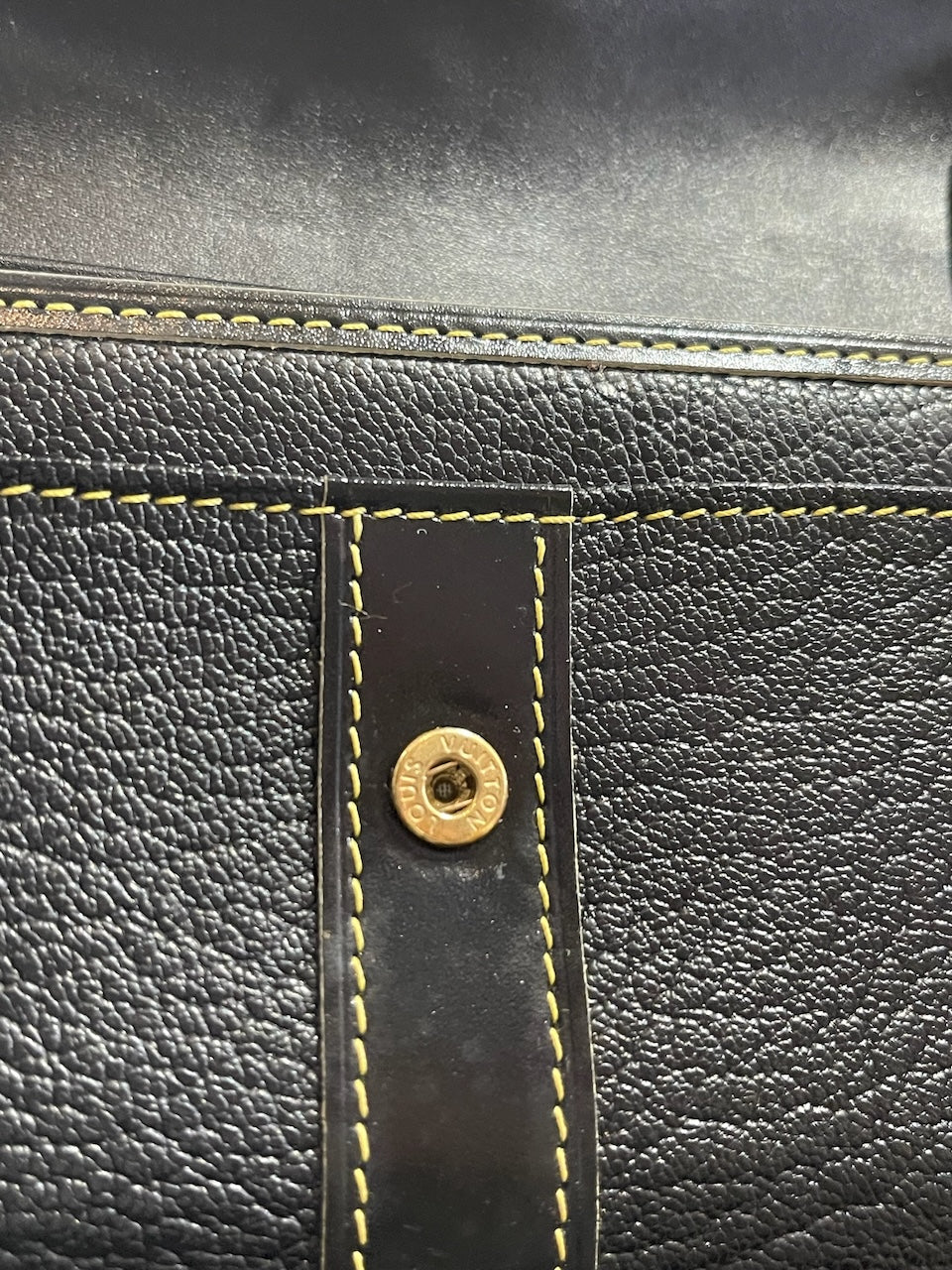 Portefeuille en cuir noir avec surpiqûres contrastantes et fermeture par bouton-pression signée Louis Vuitton. Poche arrière zippée. Compartiments intérieurs pour cartes et papiers. Bijouterie dorée.