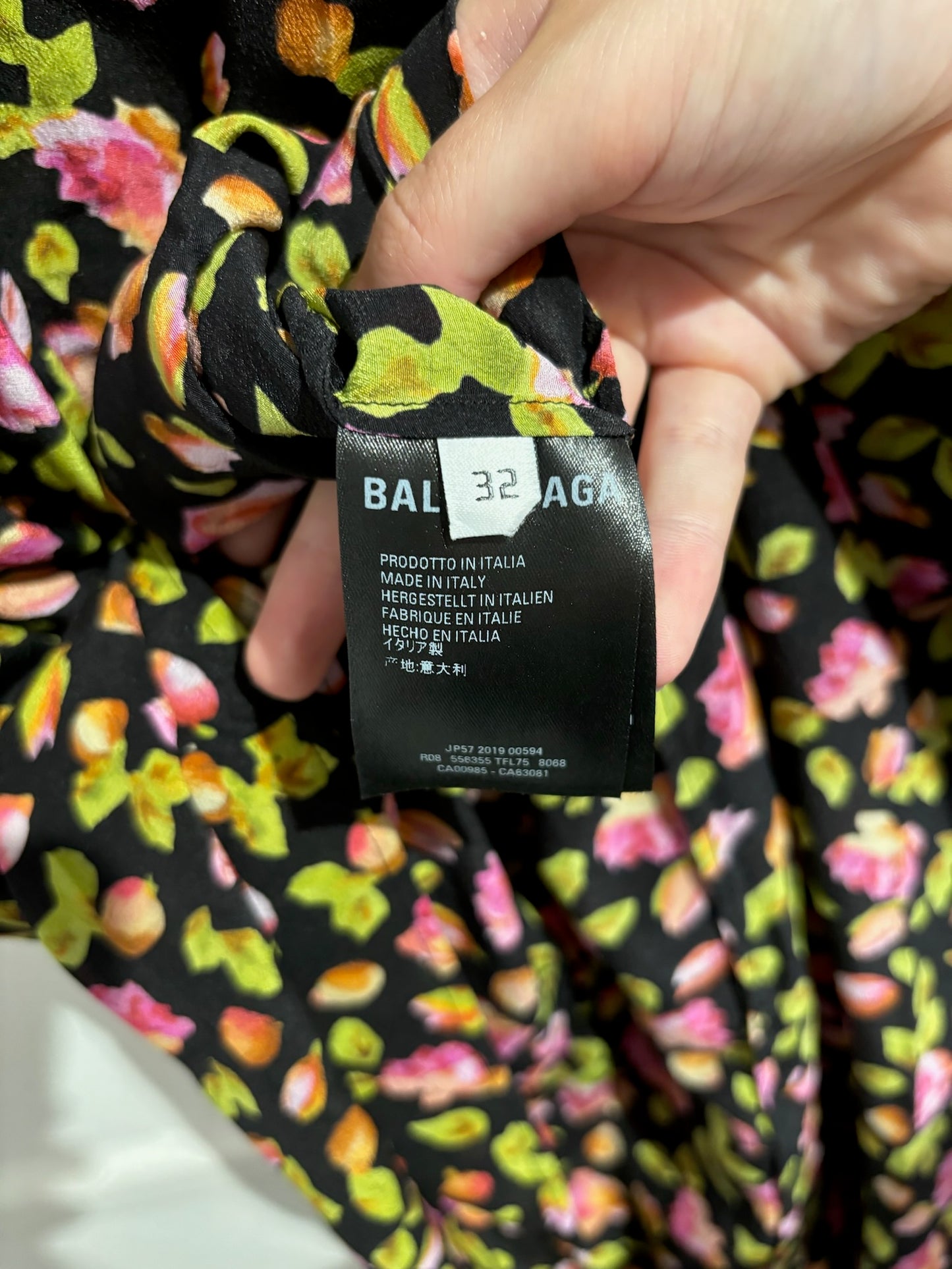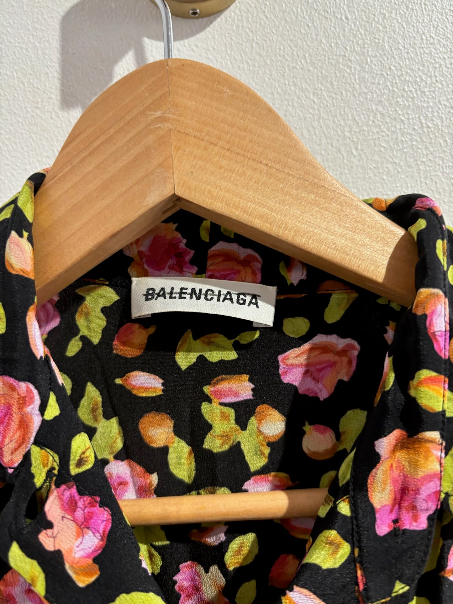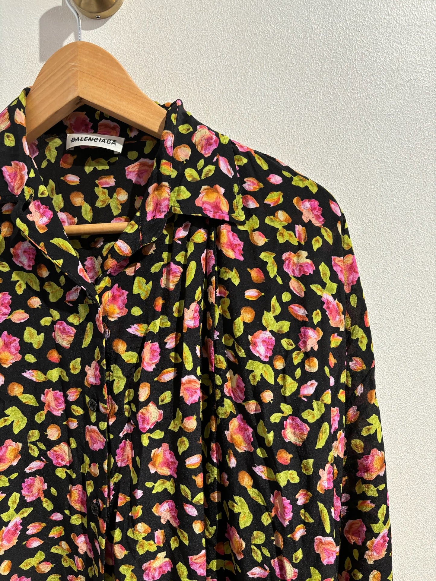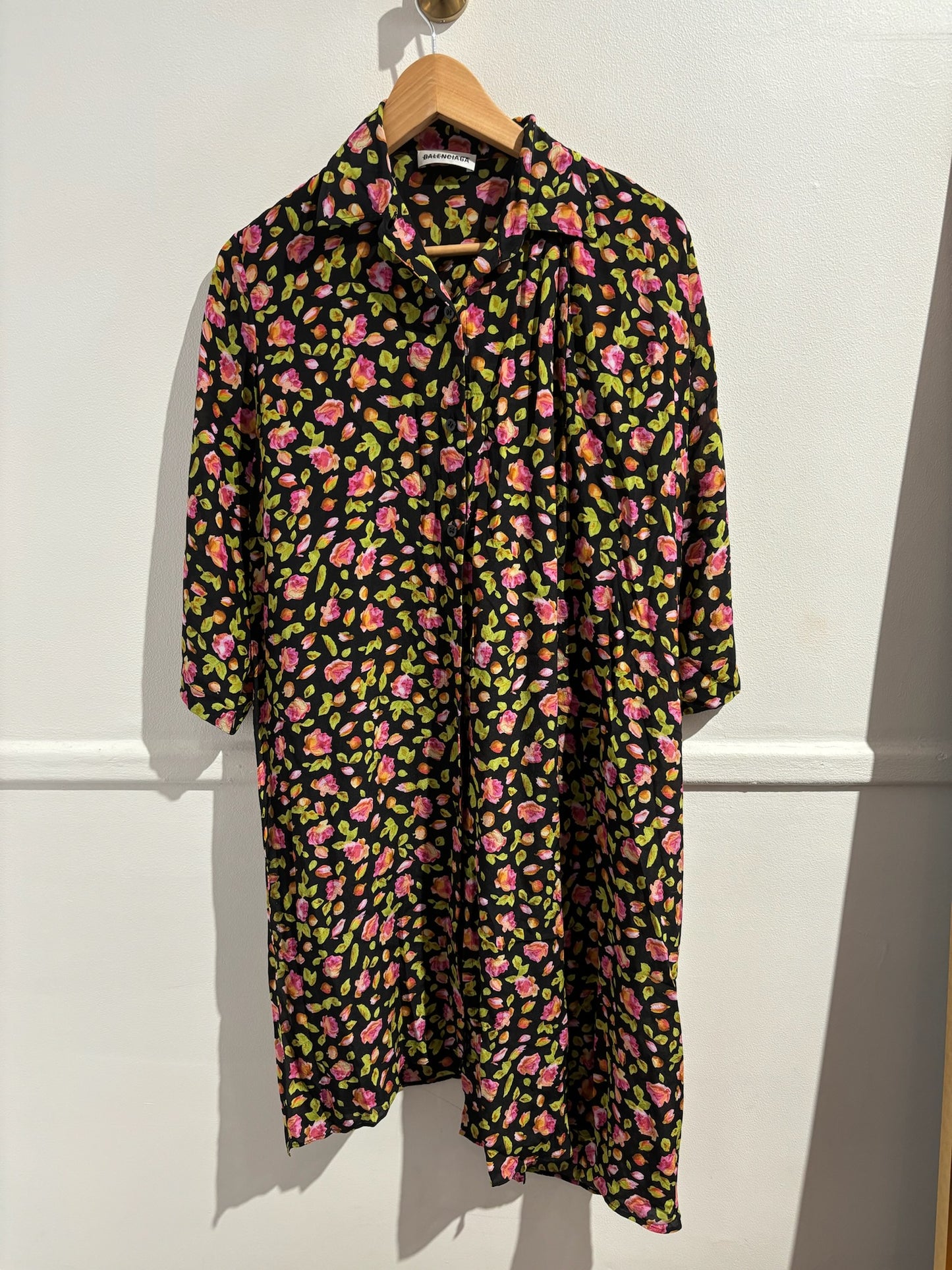 Robe mi-longue en soie noire à motif à fleurs rose et verte. Robe chemise à fermeture boutonnée asymétrique, manches trois-quarts et ourlet asymétrique. Coupe oversize et fluide.