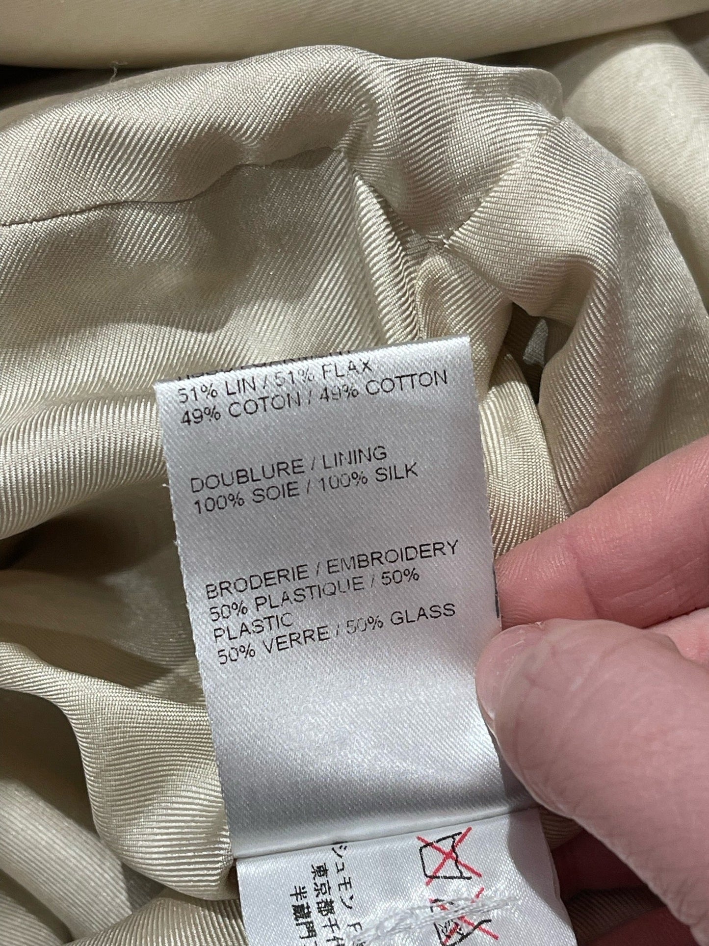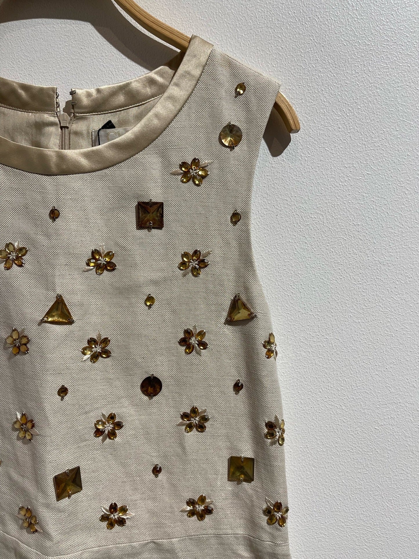 Robe courte en lin et coton beige orné de bijoux sur le haut. Détails en satin beige. Fermeture zip au dos.