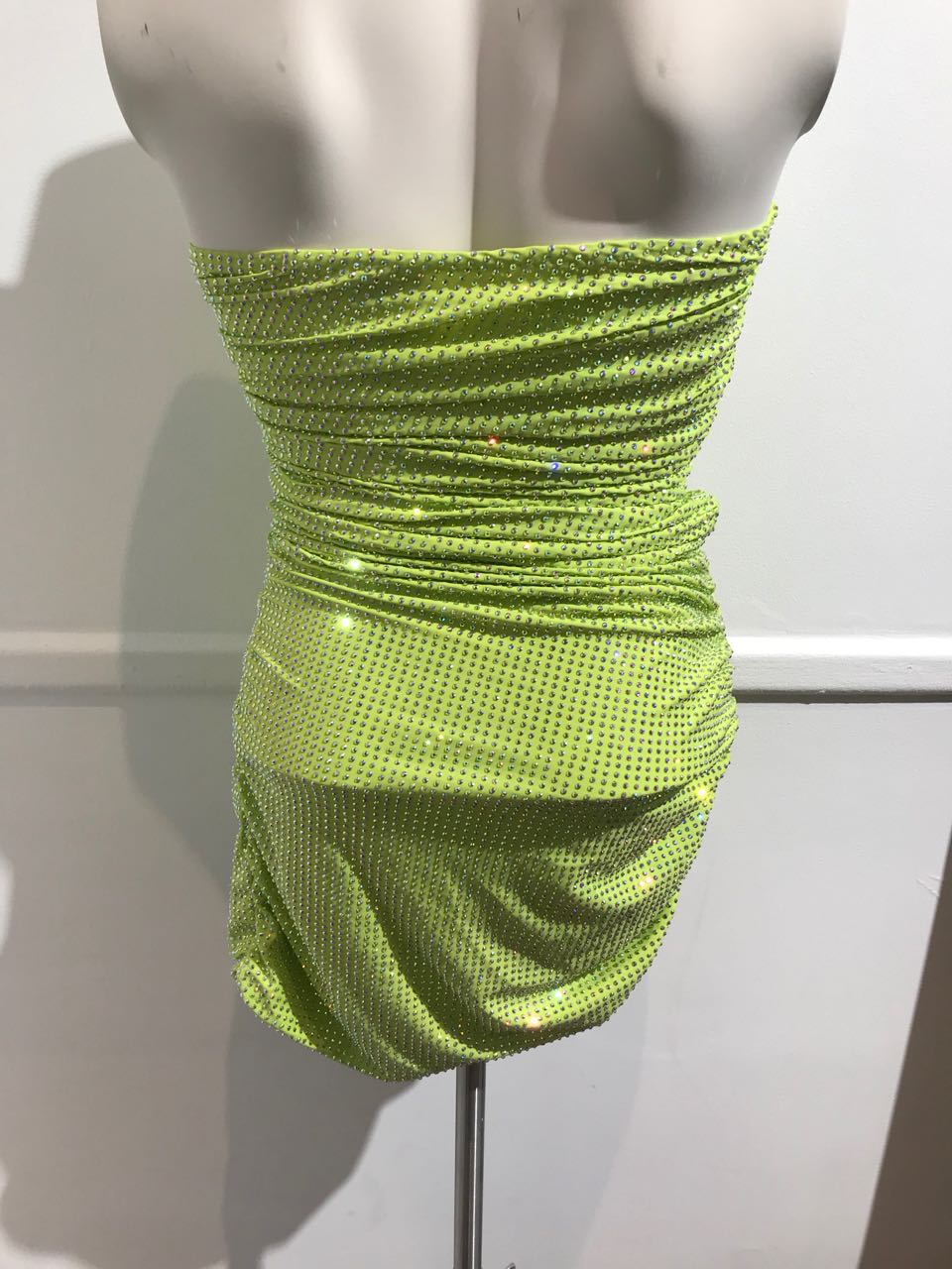 Robe bustier forme tube près du corps coloris vert recouvert de cristaux. Robe courte avec fronces sur les cotés.