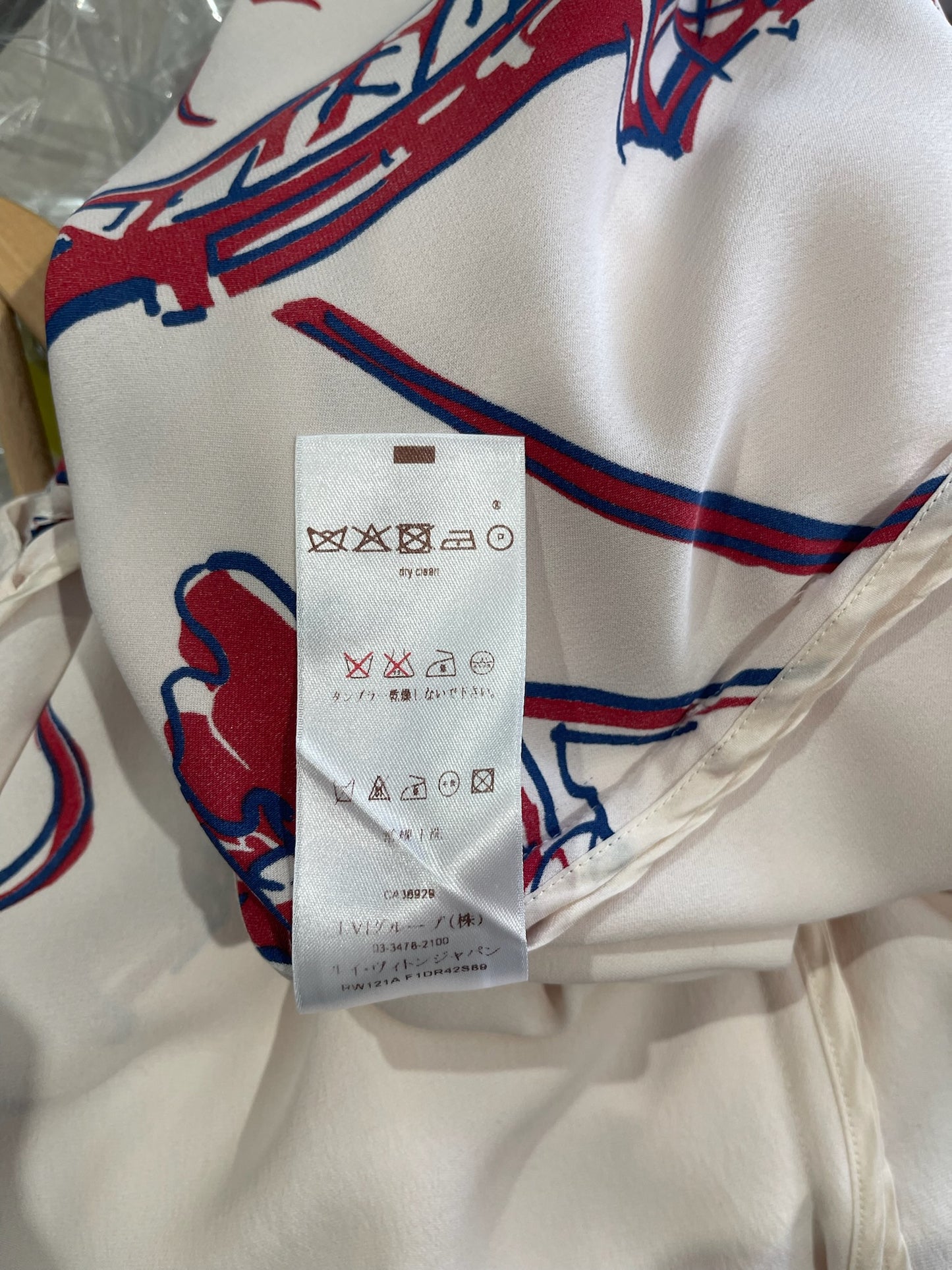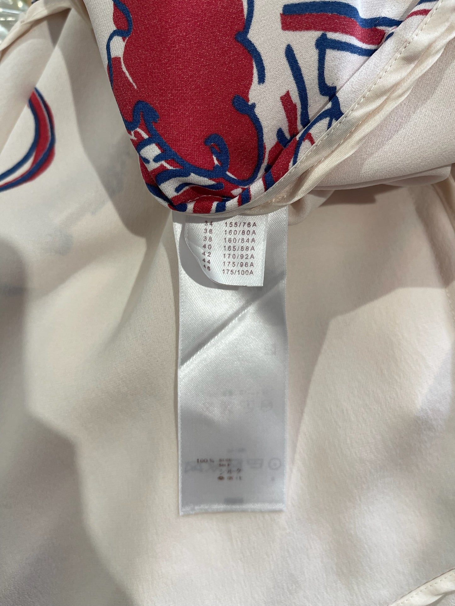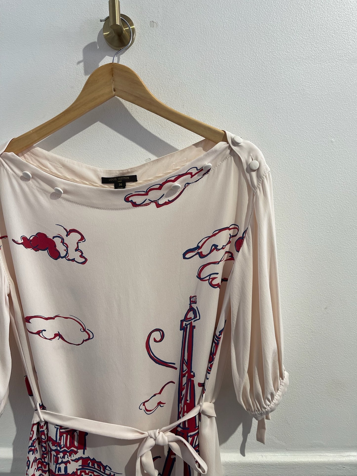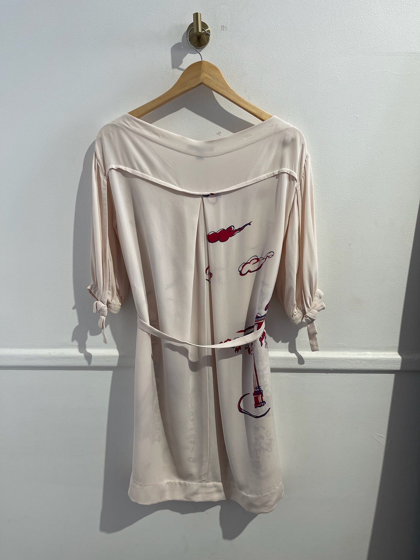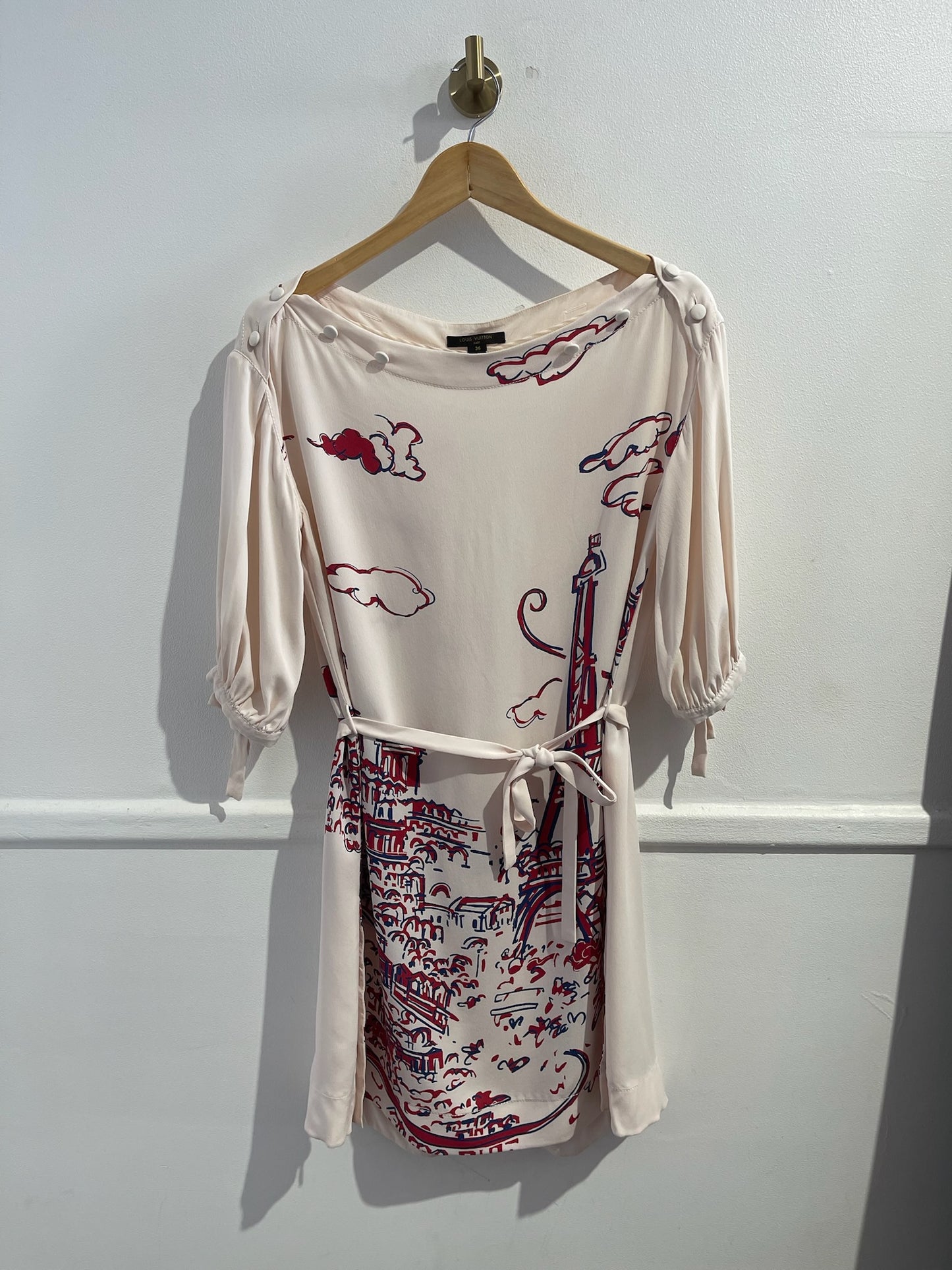 Robe en soie rose pâle ornée de motifs rouge et bleu représentant Paris. Encolure bateau avec boutons recouverts ton sur ton sur les épaules. Manches trois-quarts légèrement bouffantes, resserrées par un lien noué aux poignets. Ceinture à nouer assortie à la taille. Fentes boutonnées sur les côtés.