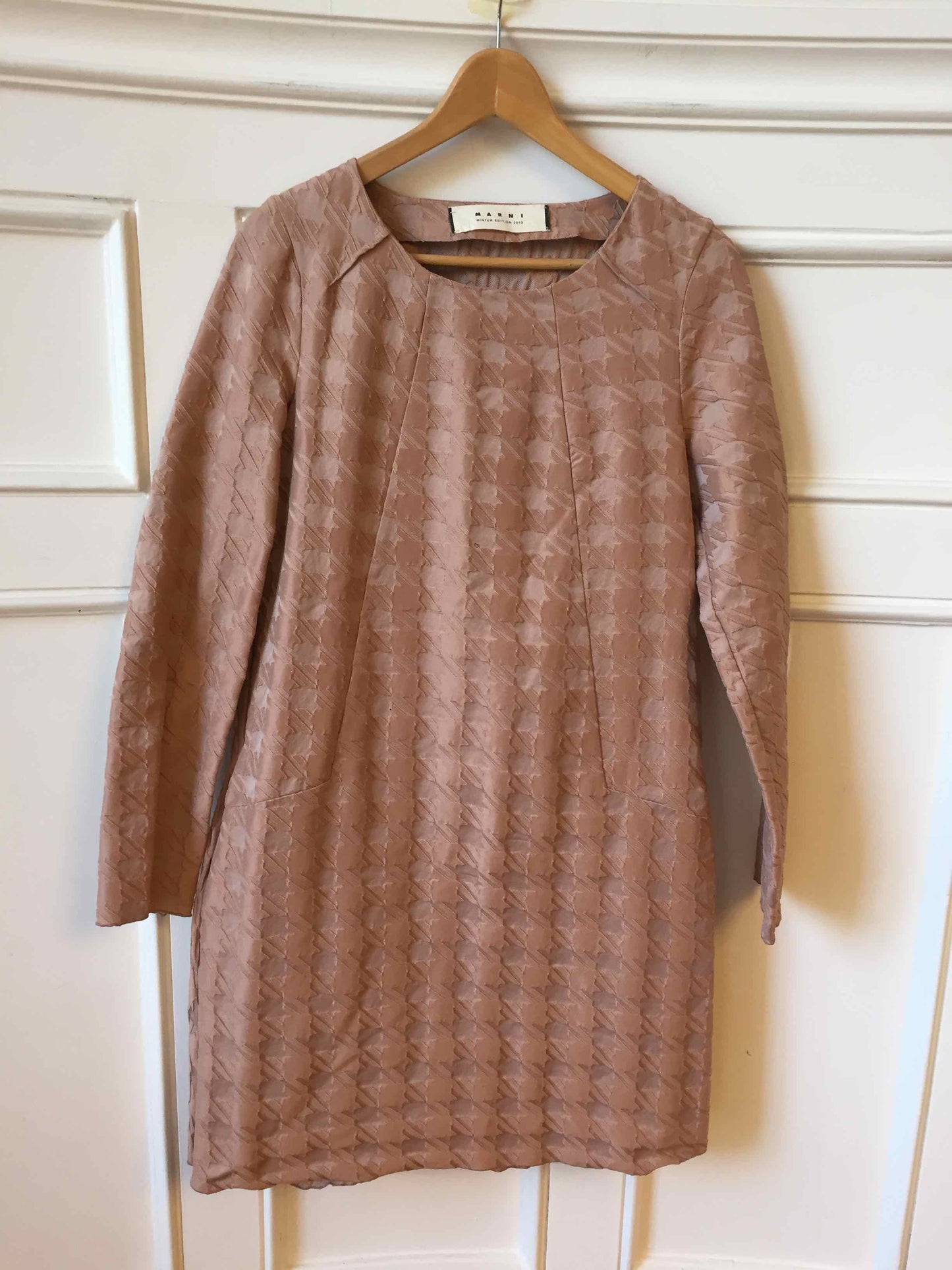 Robe courte en tissu imprimé pied de poule couleur vieux rose.
