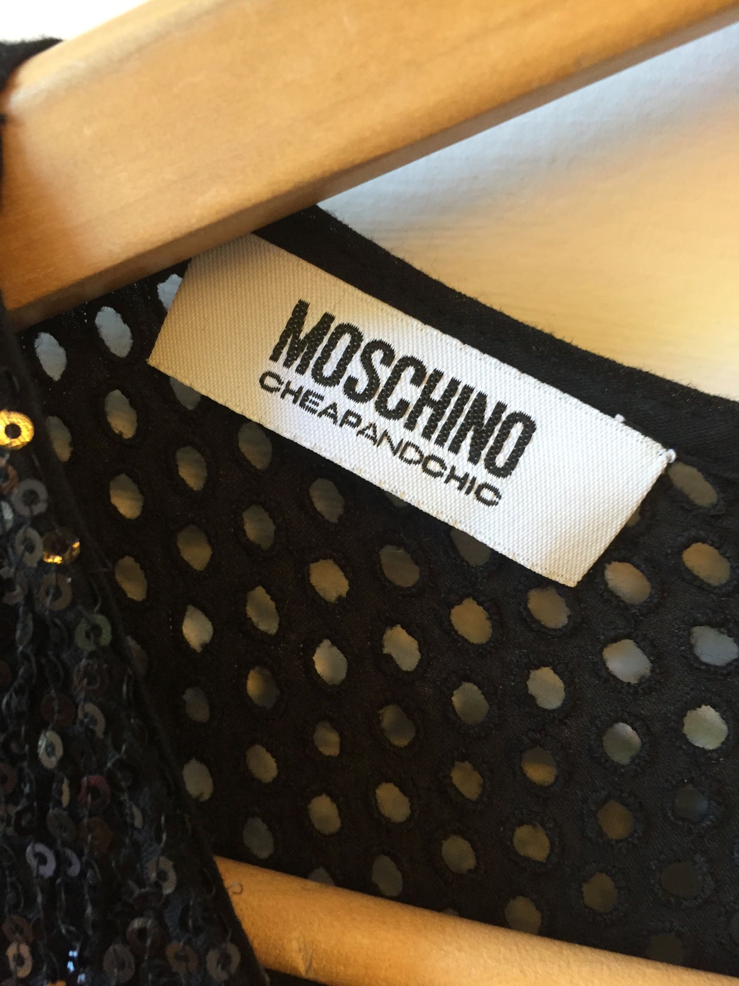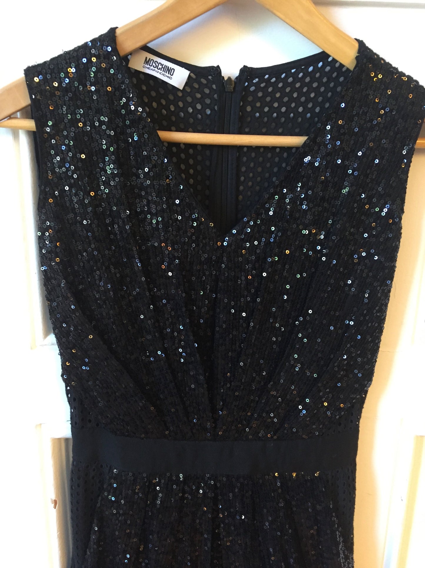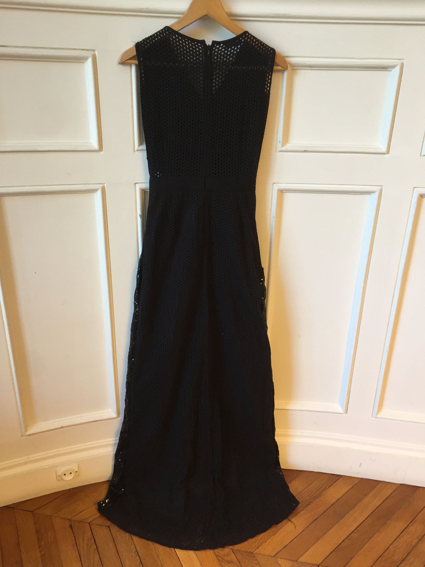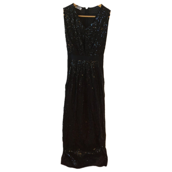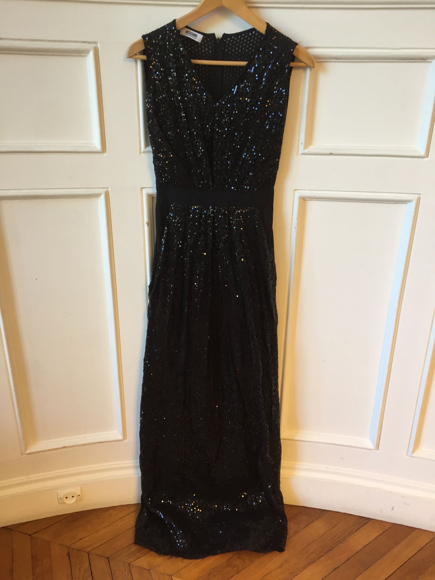 Robe longue en sequins noir sur le devant et coton noir au dos.