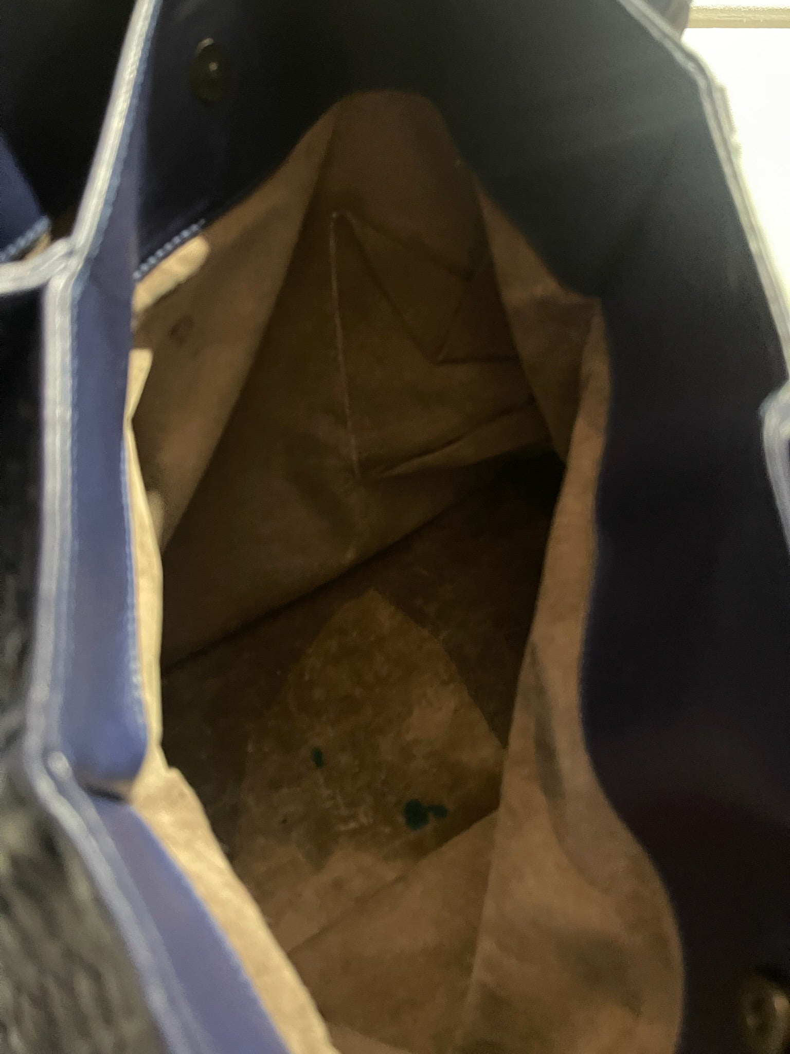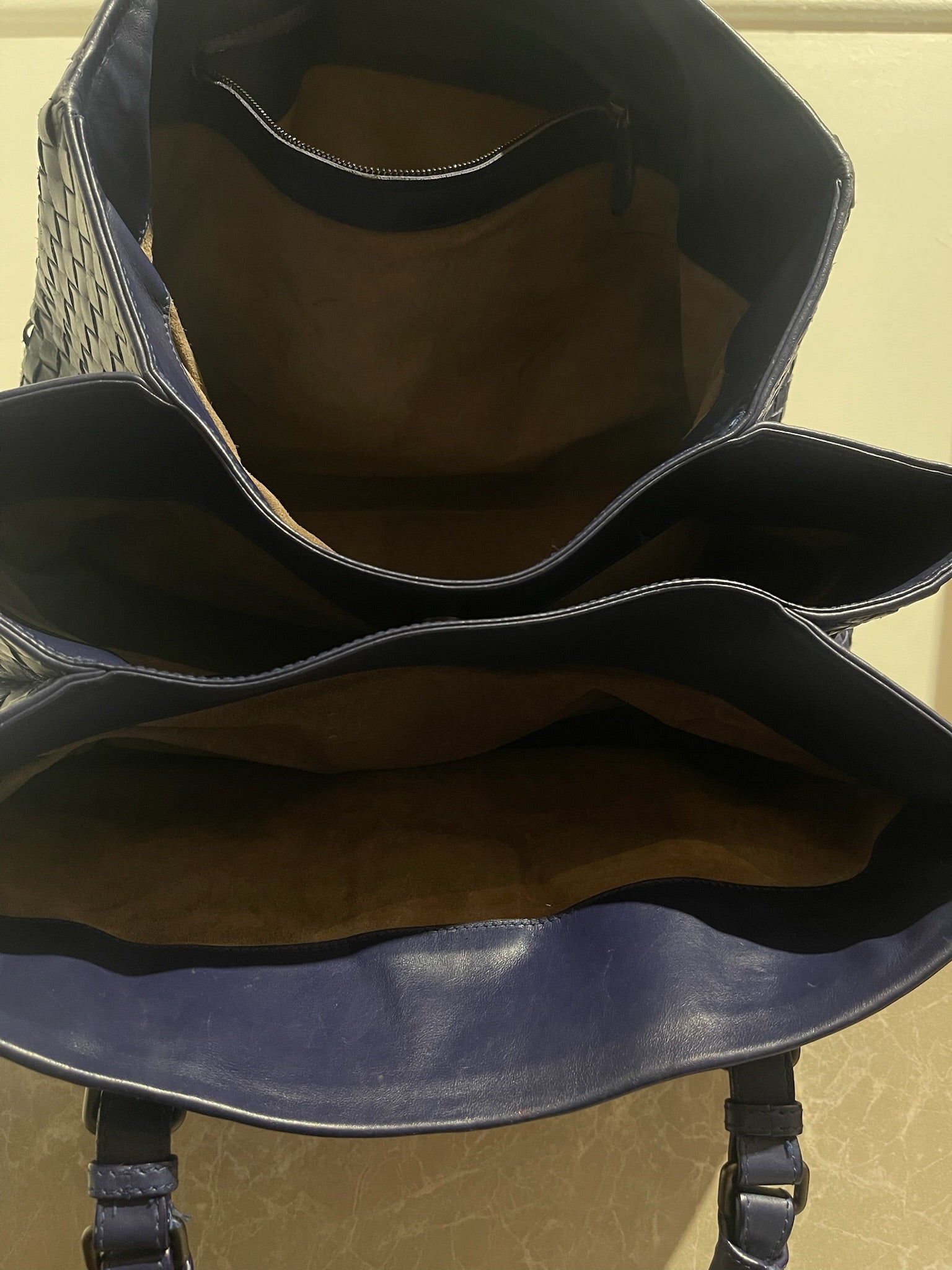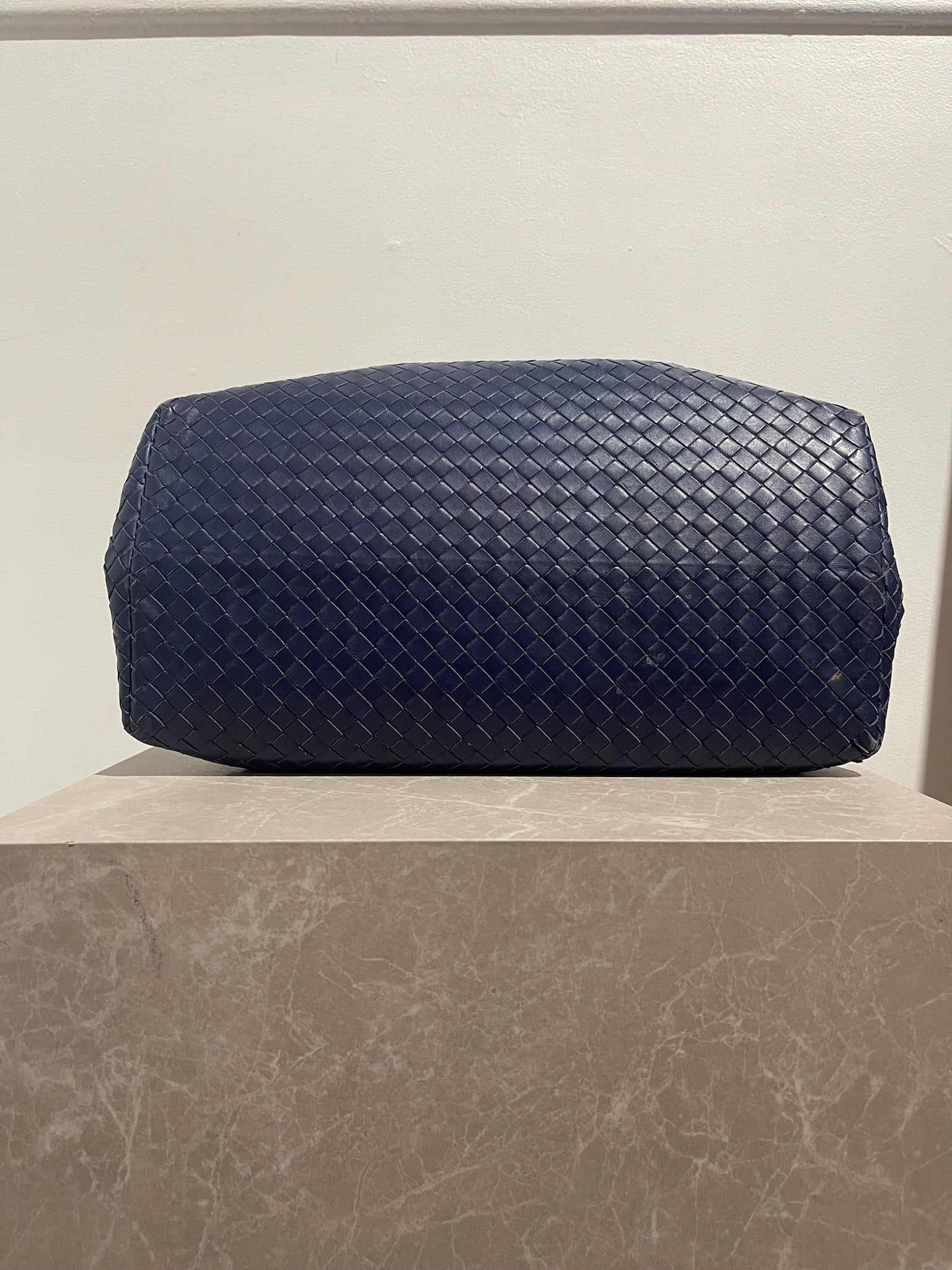 Sac à main en cuir intrecciato nappa bleu marine avec double anse réglable pour un porté main ou épaule. Fermeture par clip en métal gris. Grande contenance interne avec 3 compartiments et poche zippée.