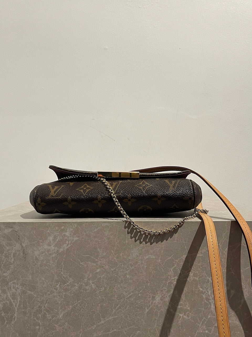 Sac à bandoulière en toile monogram marron avec garnitures en cuir naturel, fermeture à rabat aimantée ornée d'une plaque en métal signée Louis Vuitton. Chainette décorative à l'avant et bandoulière fine amovible en cuir. Poche intérieure plate.