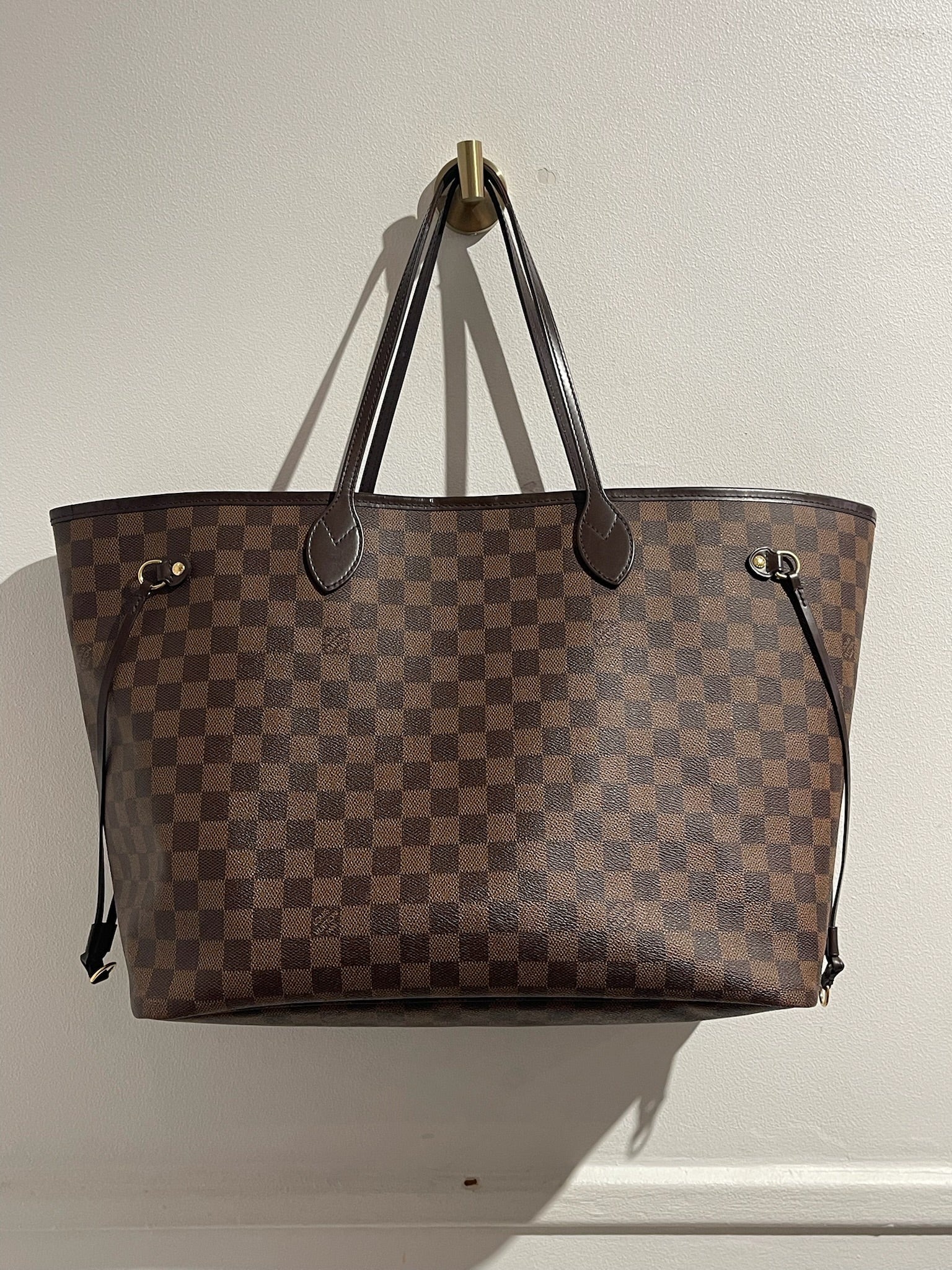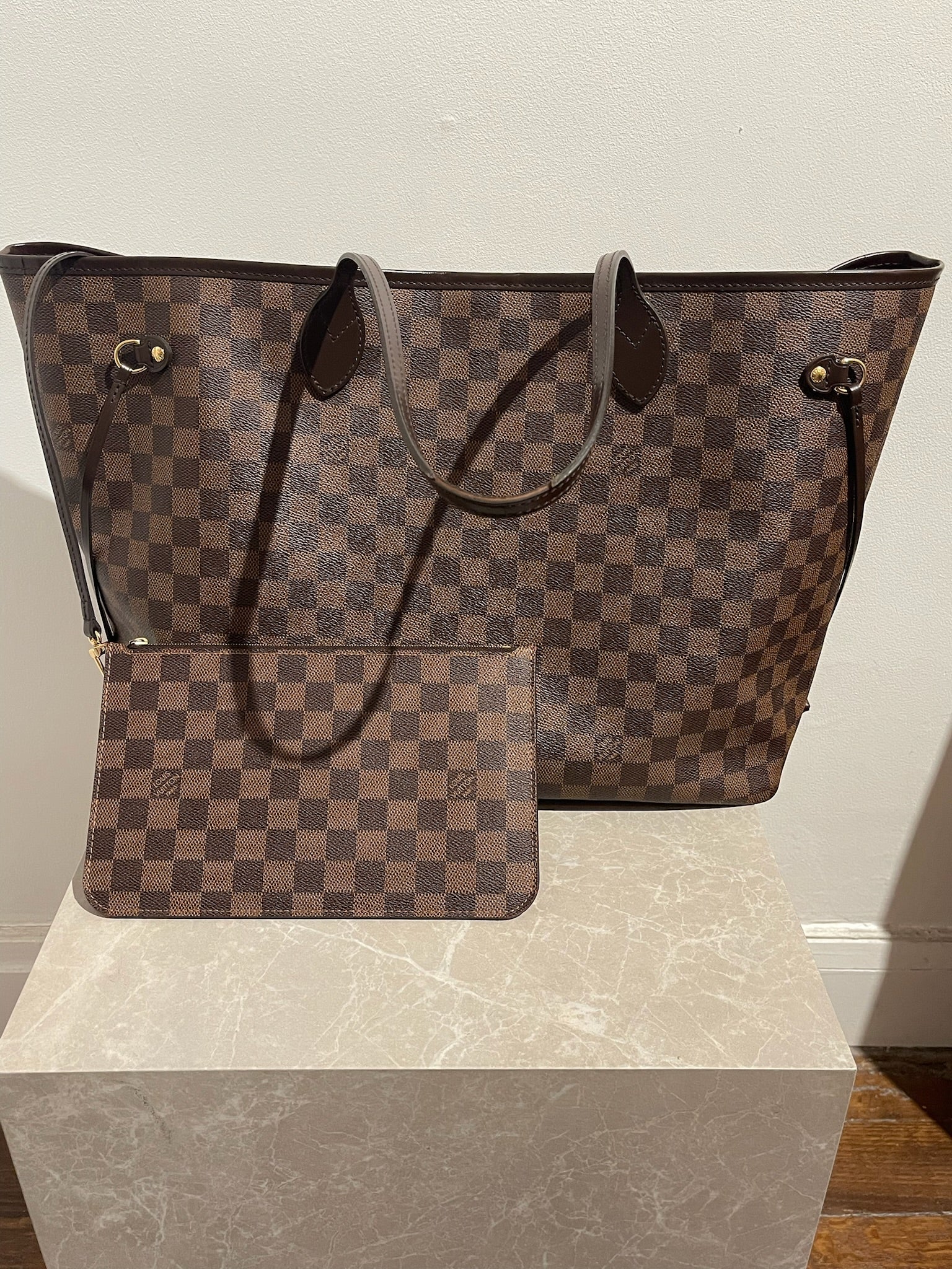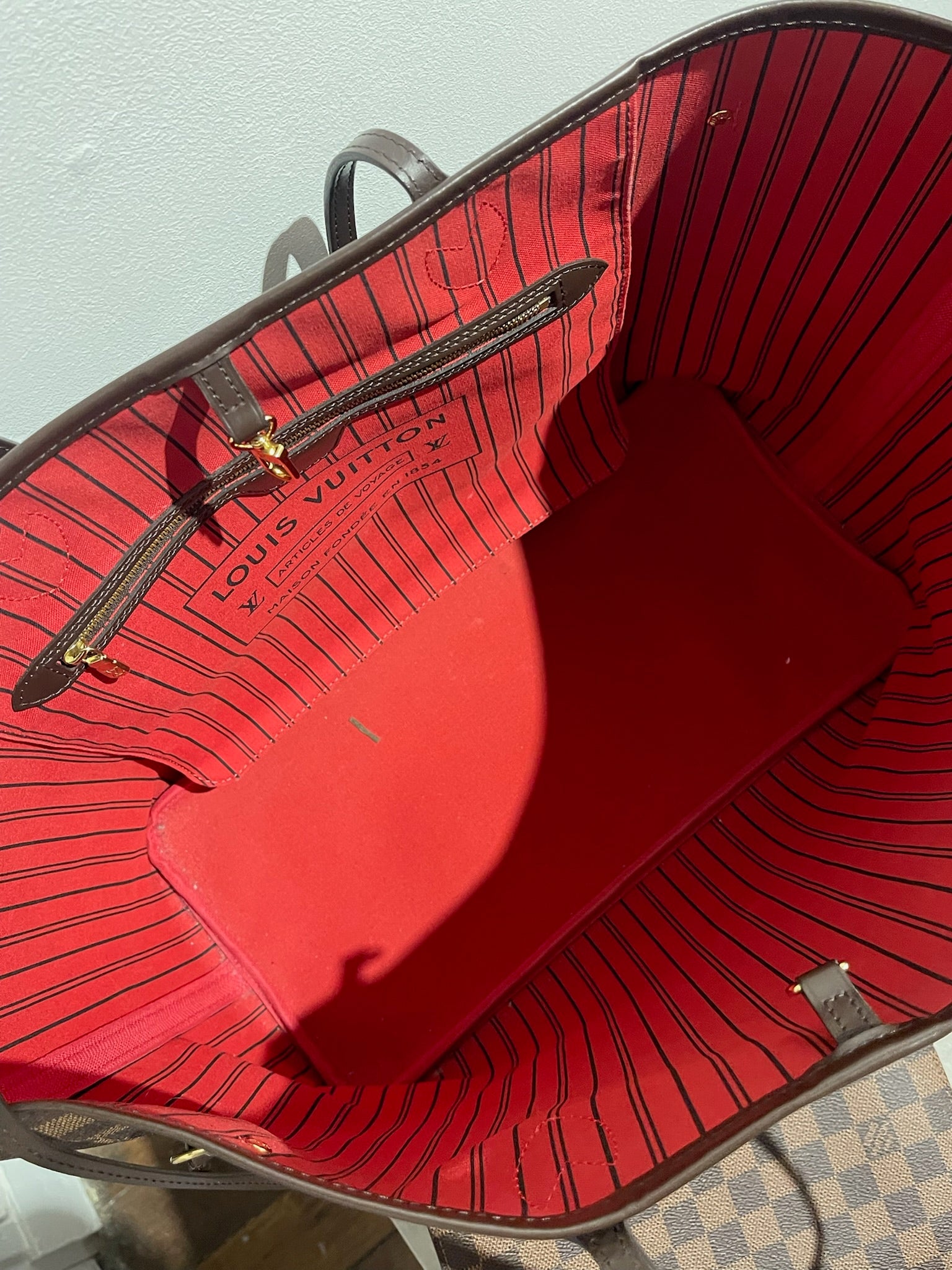 Sac à main en toile damier ébène marron avec garnitures en cuir. Porté épaule ou main grâce à ses deux anses supérieures. Intérieure en toile rouge cherry rayé, poche plaquée zippée. Pochette zippée amovible au sac. Bijouterie dorée. Fermeture avec crochet hameçon signé LV.