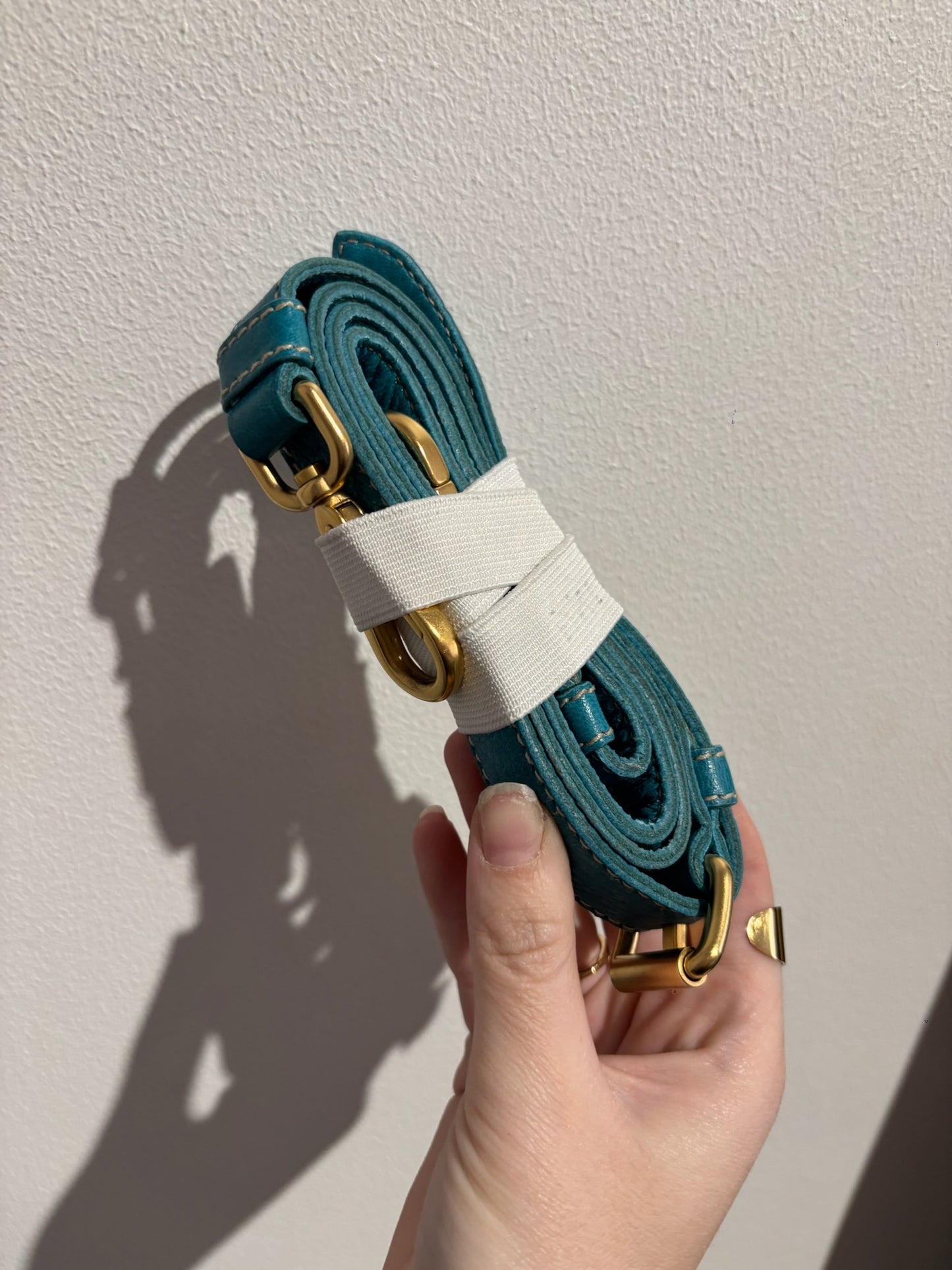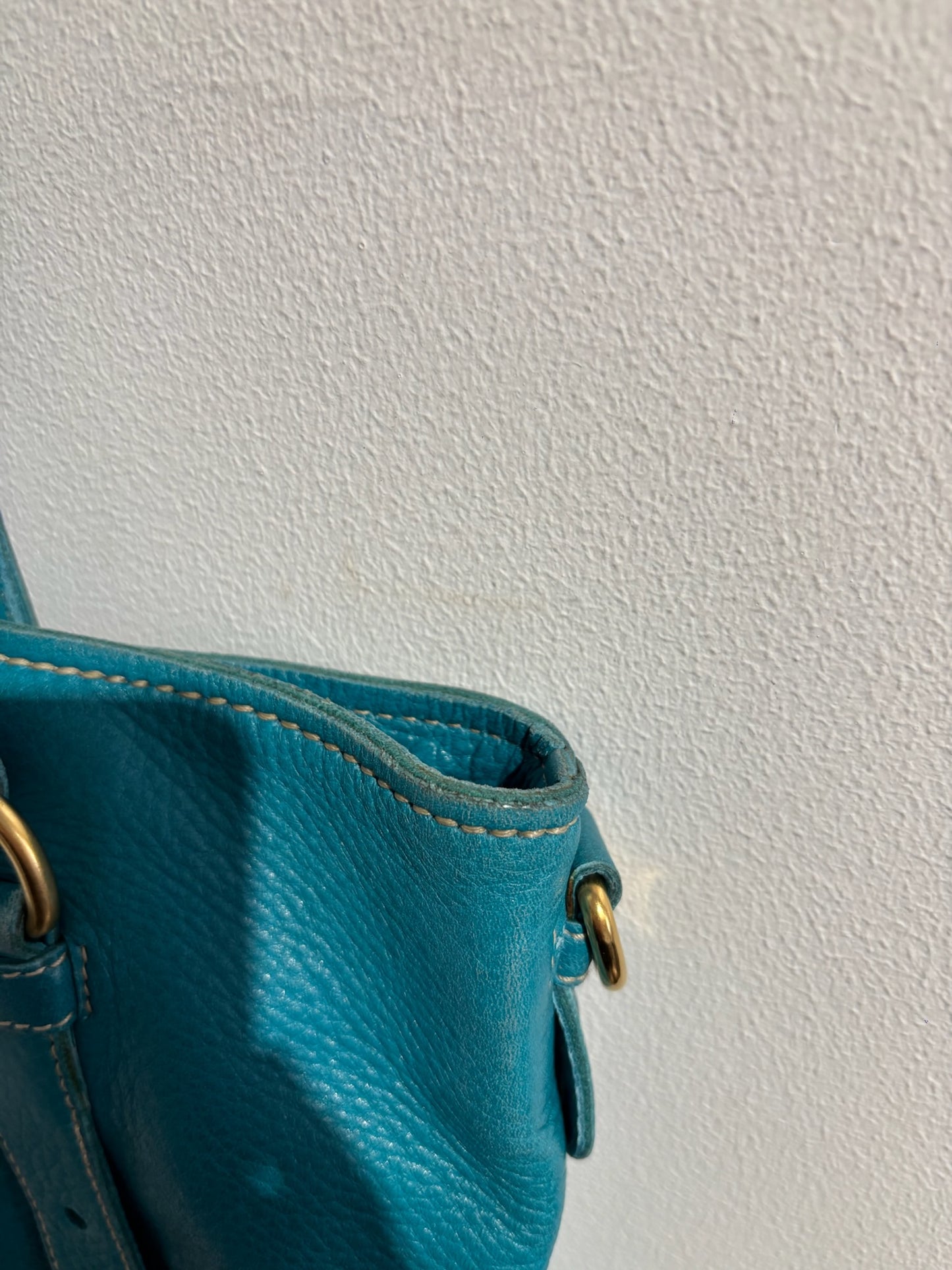 Sac en cuir bleu turquoise, forme rectangle avec anse pour un porté main ou épaule et détails de boucles . Logo Prada embossé à l'avant. Finitions en métal doré. Intérieur doublé avec une poche intérieure. Grande bandoulière ajustable et amovible.
