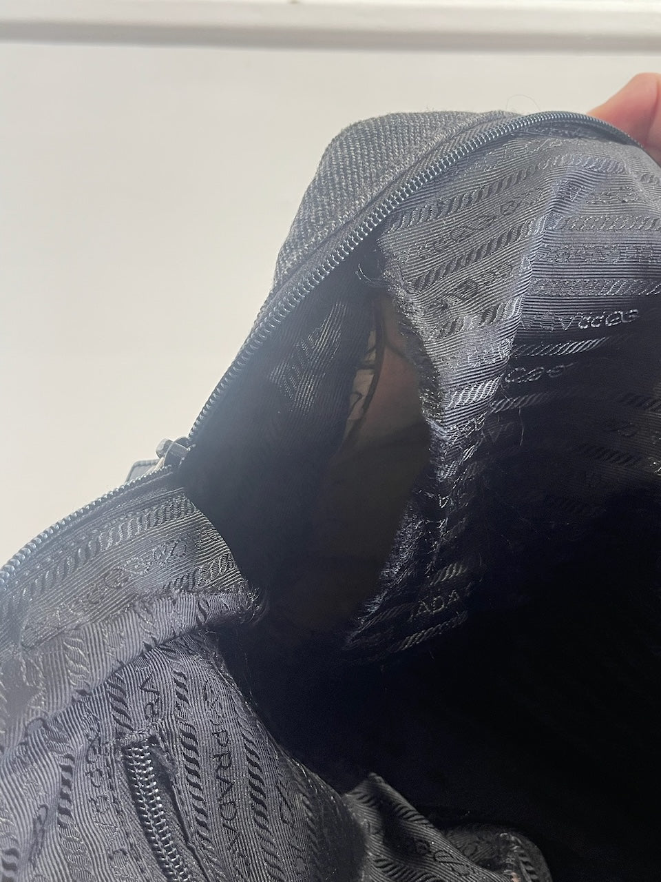 Sac à main en flanelle grise avec double anse sur le dessus et fermeture zippée avec cadenas. Logo triangle Prada sur le côté.