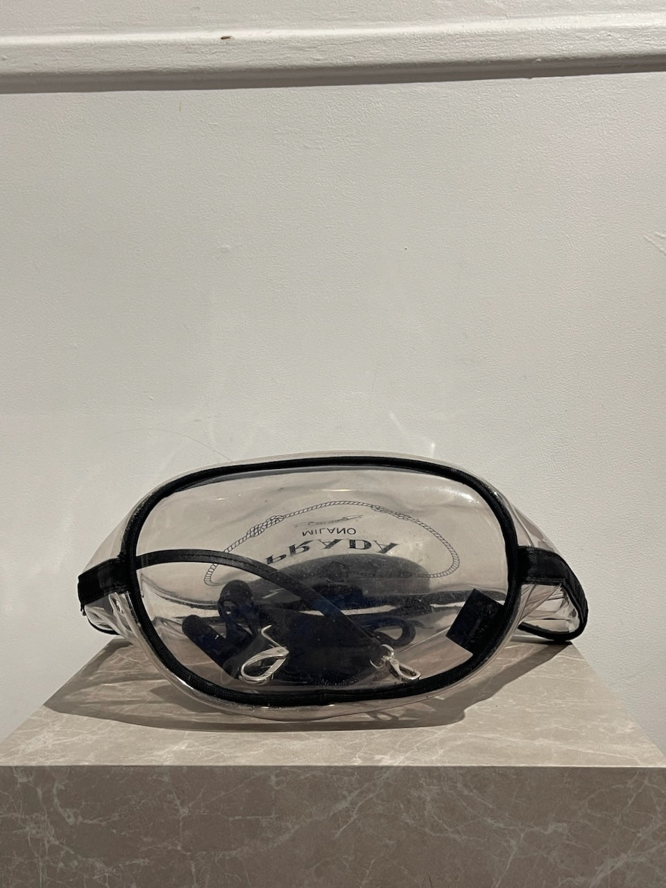 Sac à main en plexi signé Prada à l'avant. Garniture en denim noir. Bandoulière amovible et ajustable en toile noir.e Fermeture aimanté.