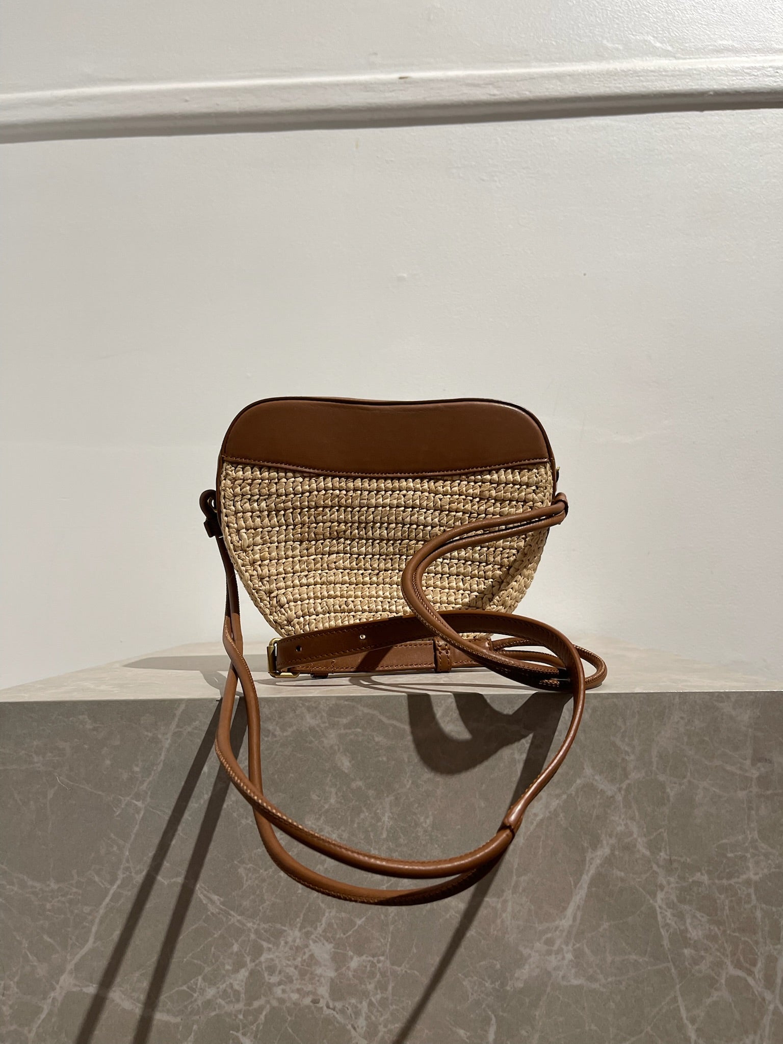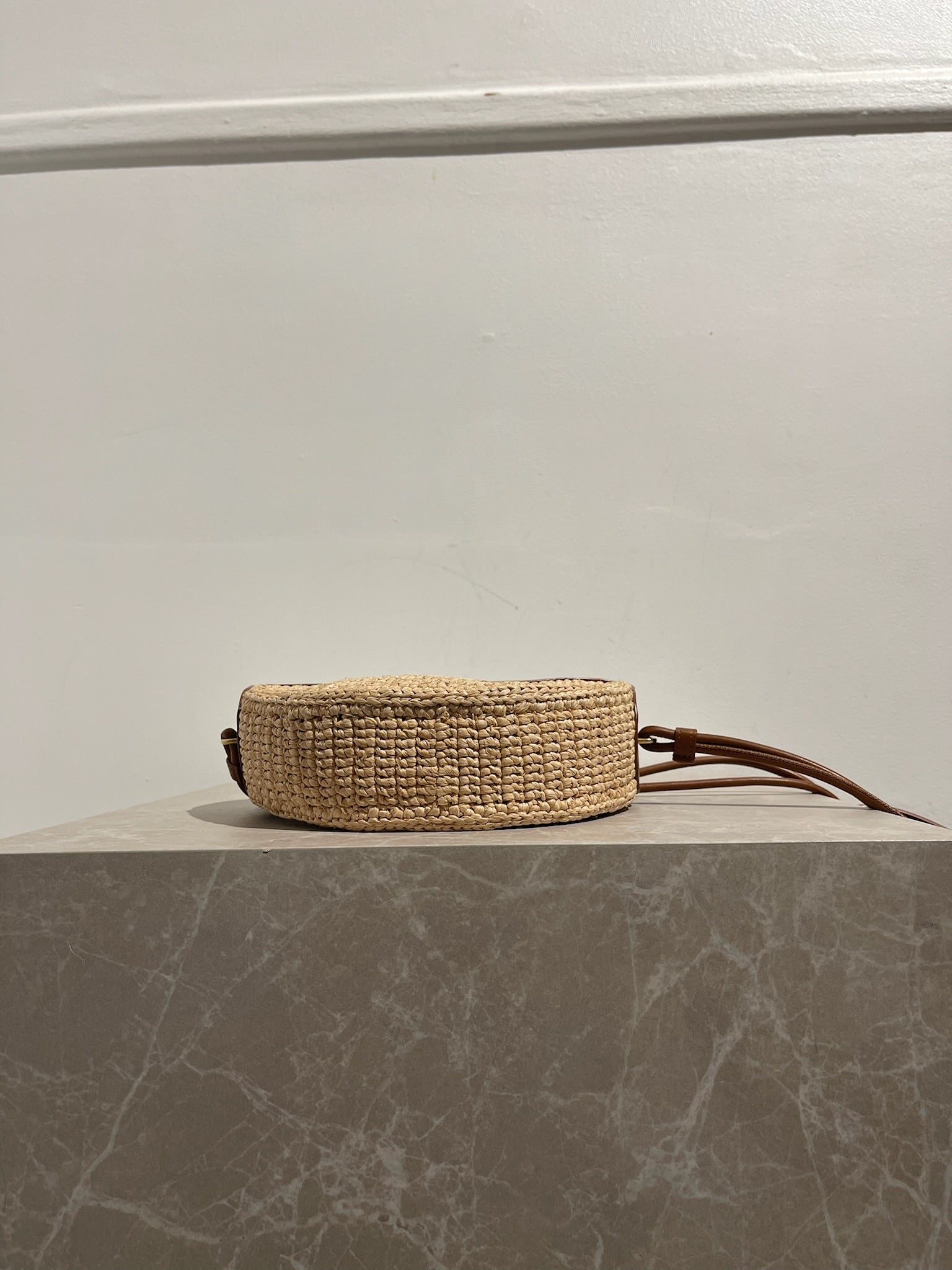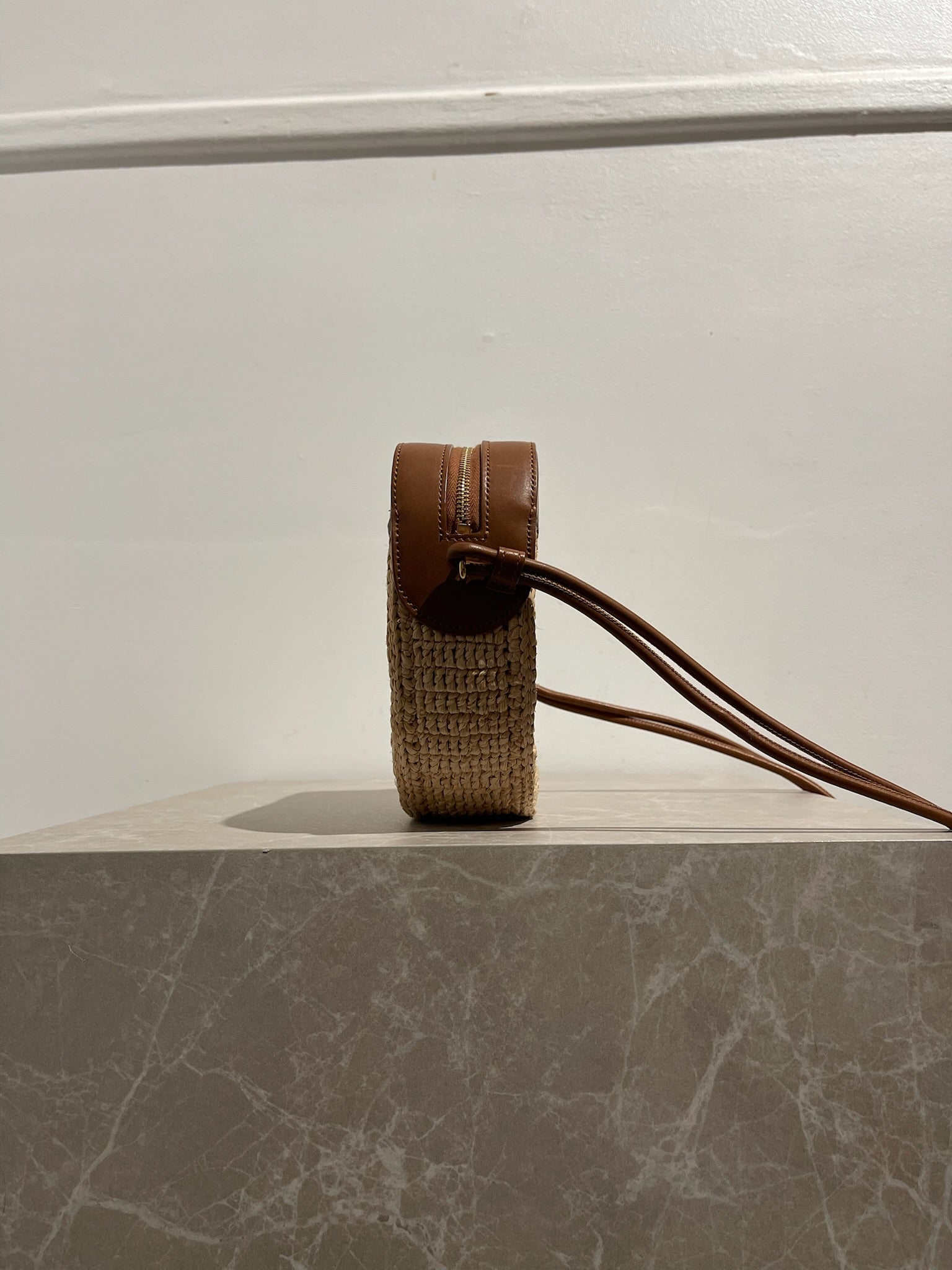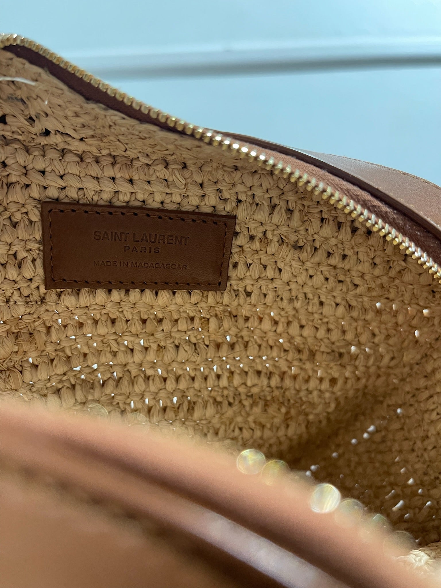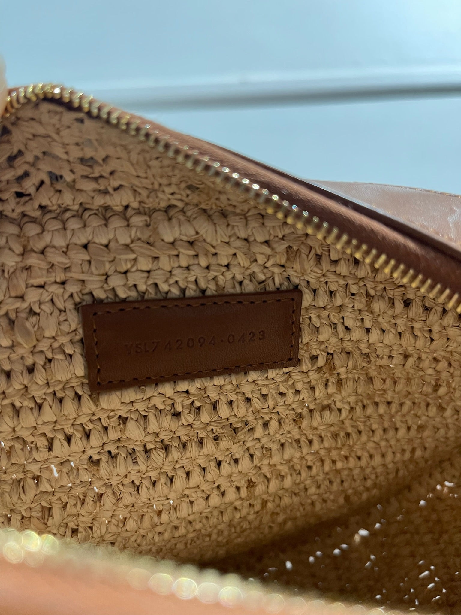 Sac en cuir camel et raphia naturel en forme de coeur avec le logo YSL à l'avant. Fermeture zippée et bandoulière en cuir réglable. Possibilité de le porter à l'épaule ou en crossbody.