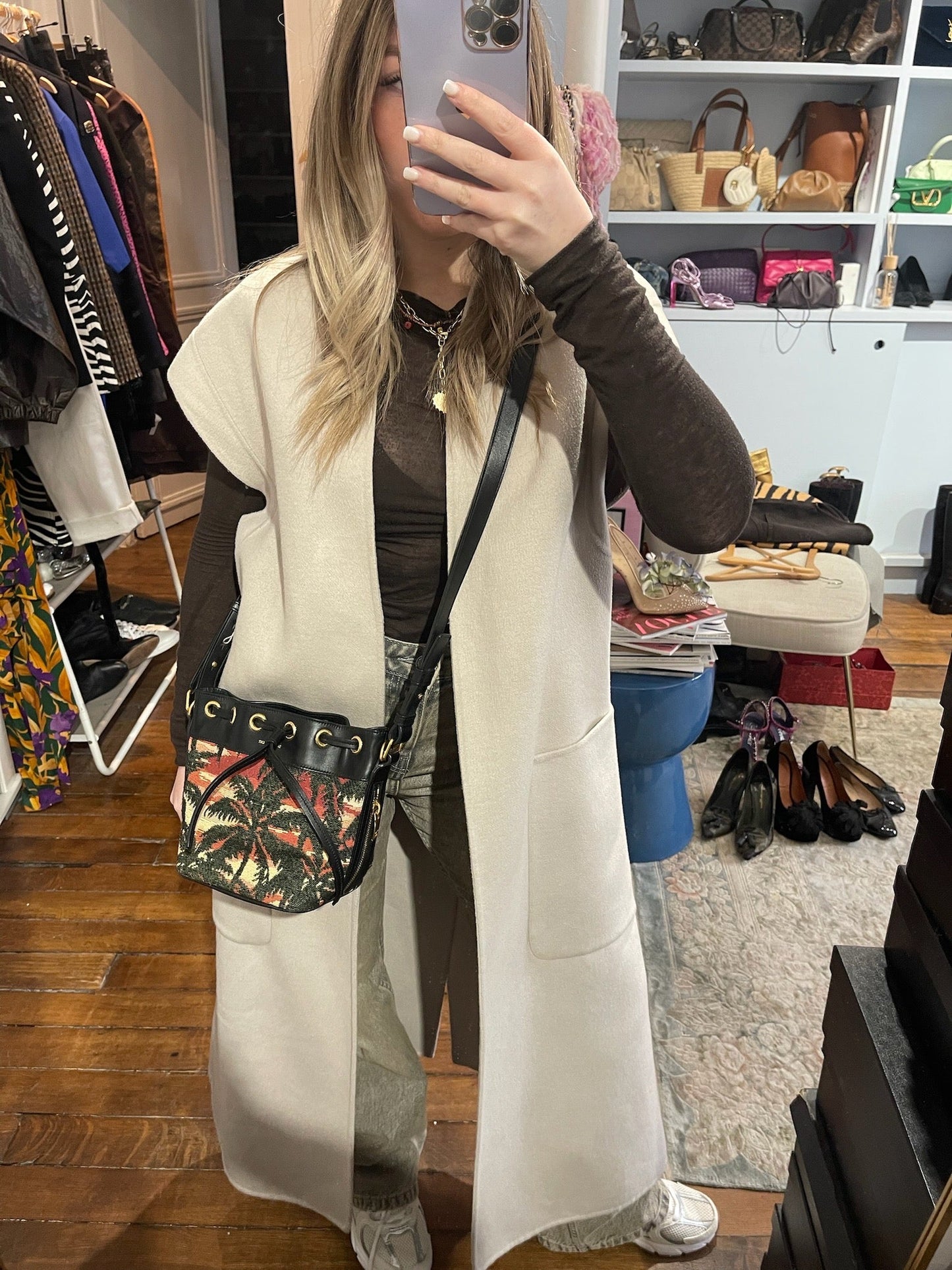 Sac en cuir noir et toile brodée palmiers. Forme seau, avec bandoulière ajustable et amovible. Petite anse sur le dessus pour un porté main. Fermeture par lien. Poche zippée sur le côté.