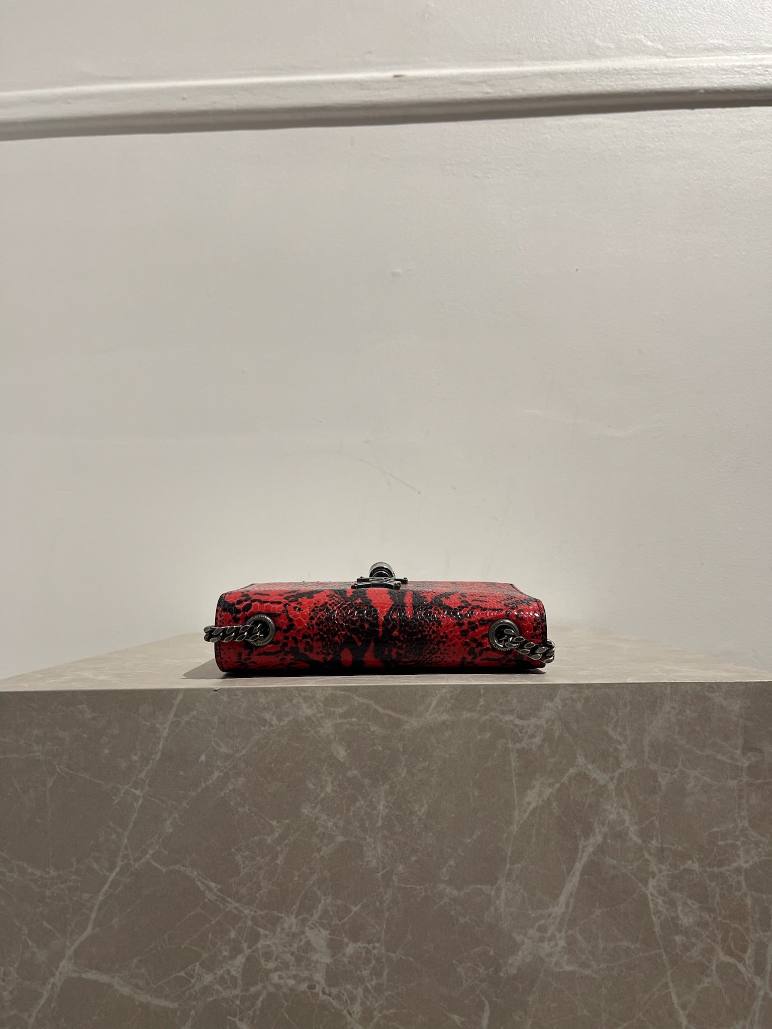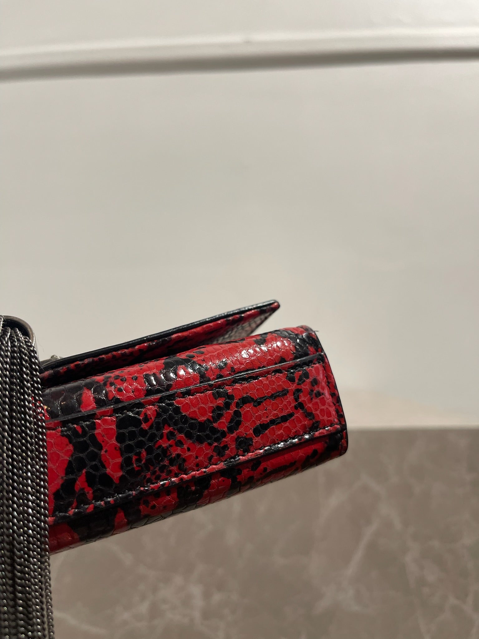 Sac en cuir embossé python rouge et noir orné du logo YSL en métal gris et d'un bijoux pompon. Fermeture à rabat pression aimantée et bandoulière chaine coulissante. Possibilité de le porter à l'épaule ou en crossbody.