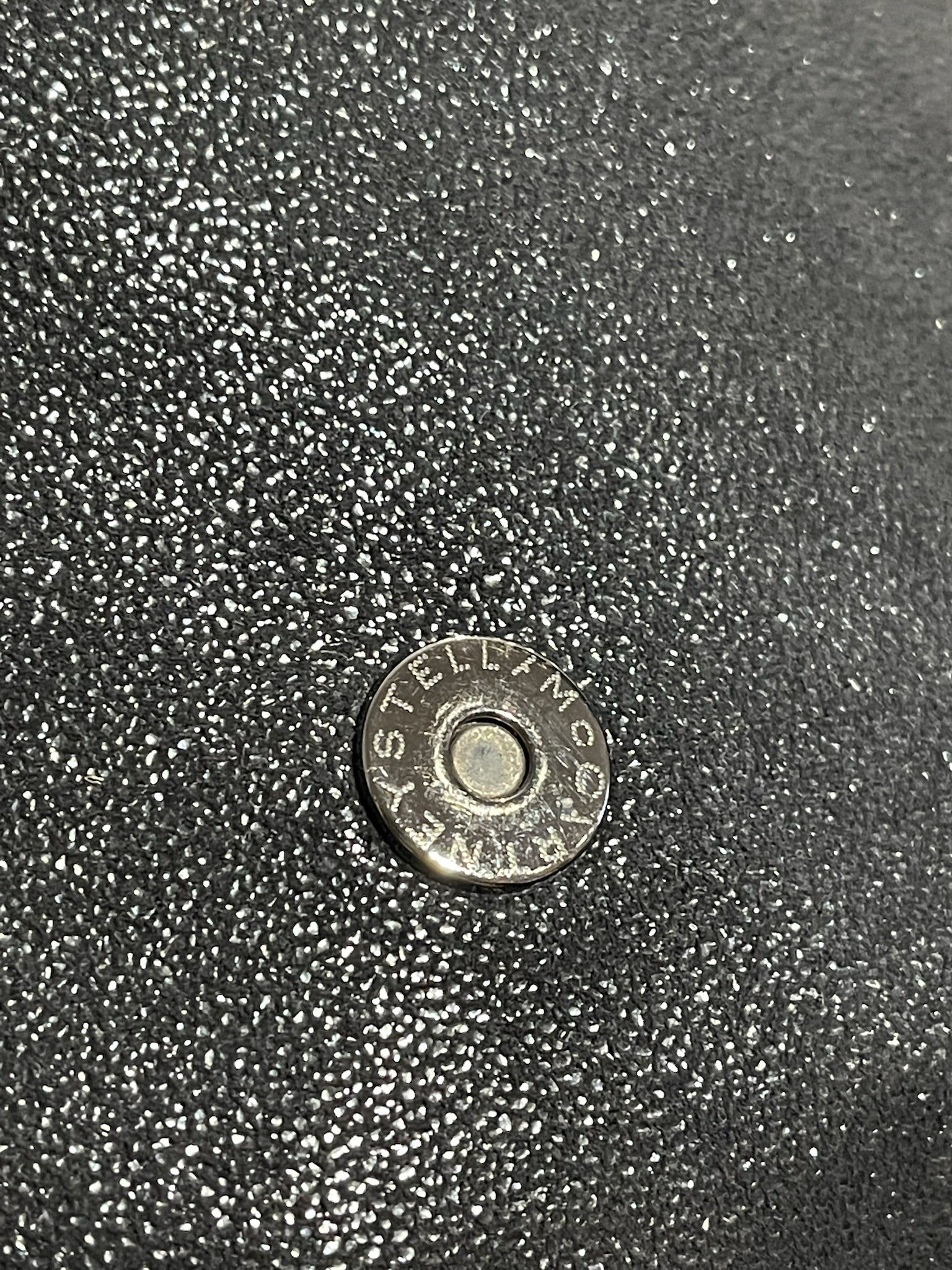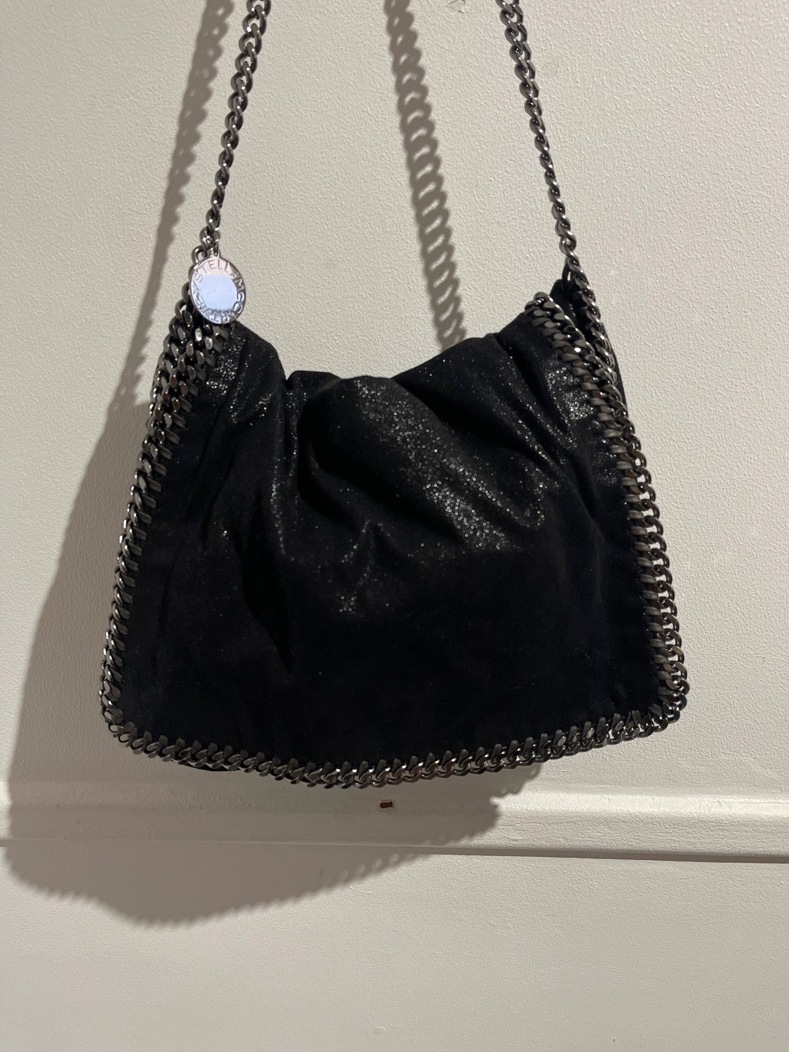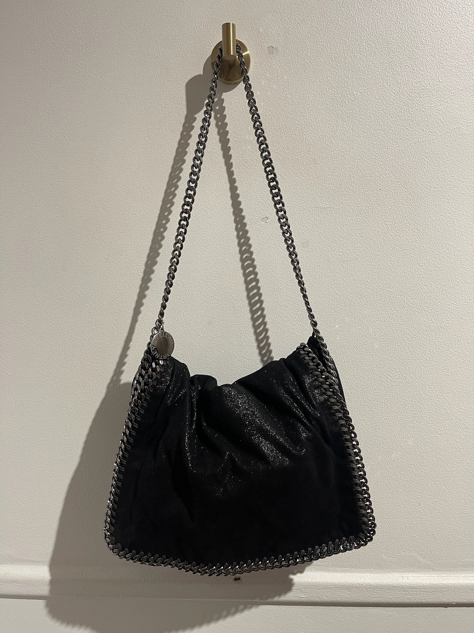 Sac en cuir vegan noir. Entouré de chaines argent. Fermeture à rabat aimantée. Poche intérieure zippée. Médaillon signé Stella McCartney sur la bandoulière, possibilité de porter épaule ou en cross body (court).