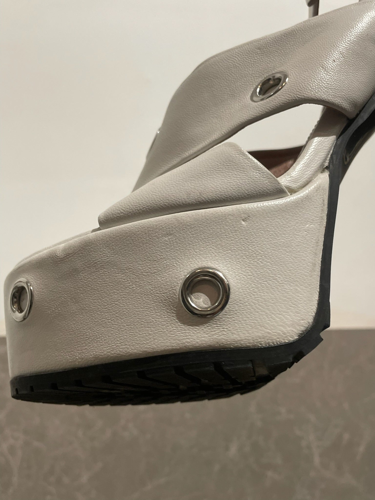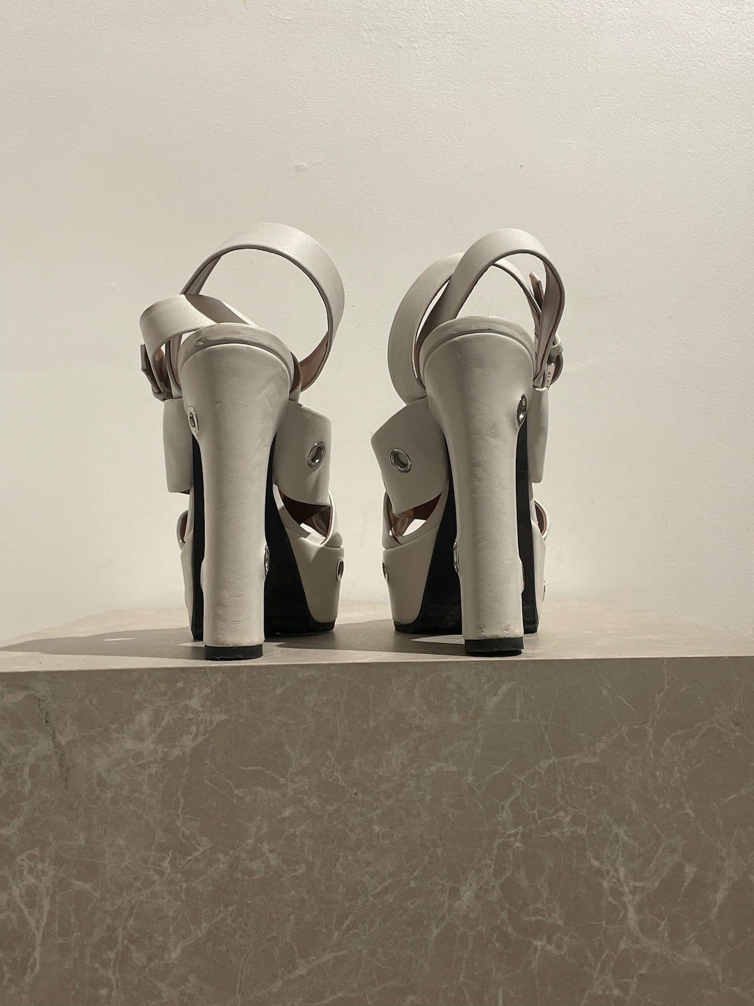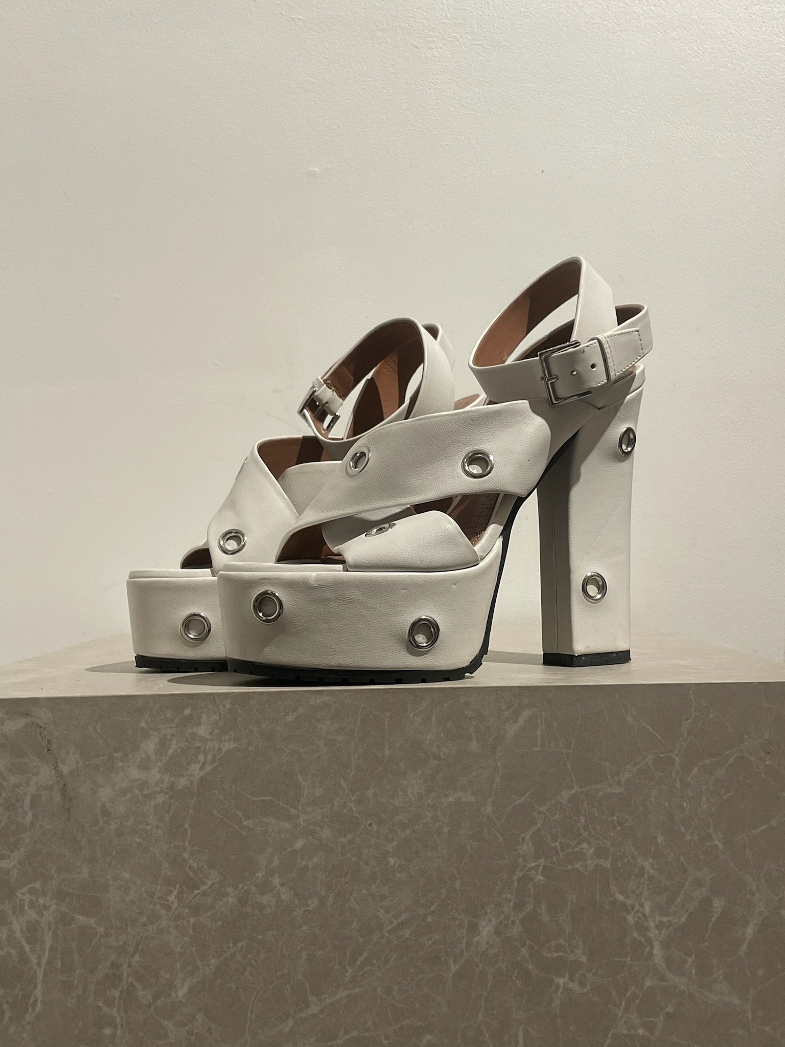 Sandales en cuir blanc ornées d'oeillets en métal argent. Talon plateforme.