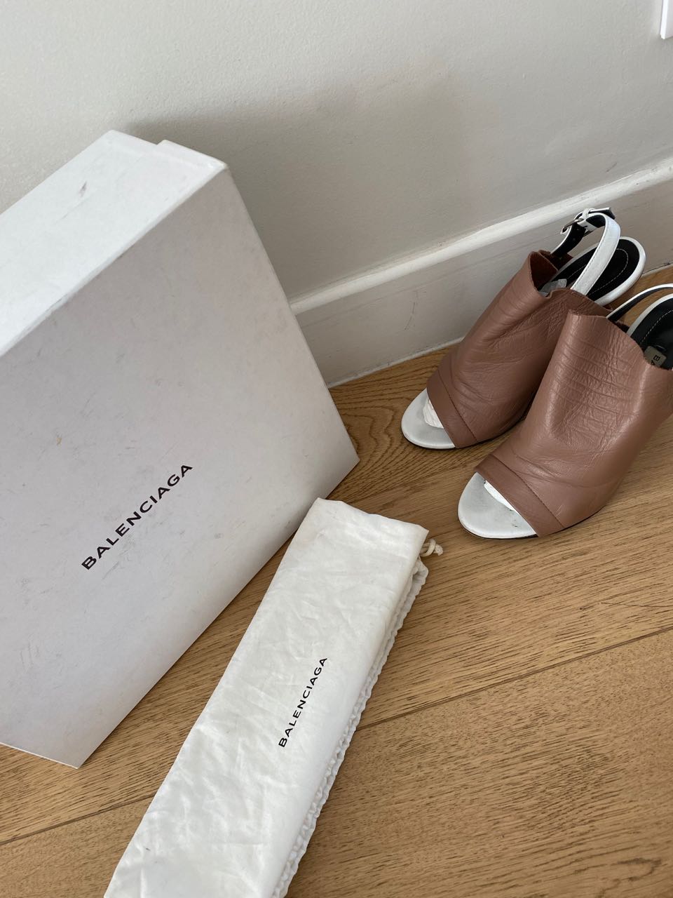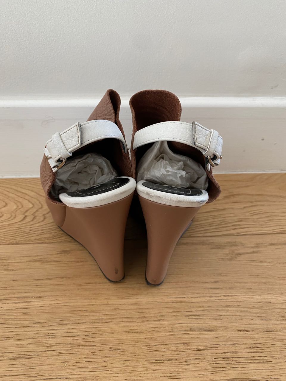 Modèle Gloves, sandales en cuir camel et blanc à talons compensés.
