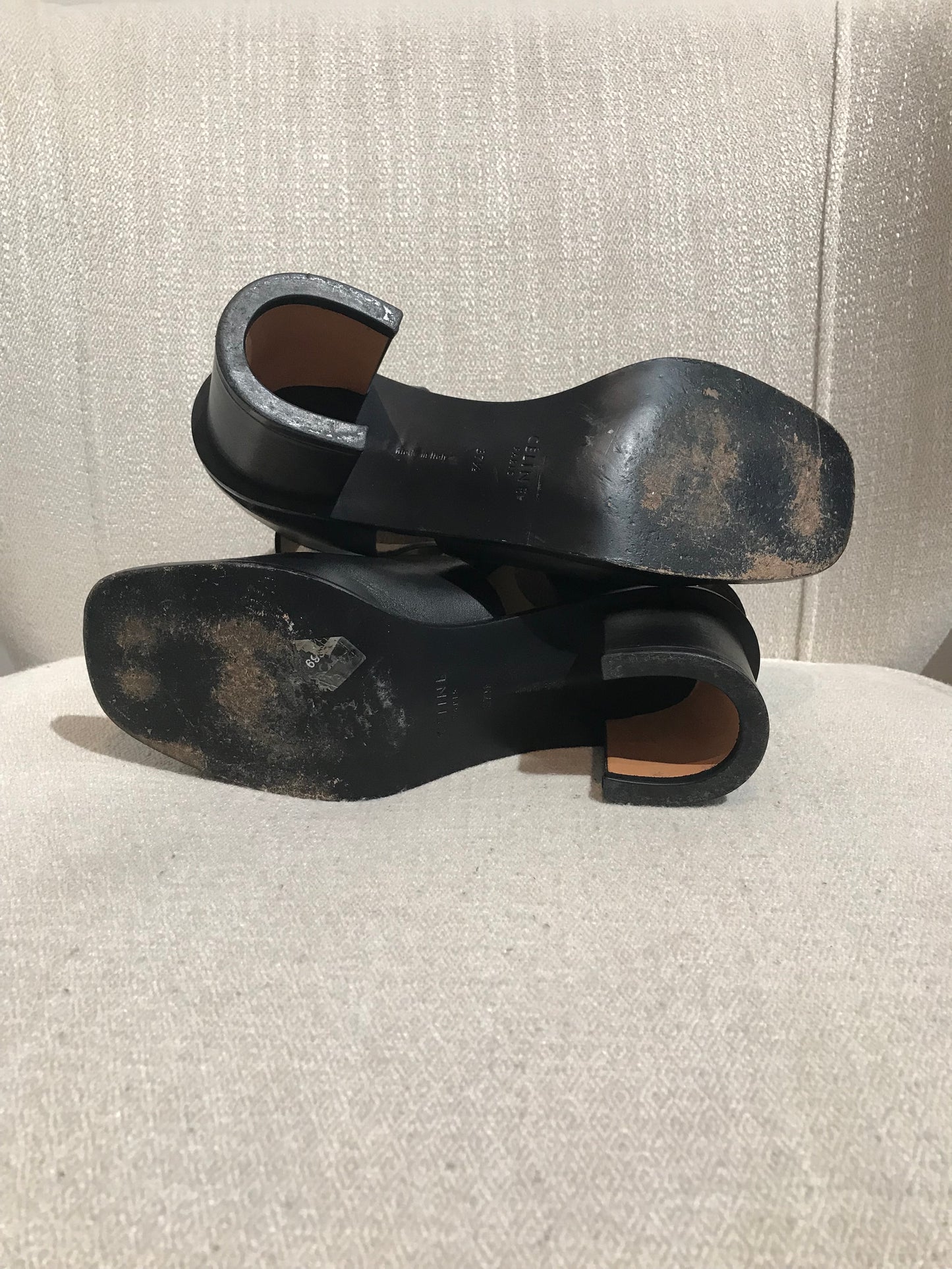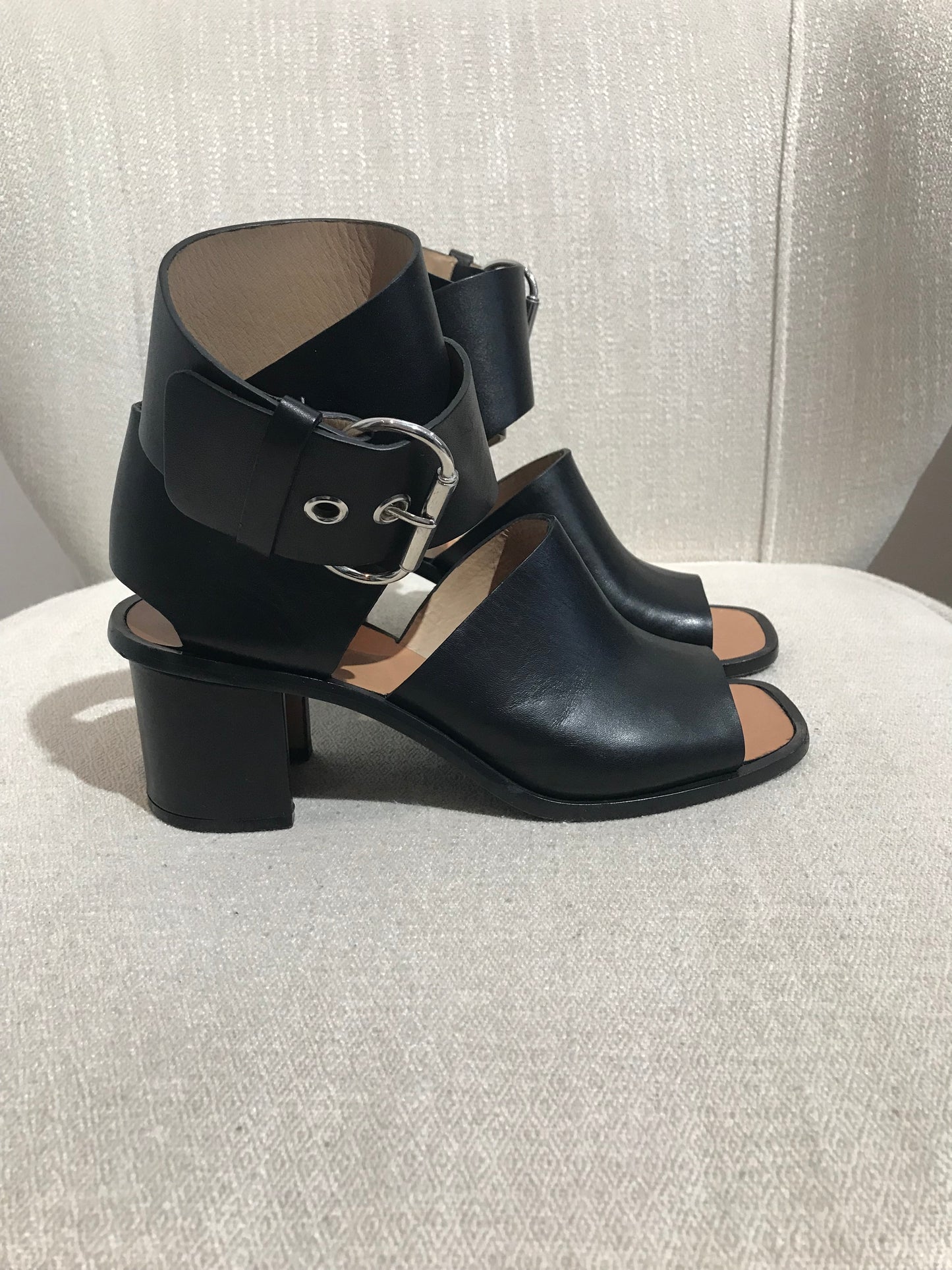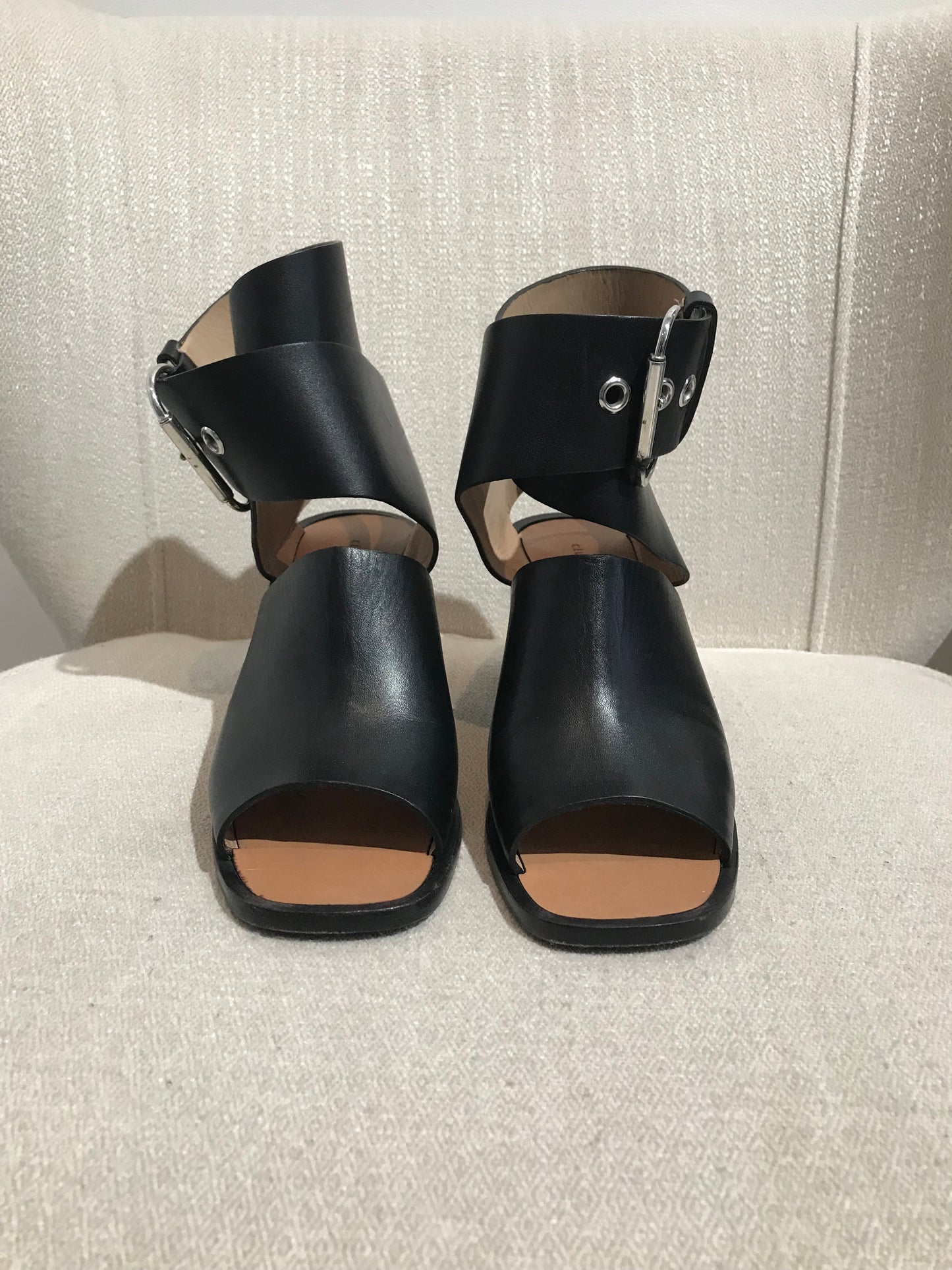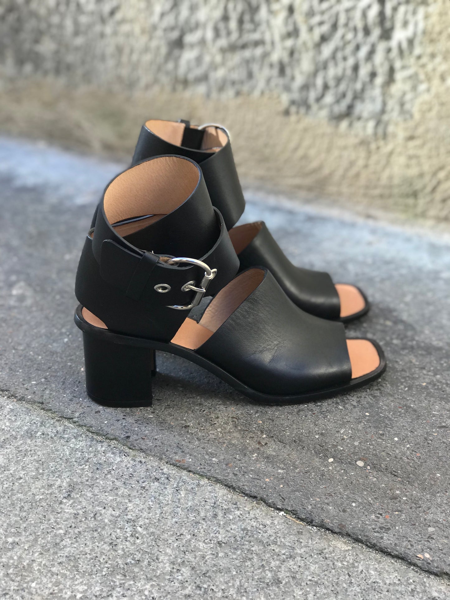 Sandales en cuir noir avec boucle en métal argent à la cheville. Boucle à taille réglable.