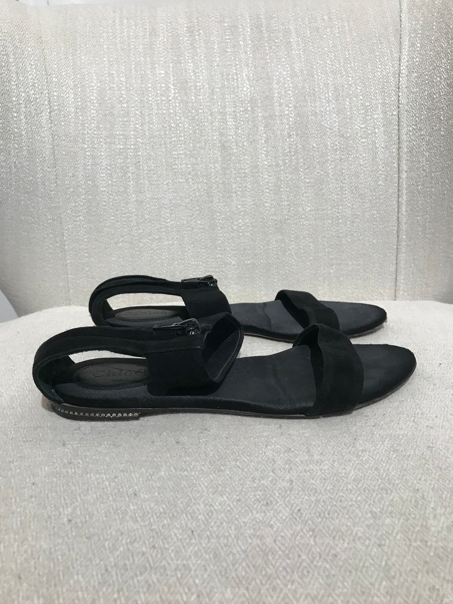 Sandales plates en daim noir avec bride unique sur l'avant et fermeture zip à l'arrière. Semelle intérieure en satin noir.