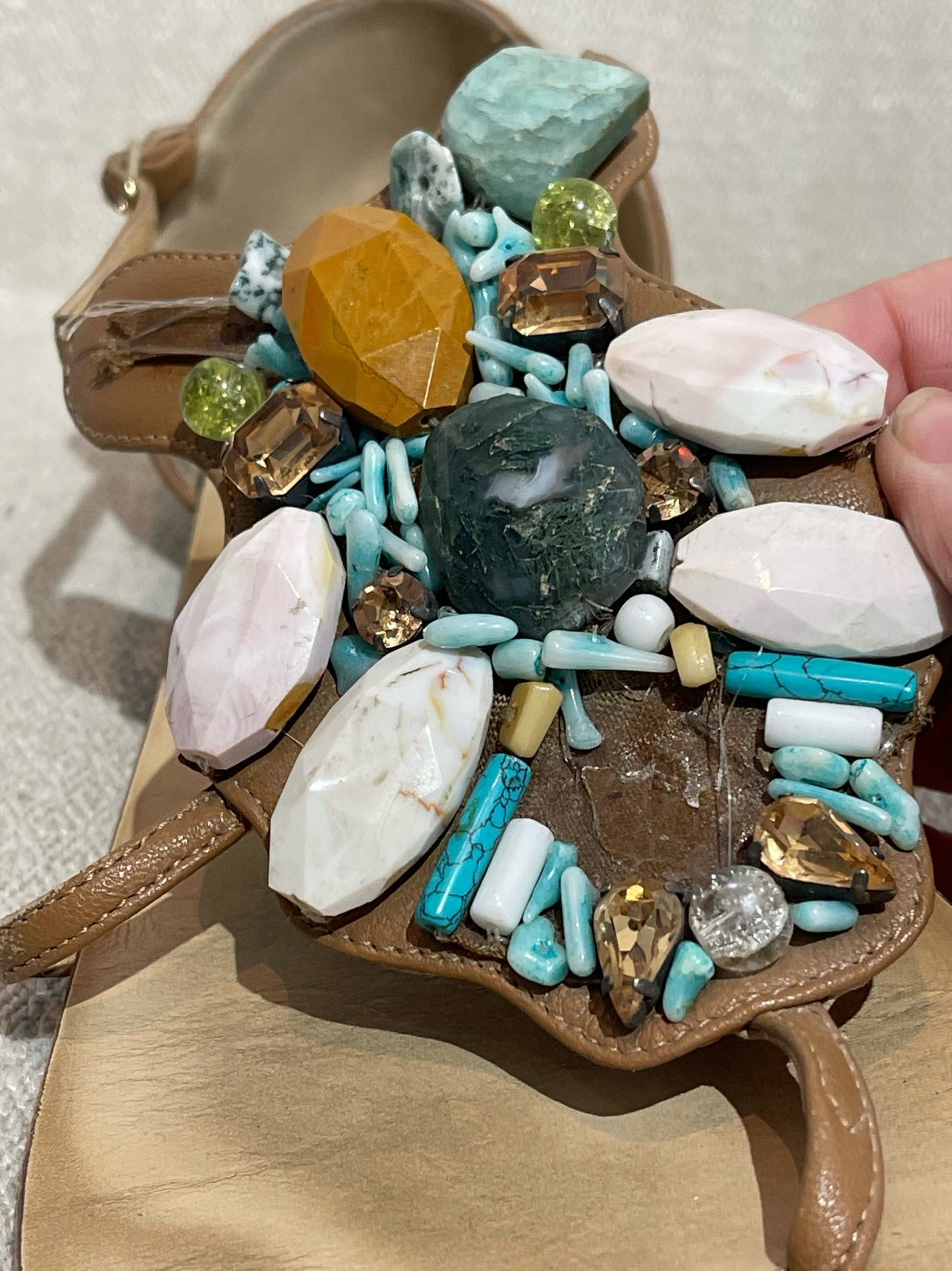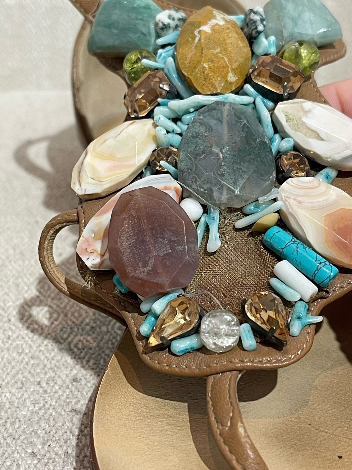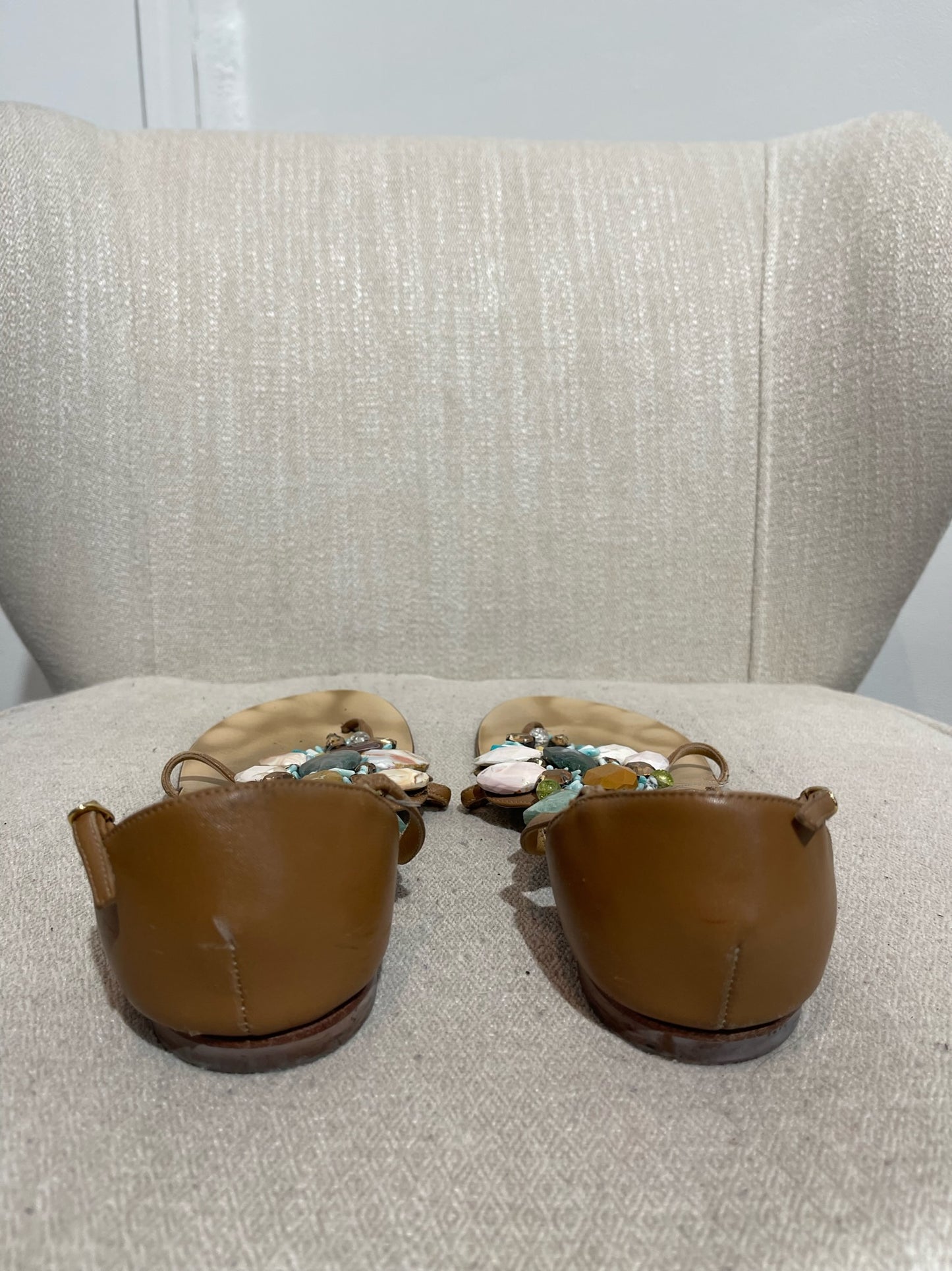 Sandales plates en cuir camel ornées de jolies pierres colorées. Boucle ajustable à la cheville.