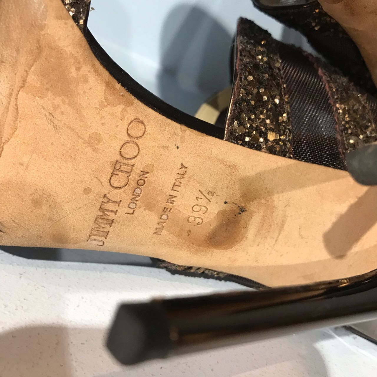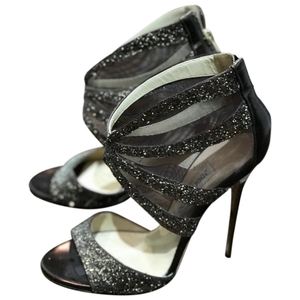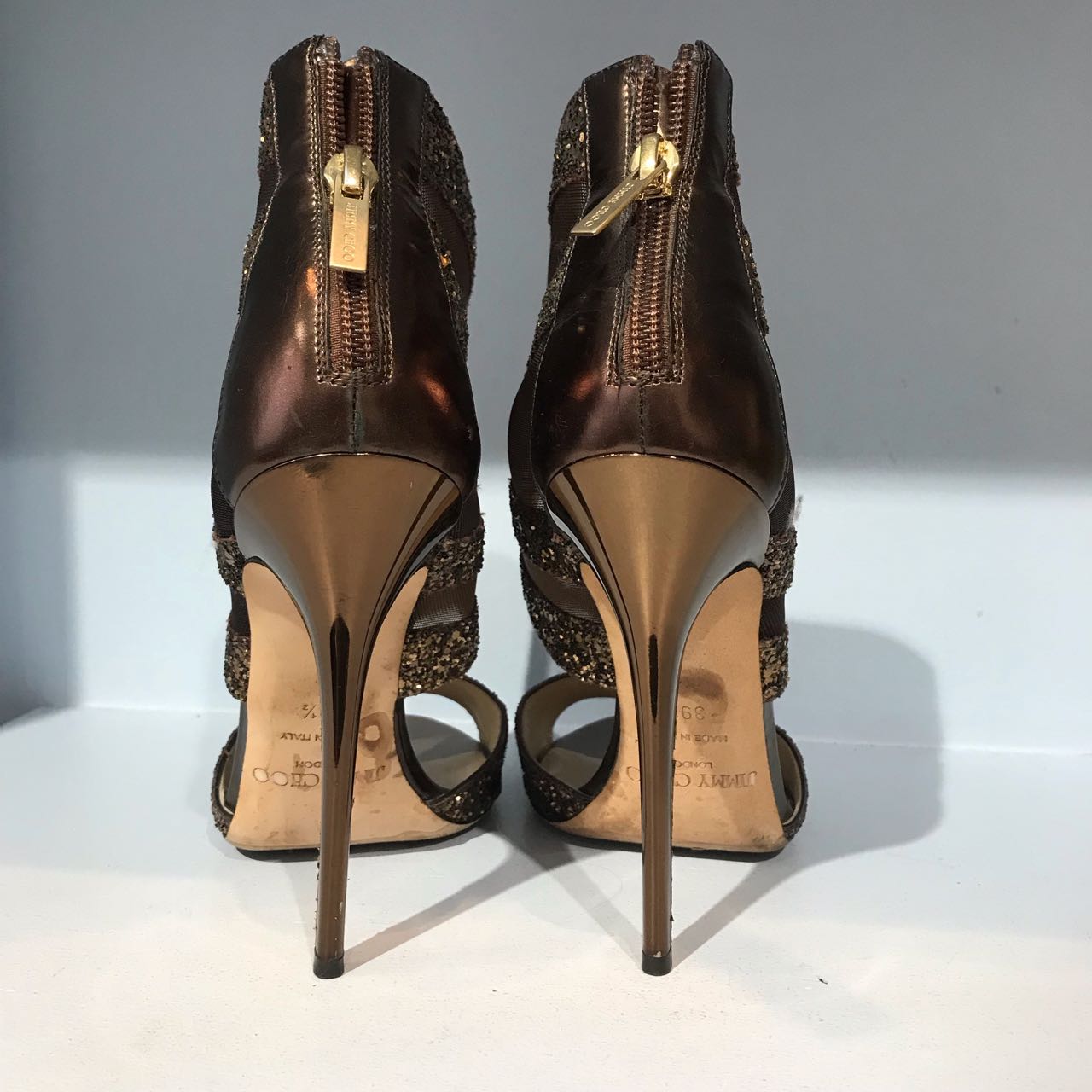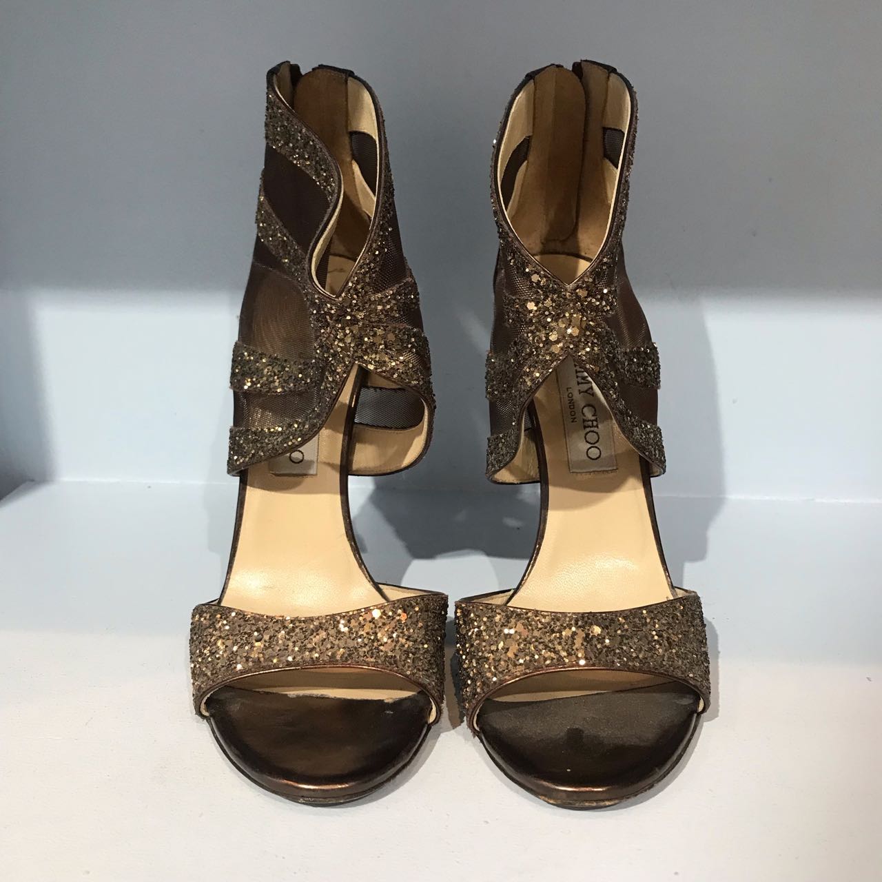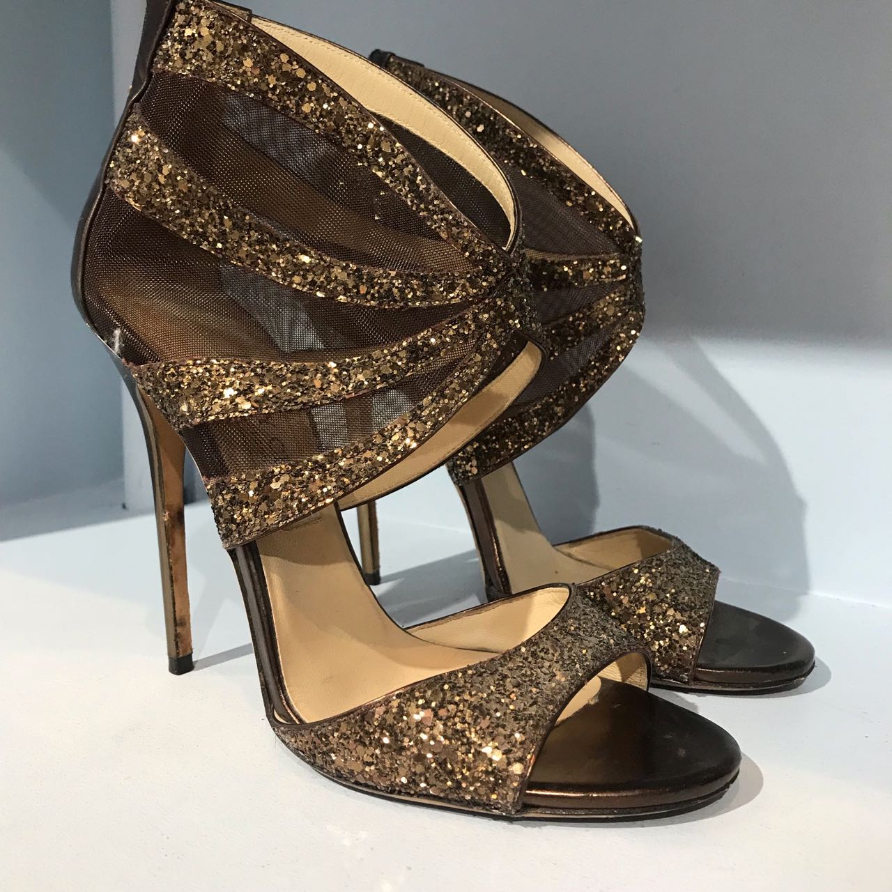 Sandales à paillettes et résille couleur bronze, talon miroir.