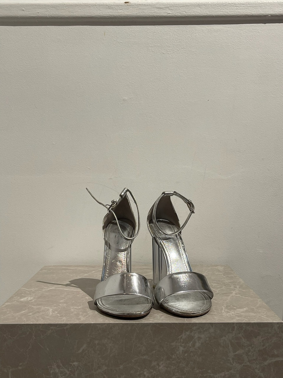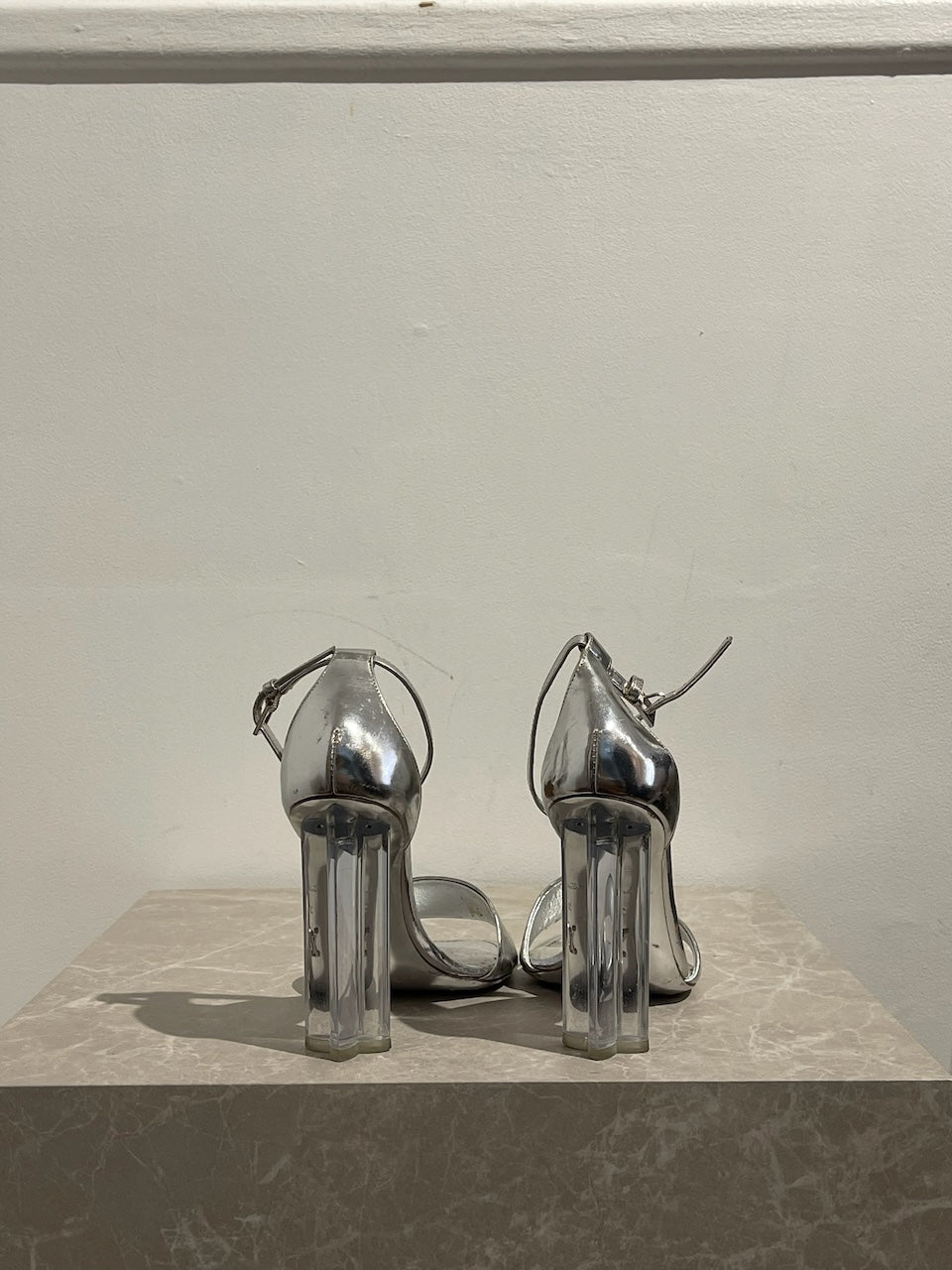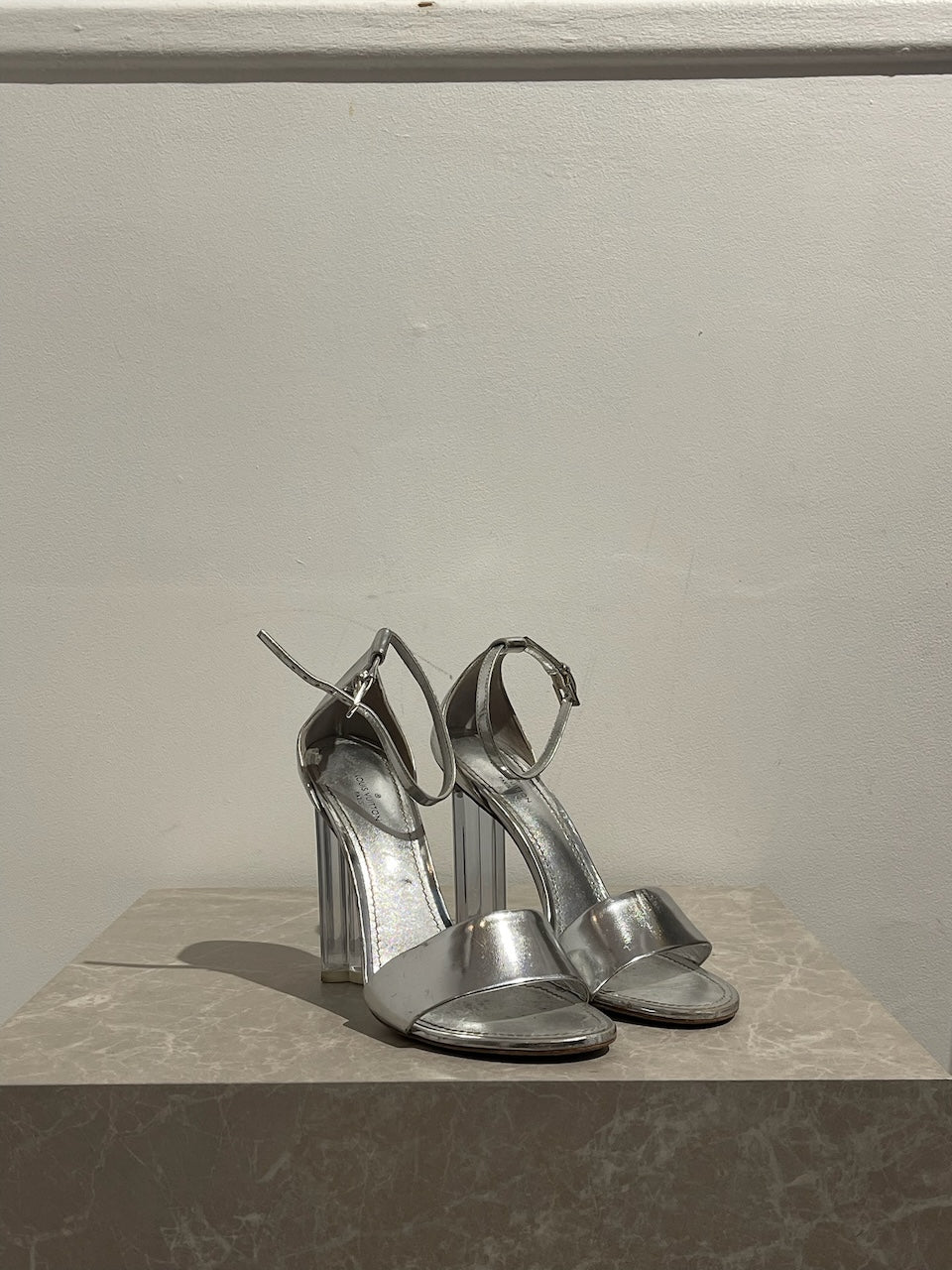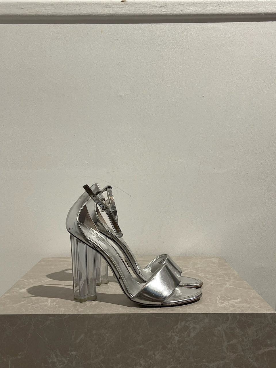 Sandales en cuir argenté avec bride ajustable à la cheville et jolie talon en plexi transparent formant une fleur.