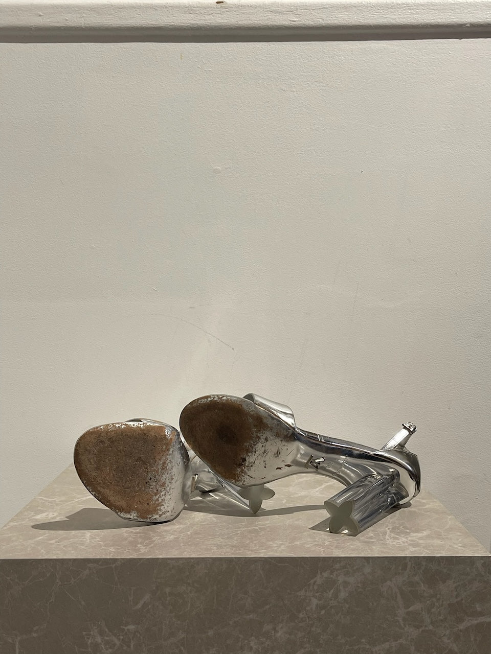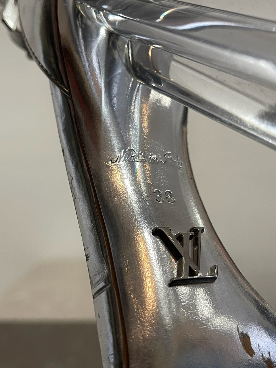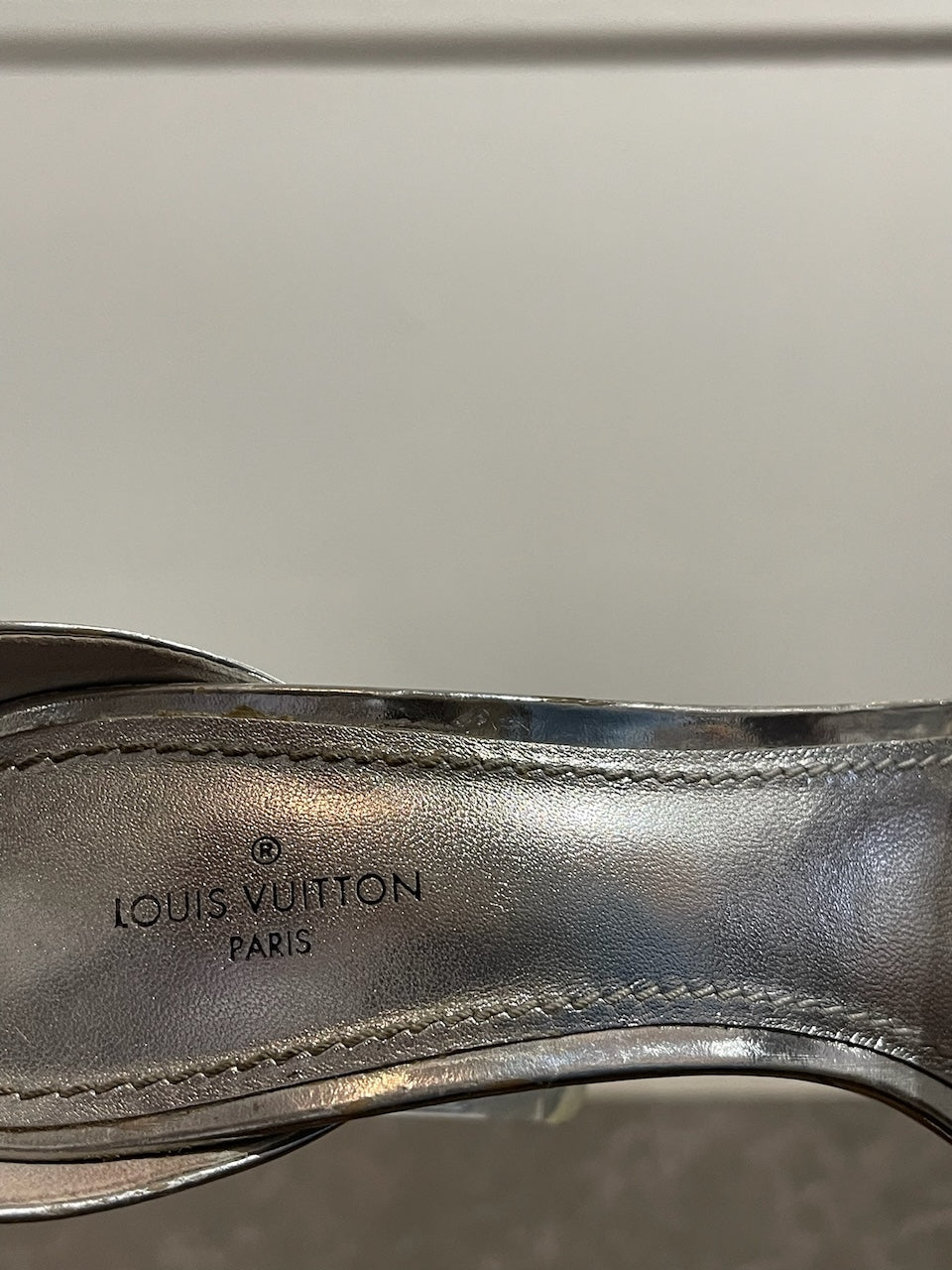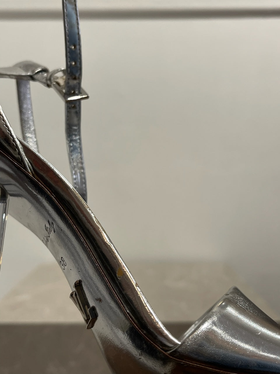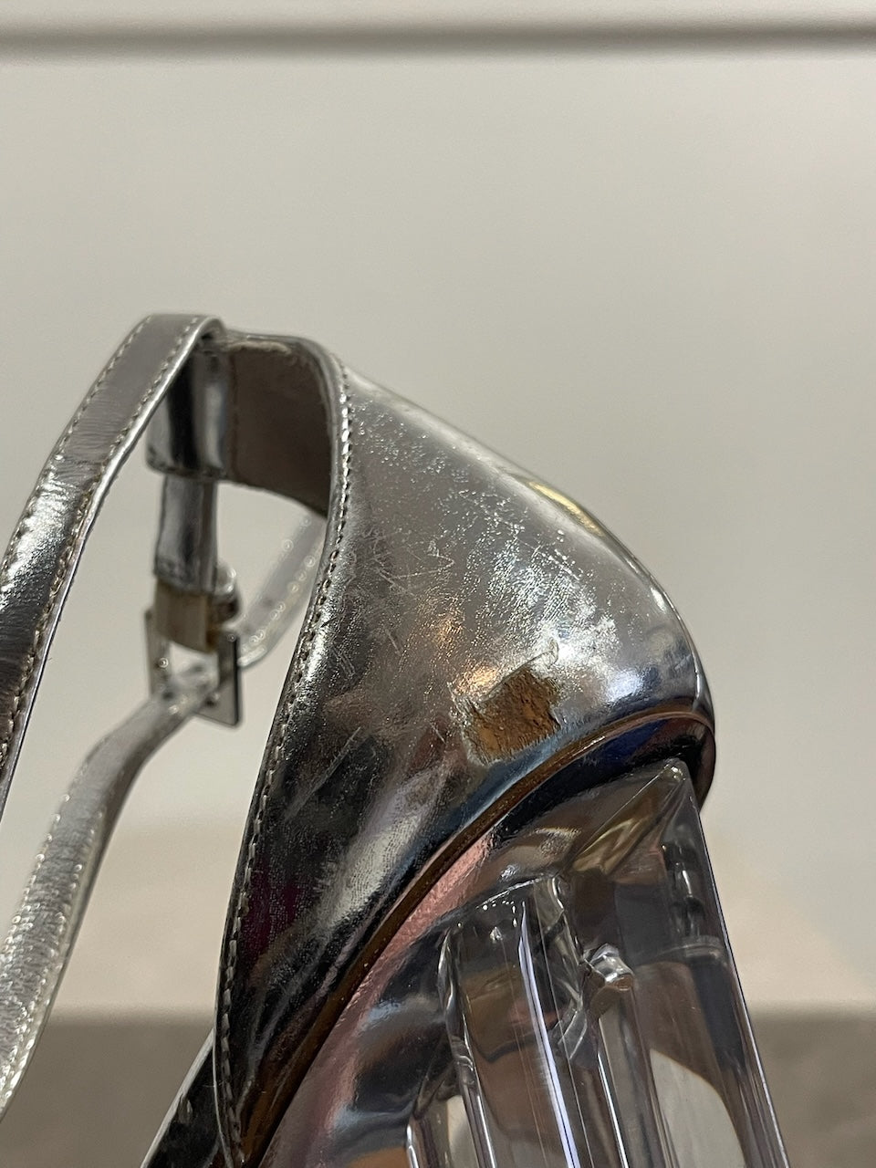 Sandales en cuir argenté avec bride ajustable à la cheville et jolie talon en plexi transparent formant une fleur.