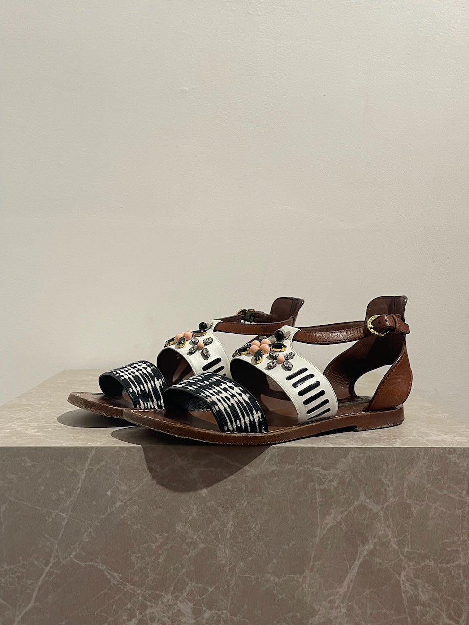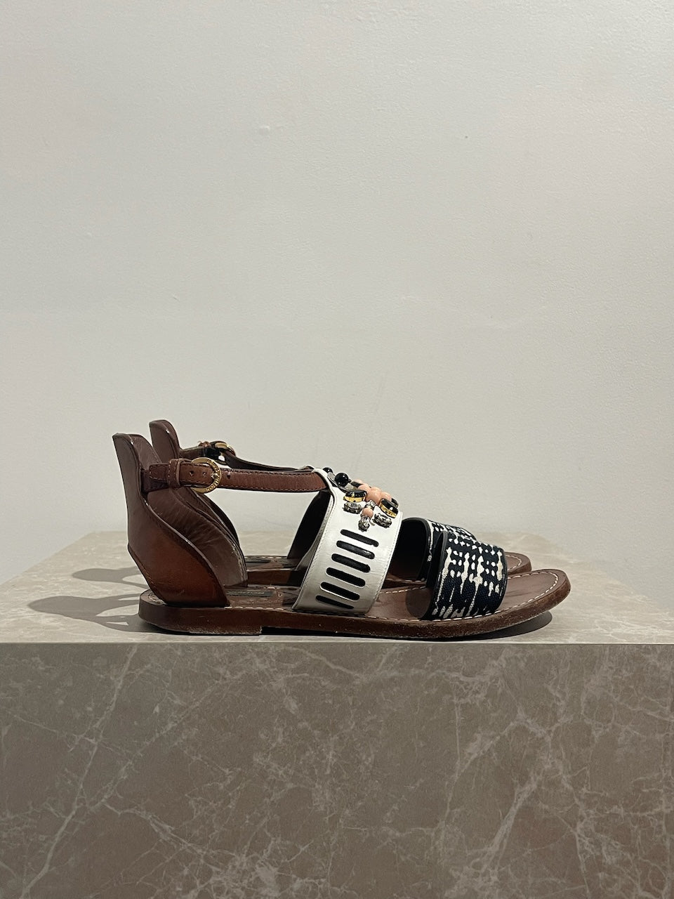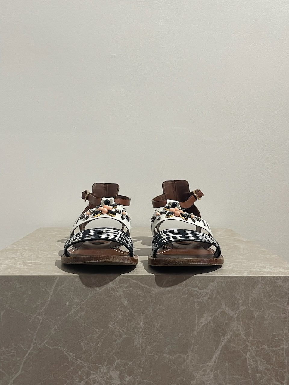 Sandales en cuir et toile camel et blanc ornées de cristaux avec bride ajustable à la cheville.