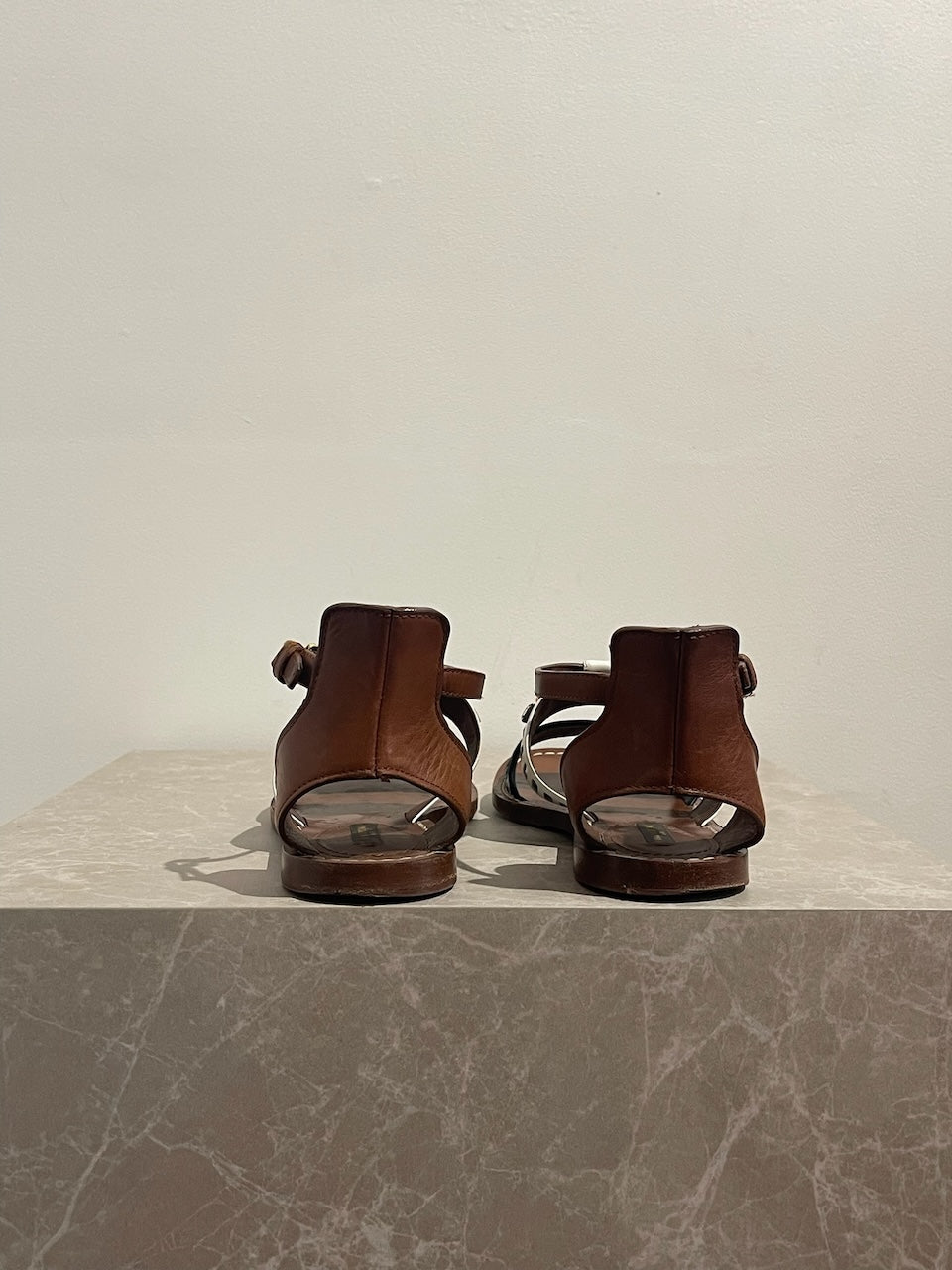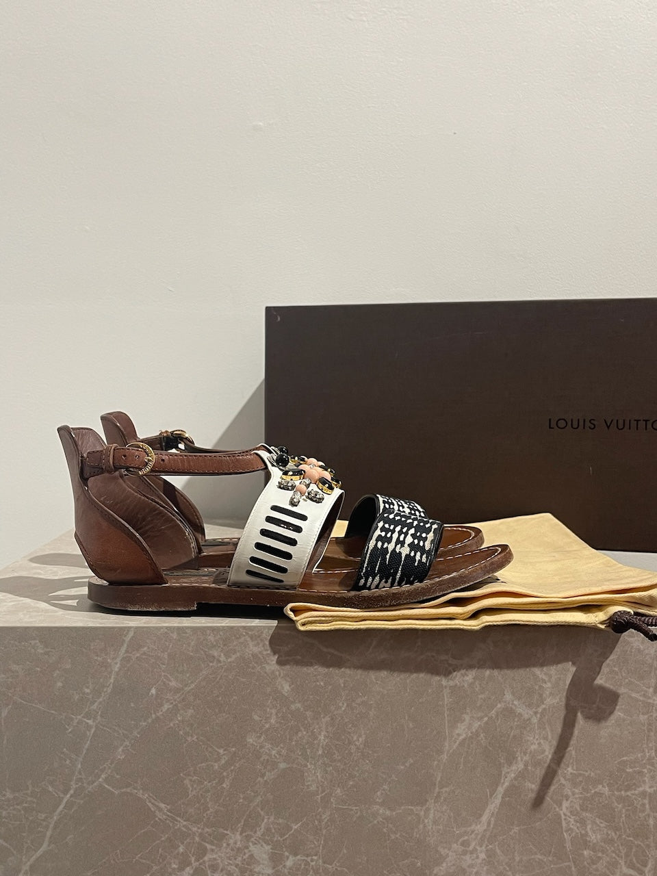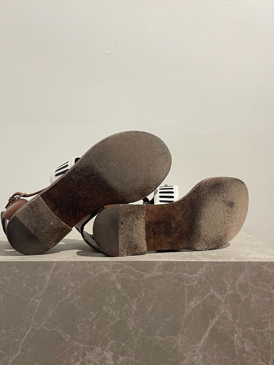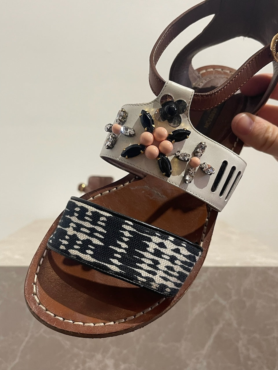 Sandales en cuir et toile camel et blanc ornées de cristaux avec bride ajustable à la cheville.