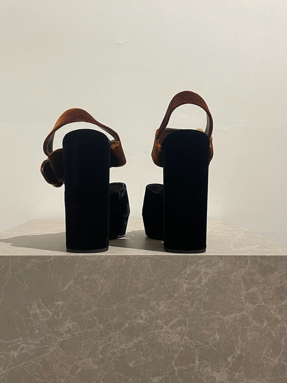 Sandales en velours noir et marron avec boucle ajustable à la cheville. Talons hauts et plateformes.