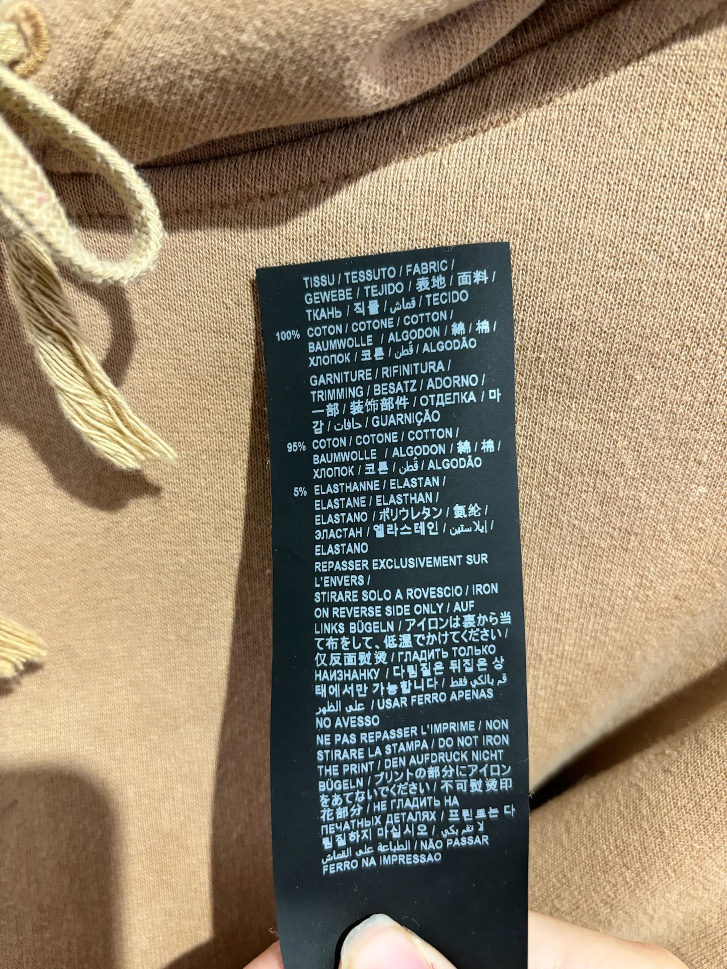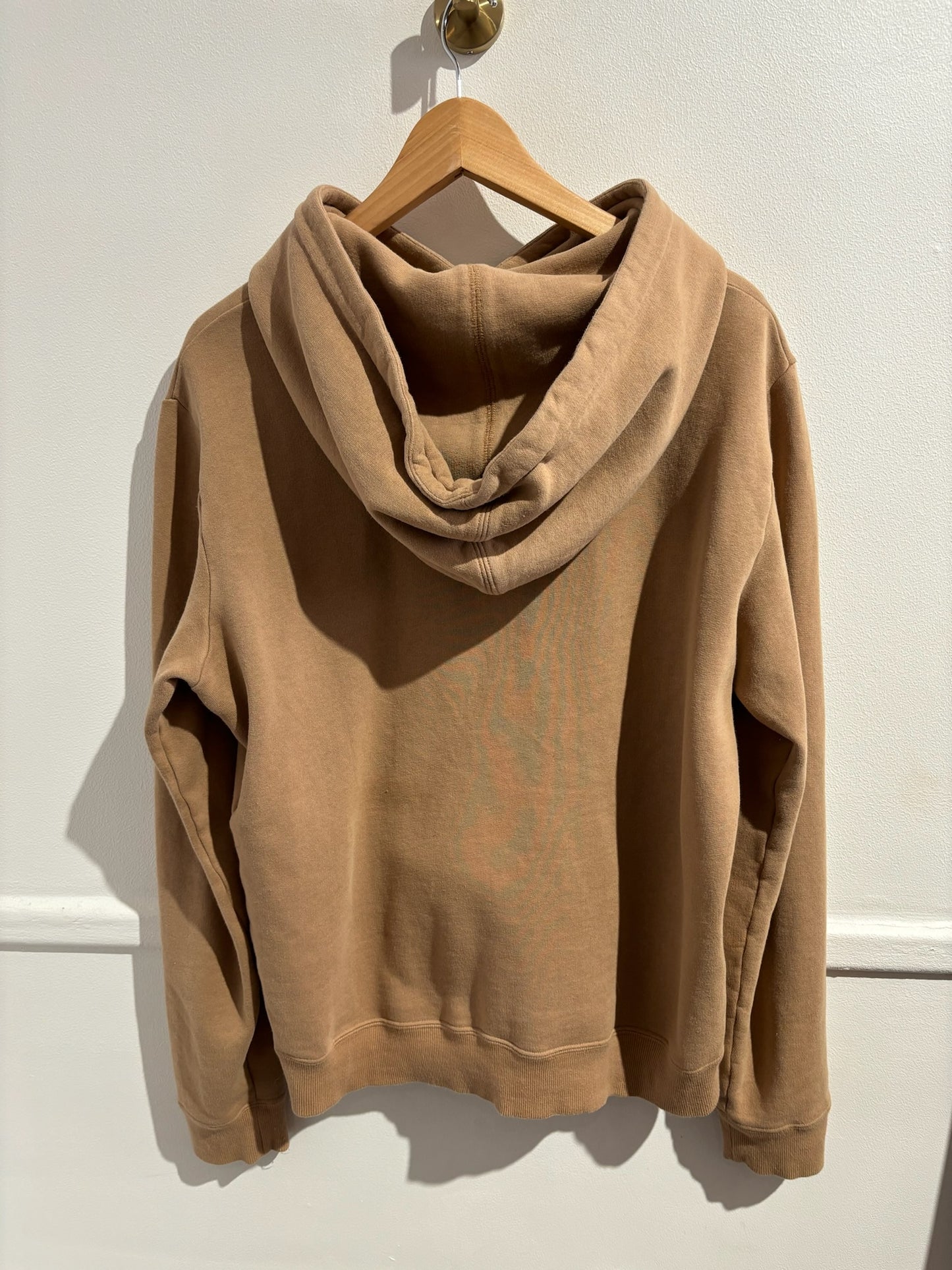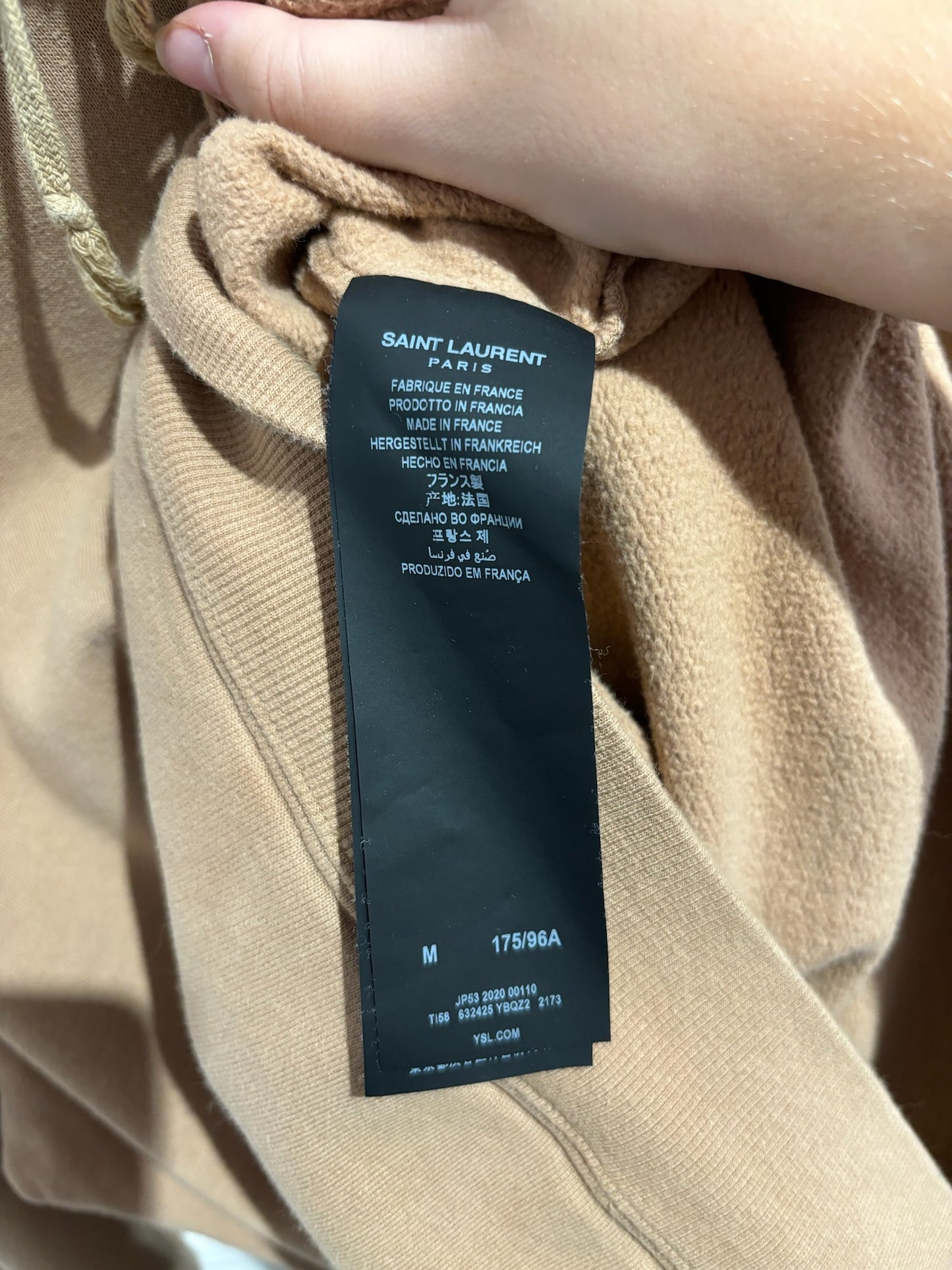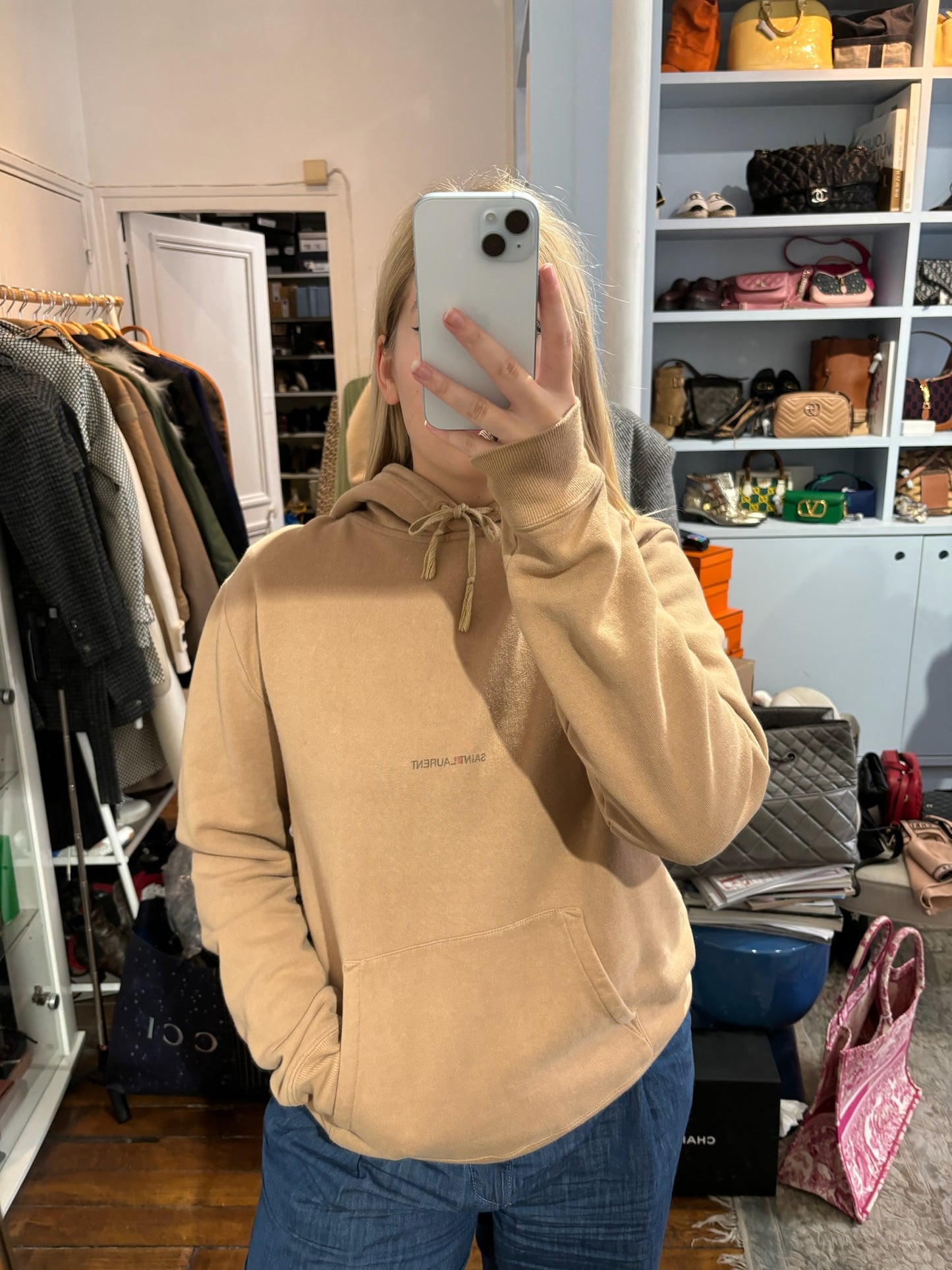 Sweat à capuche en coton camel avec impression "Saint Laurent" sur le devant. Poche kangourou. Modèle unisexe.