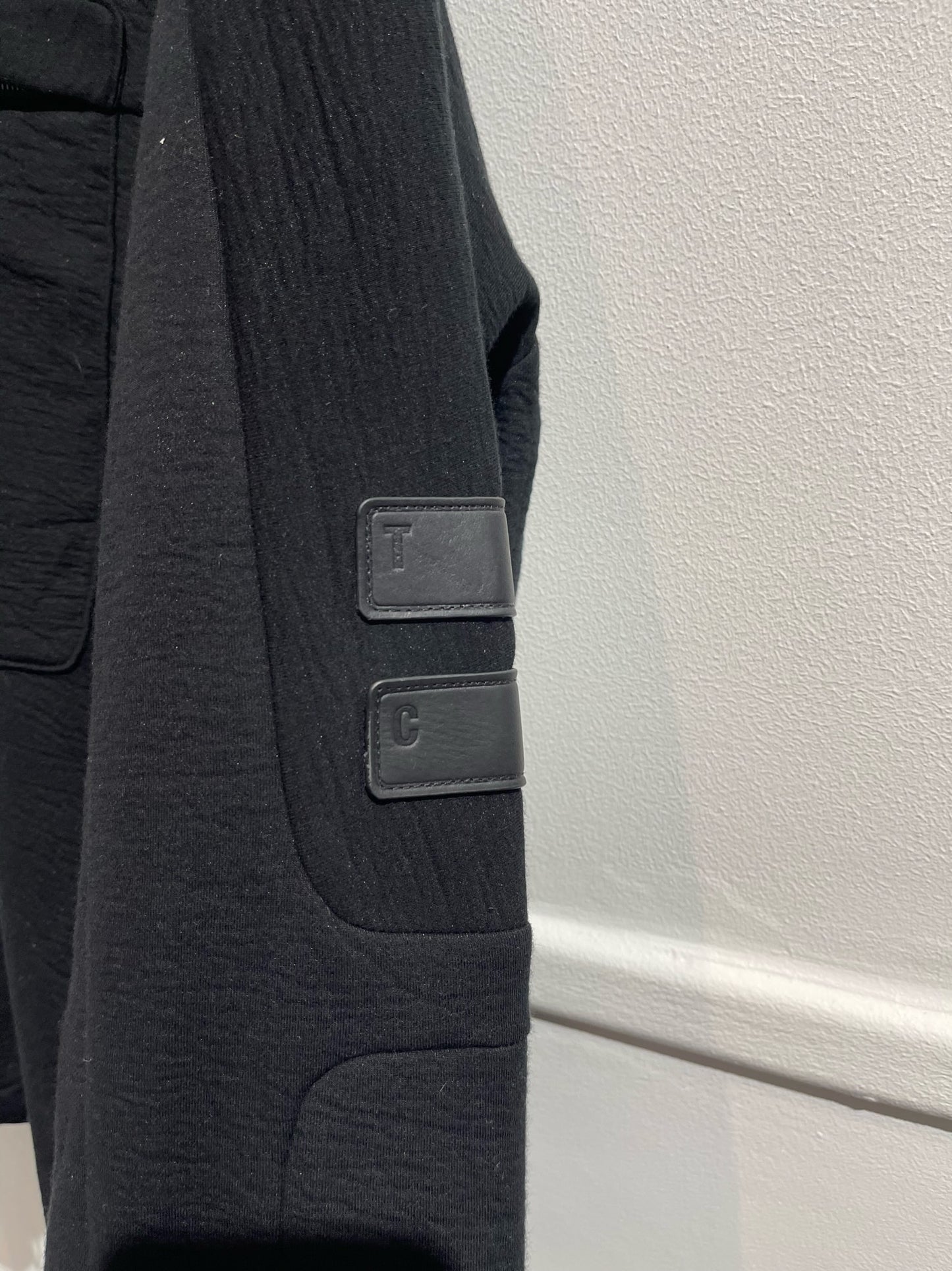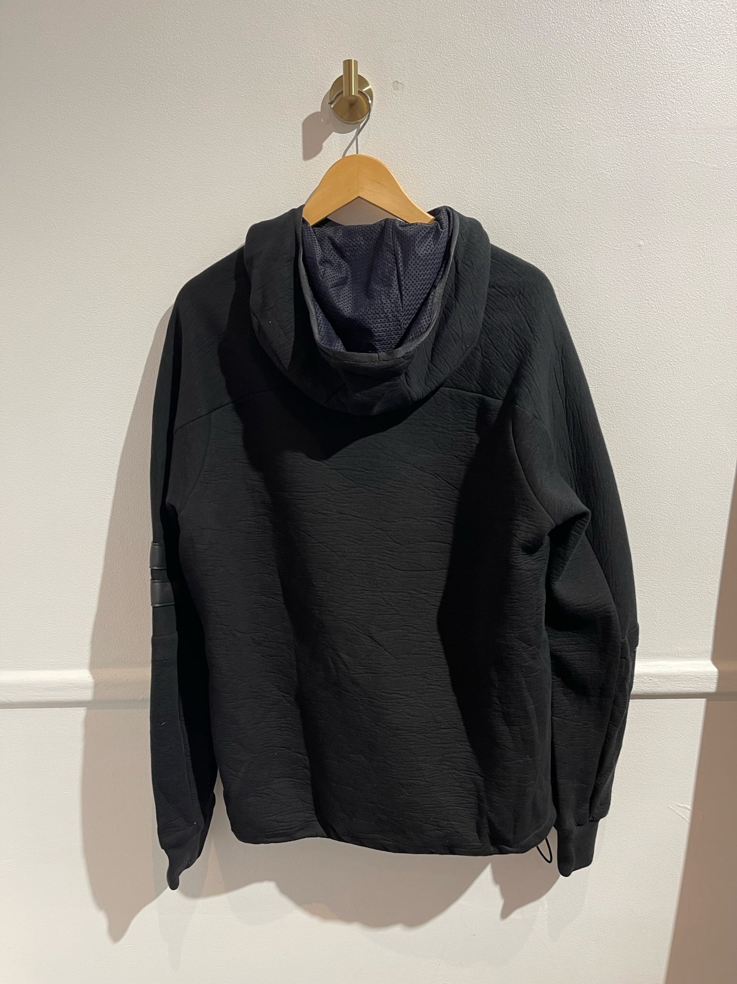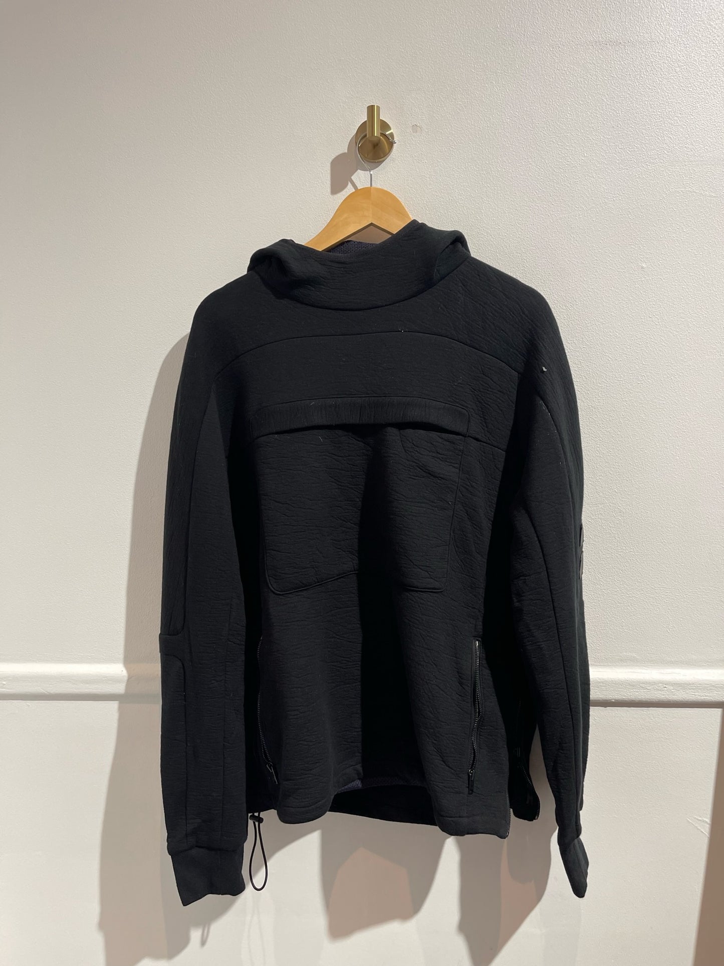Sweat en coton et polyamide noir avec capuche, poche avant zippée et poches latérales zip. Ourlet à lien de serrage et fente zippée. Détail en cuir à la manche.
