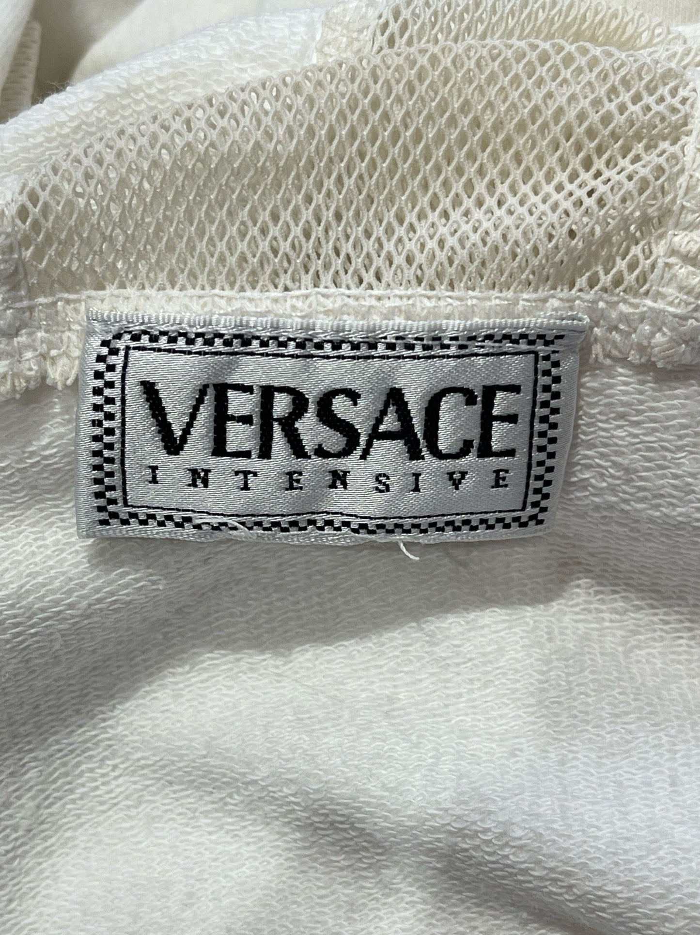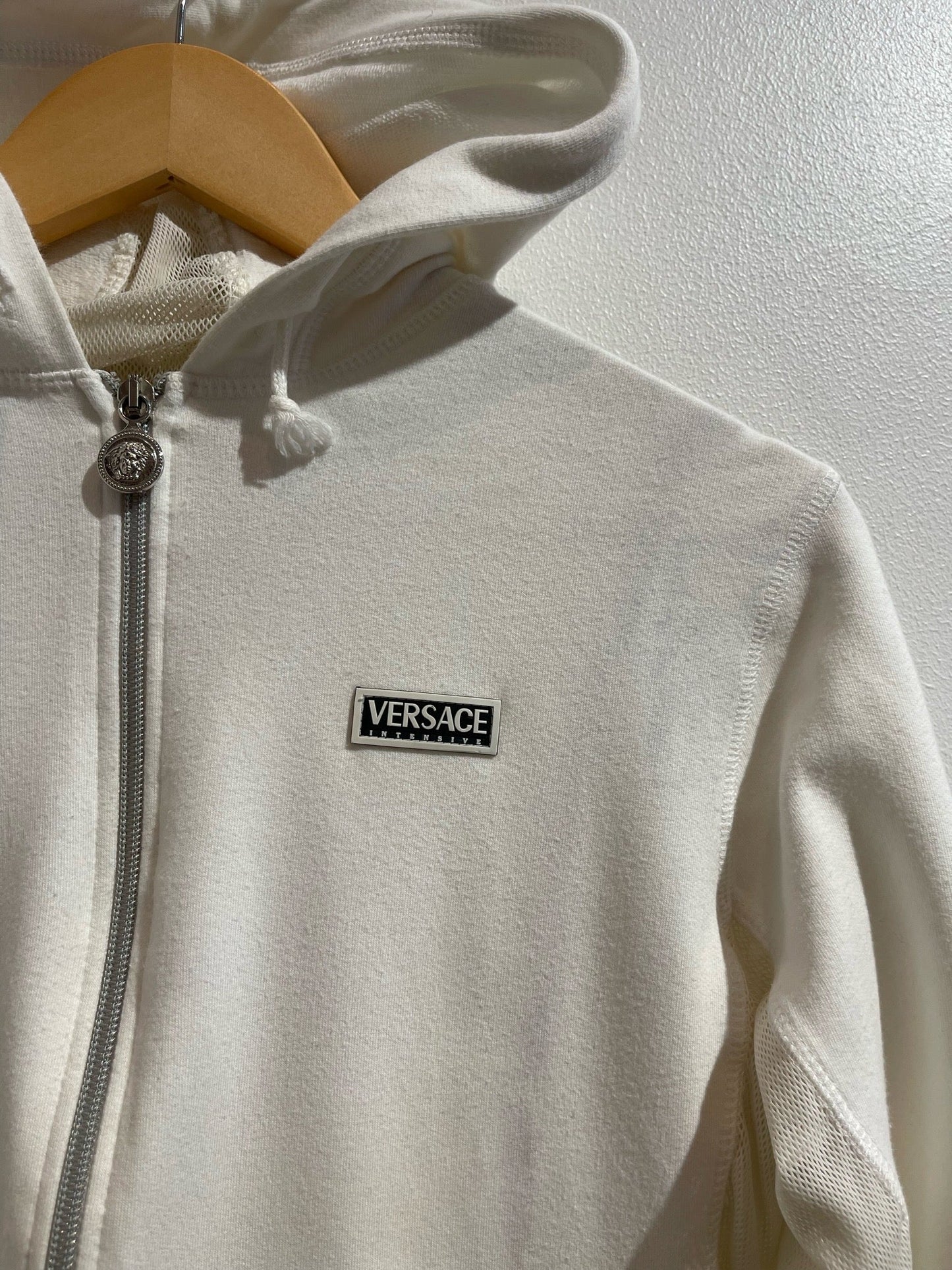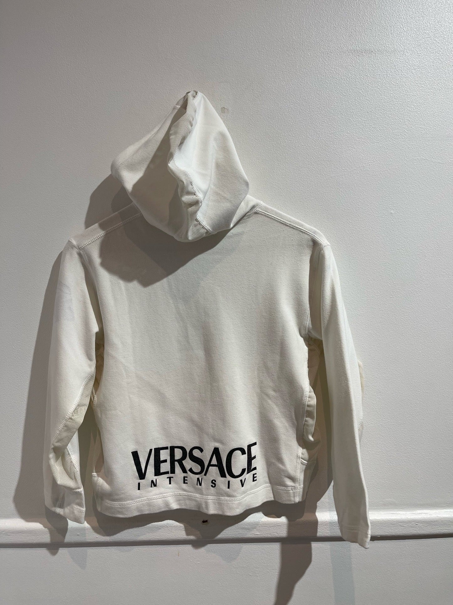 Sweat à capuche en coton blanc. Patch inscription Versace sur la poitrine et flocage Versace en noir au dos. Détail de patchwork en résille blanc. Fermeture zip.