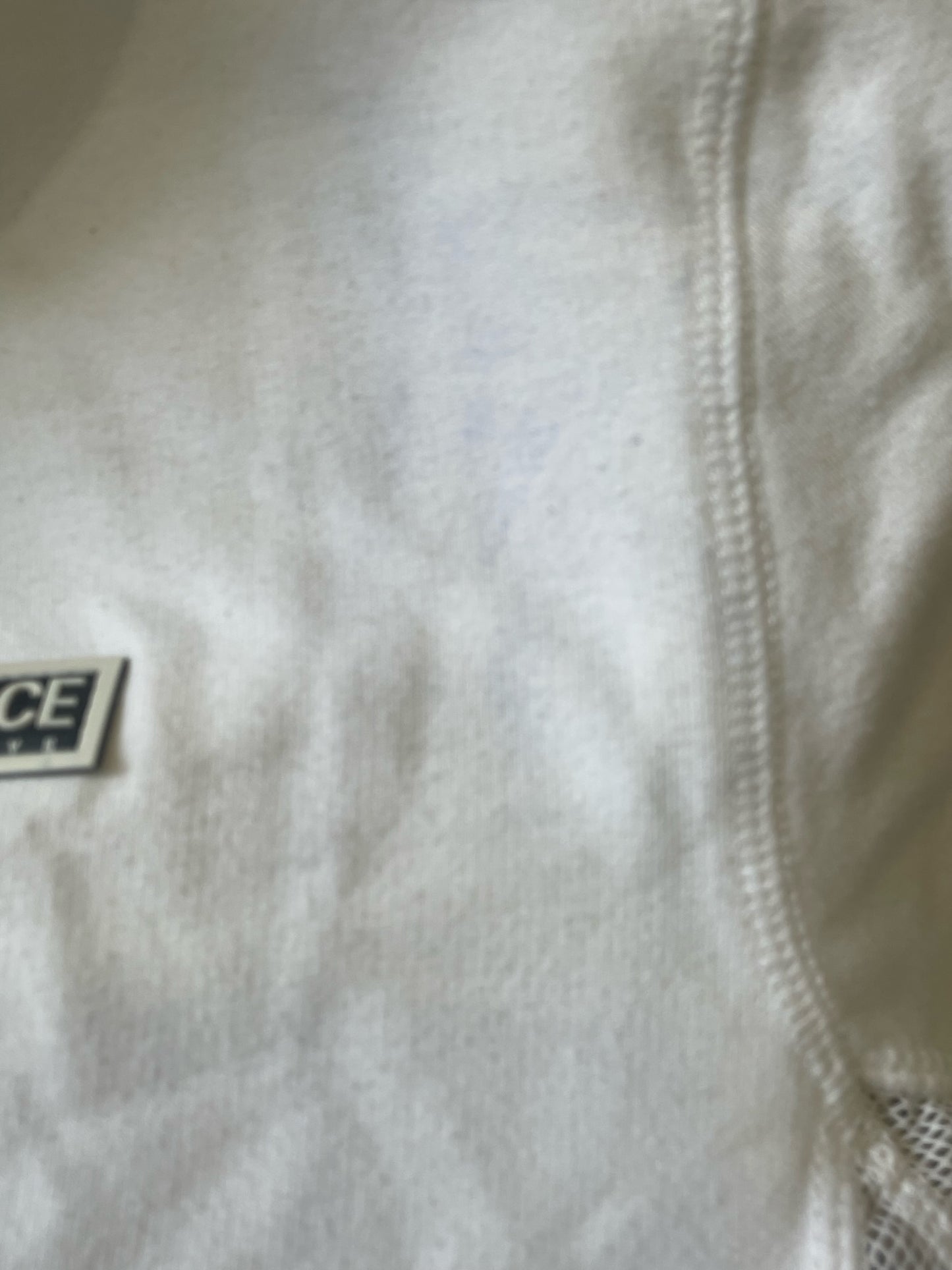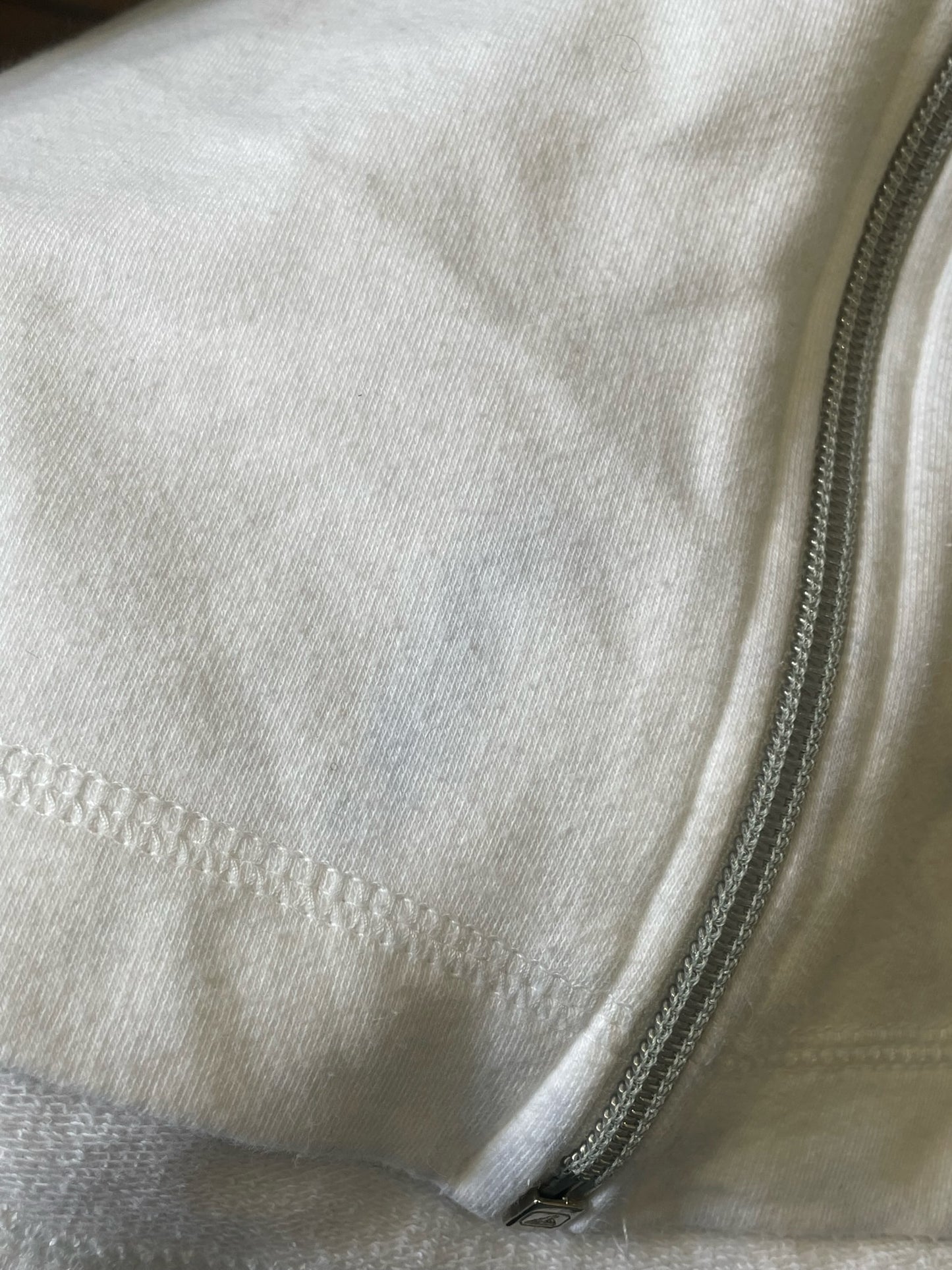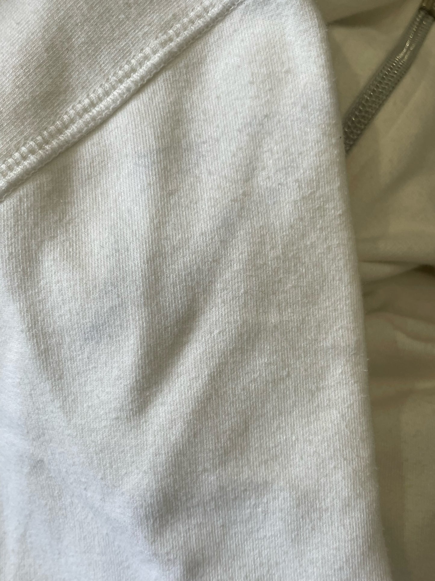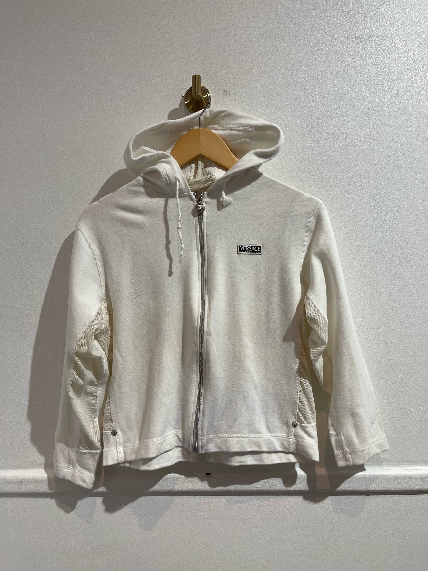 Sweat à capuche en coton blanc. Patch inscription Versace sur la poitrine et flocage Versace en noir au dos. Détail de patchwork en résille blanc. Fermeture zip.