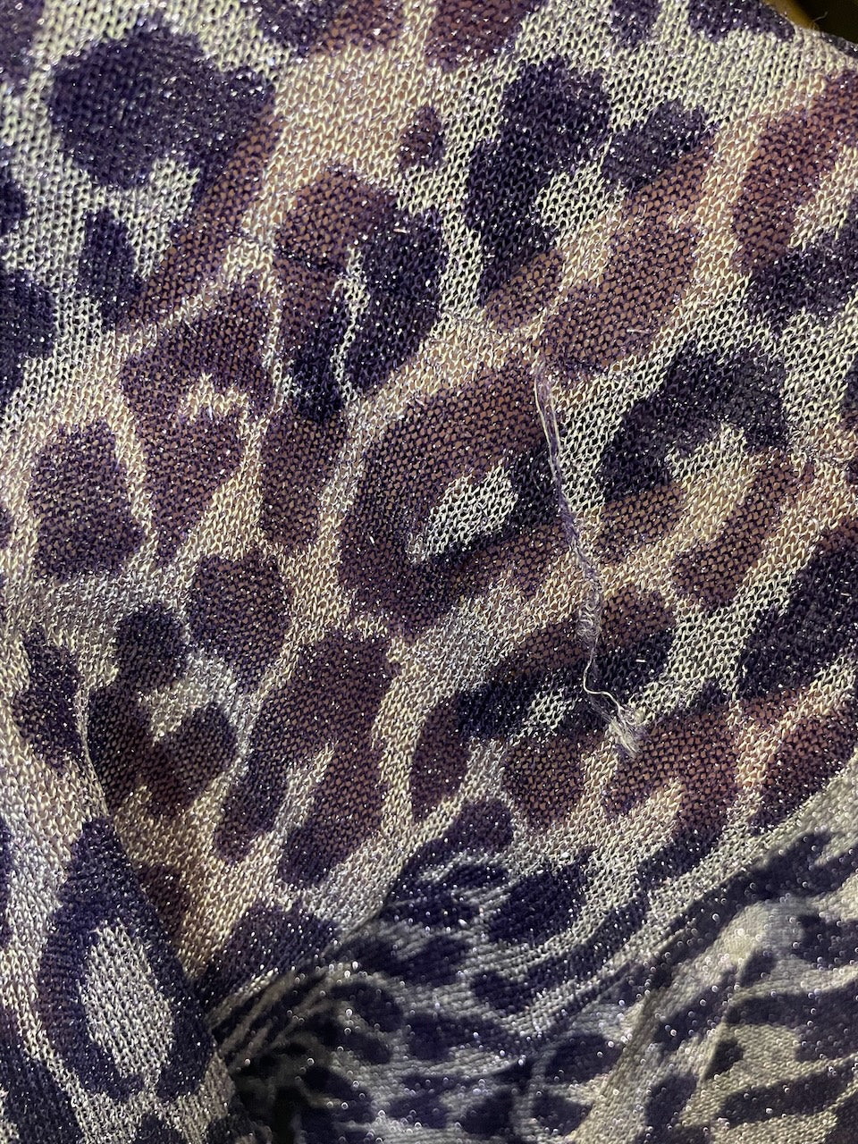 T-shirt en maille lurex violet à motif léopard à col rond et manches courtes.