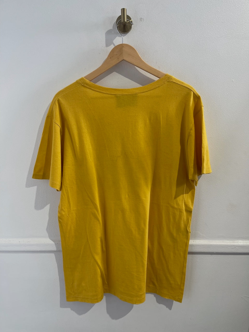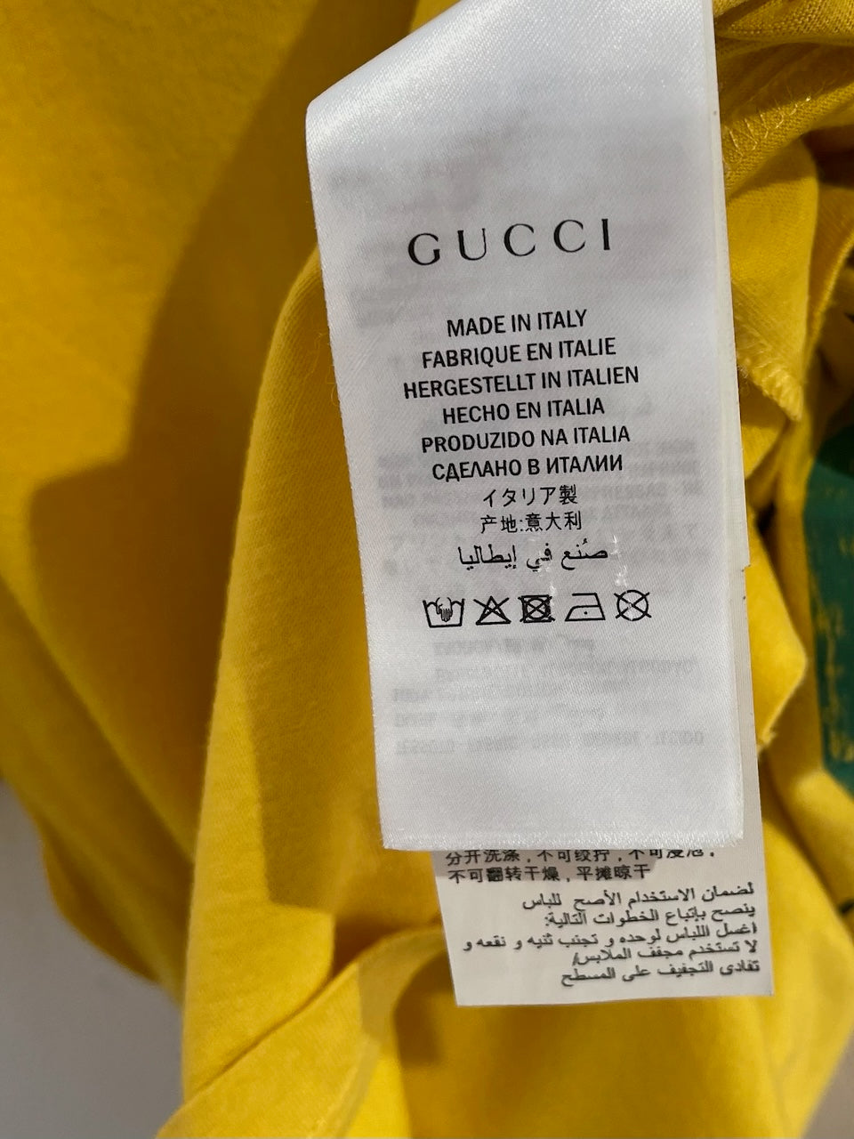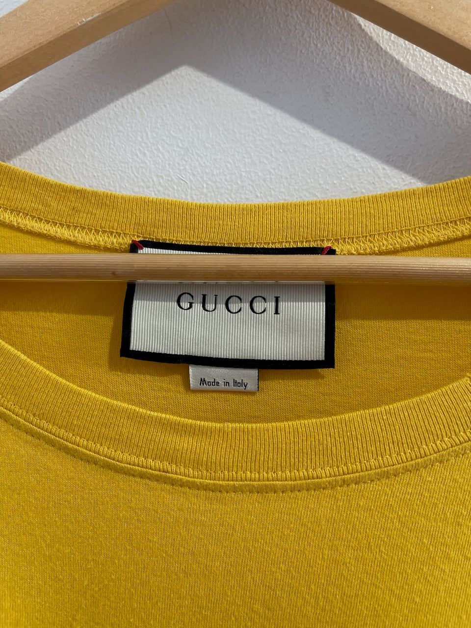 T-shirt à manches courtes en jersey de coton jaune avec imprimé Gucci vintage à l'avant. Col rond et manches courtes. Effet usé d'origine sur les bords du col. Coupe ample.