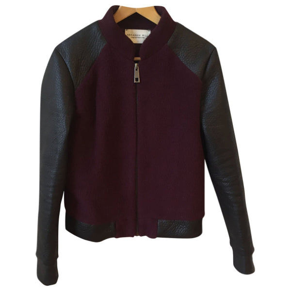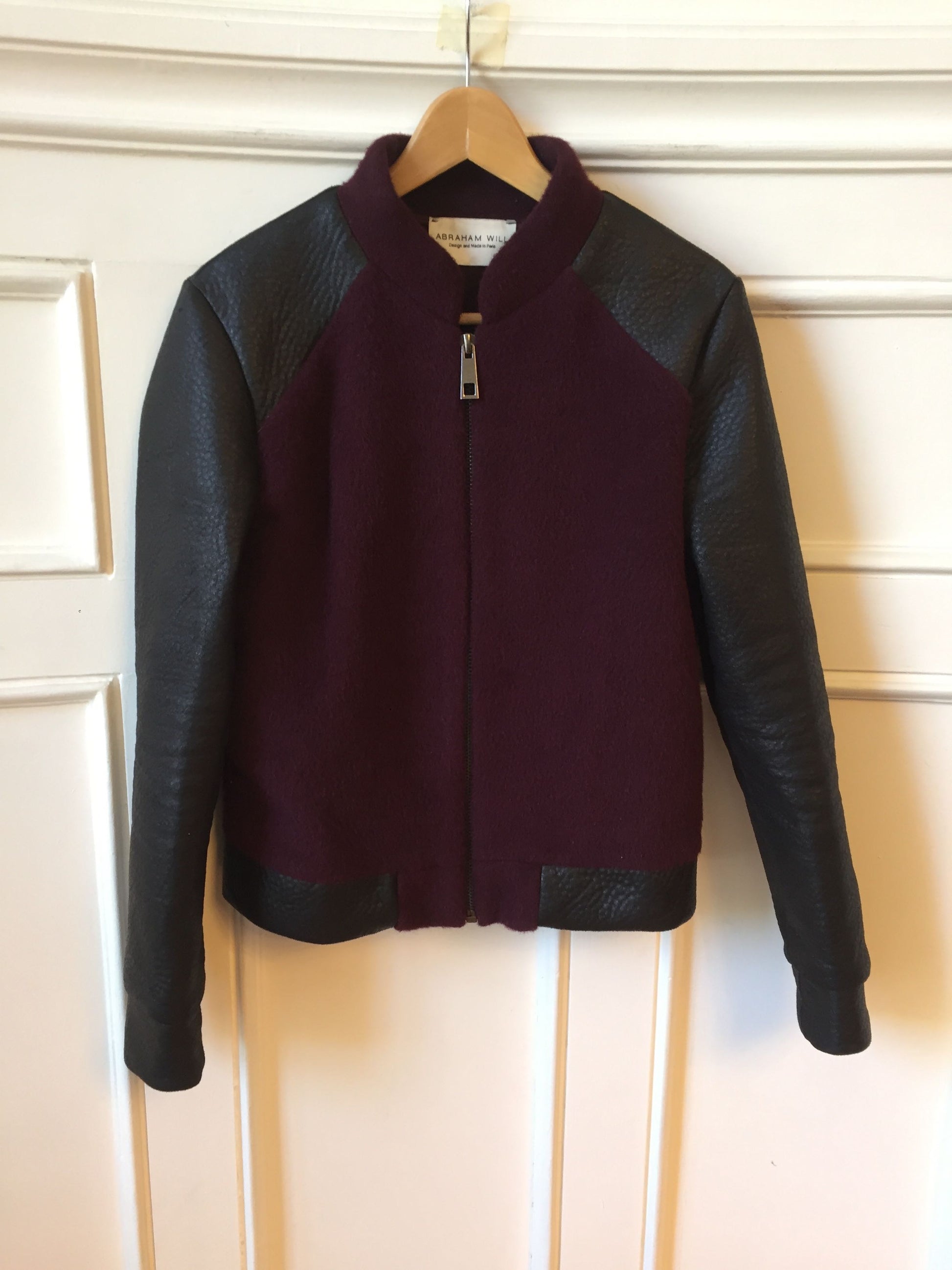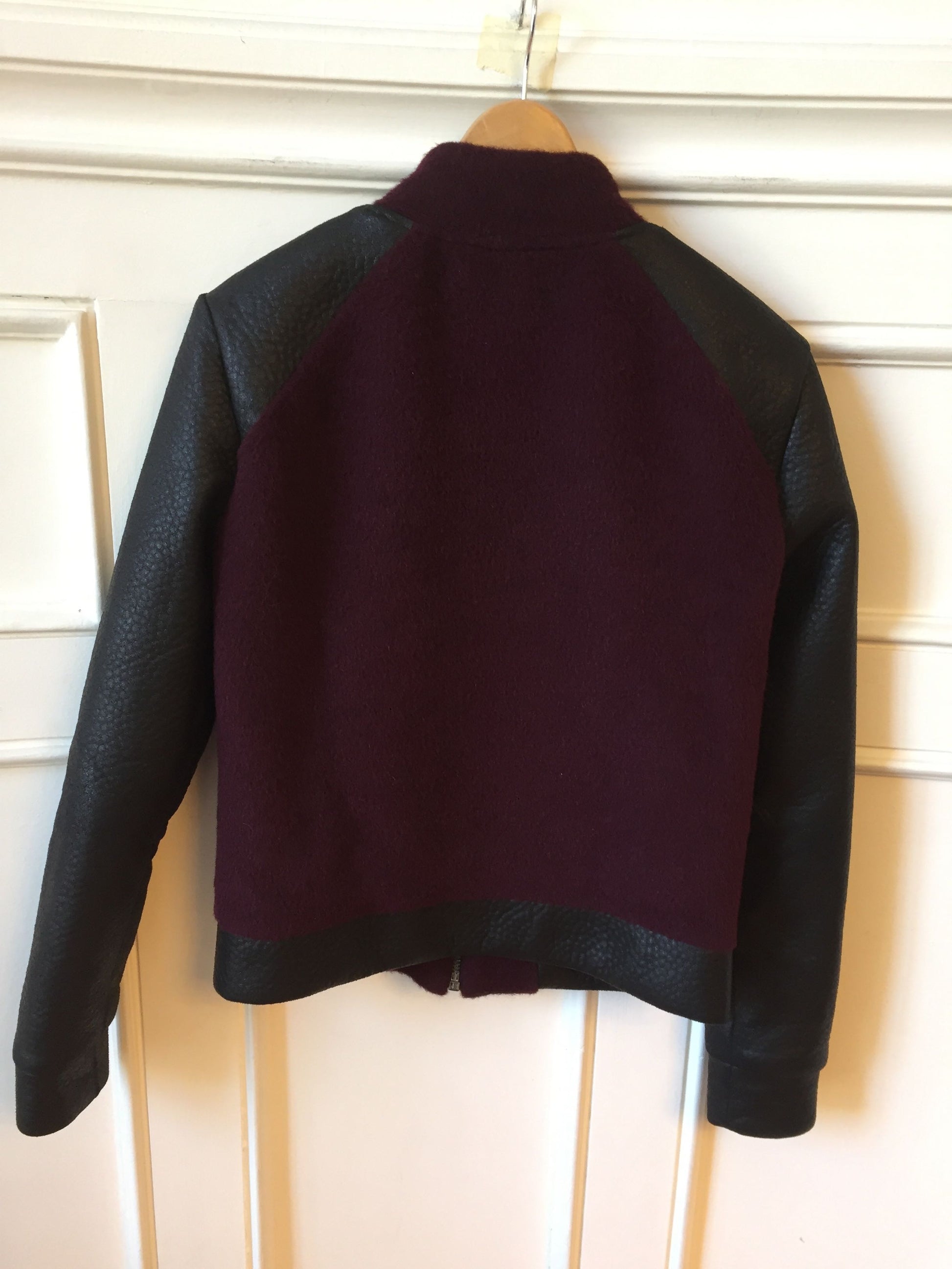 Veste bi-matière en laine bordeaux et manches en similicuir noir.