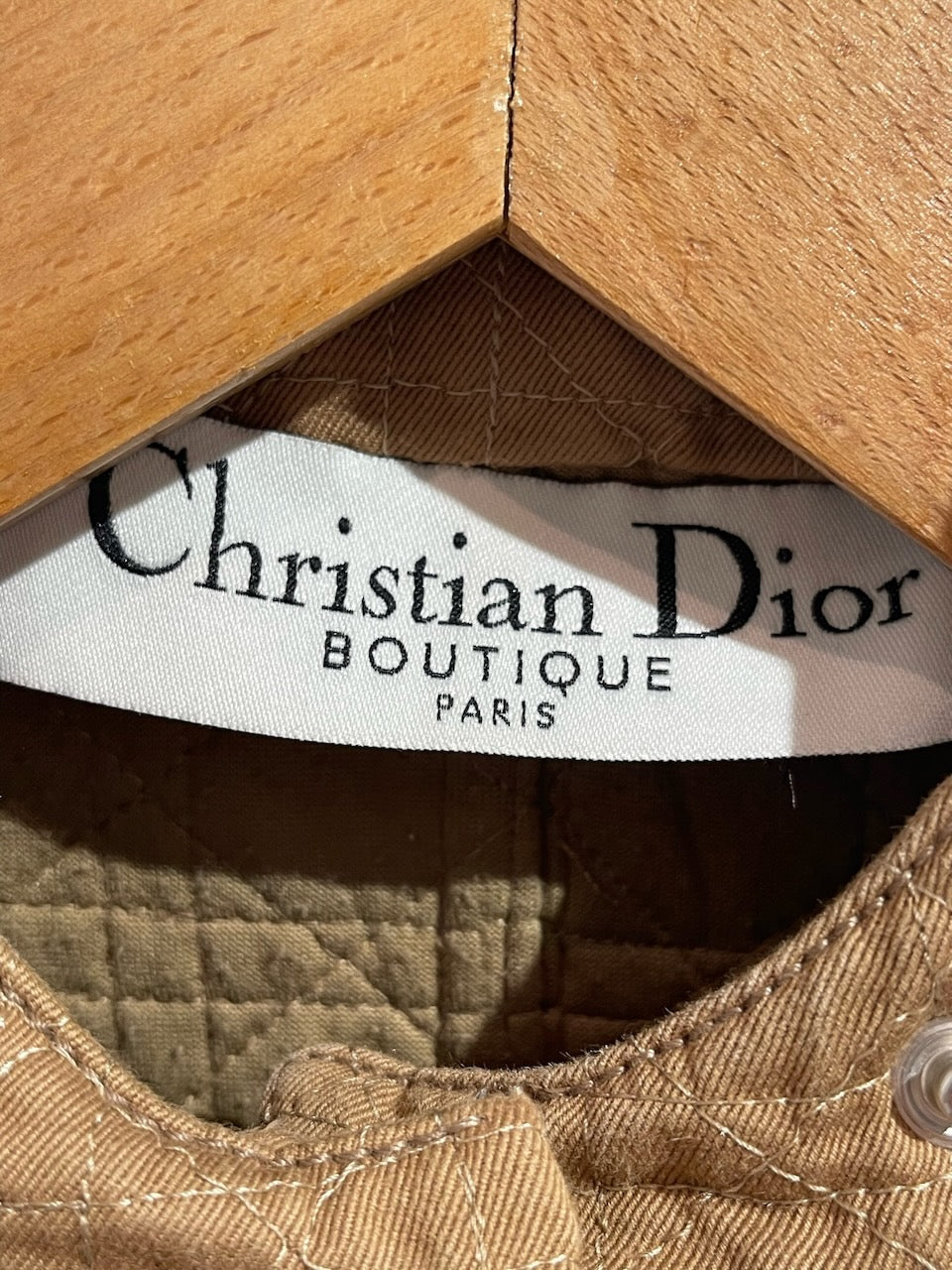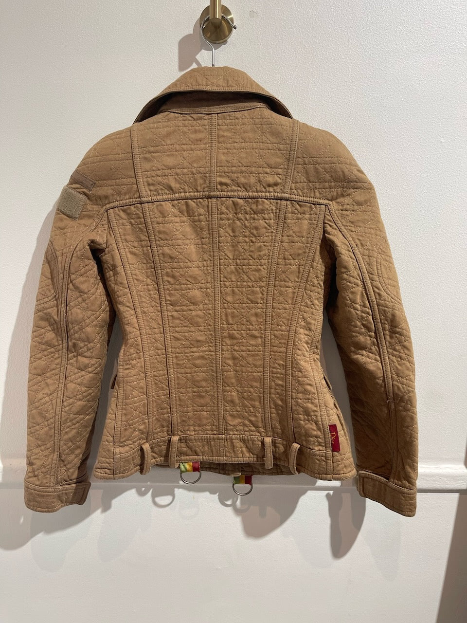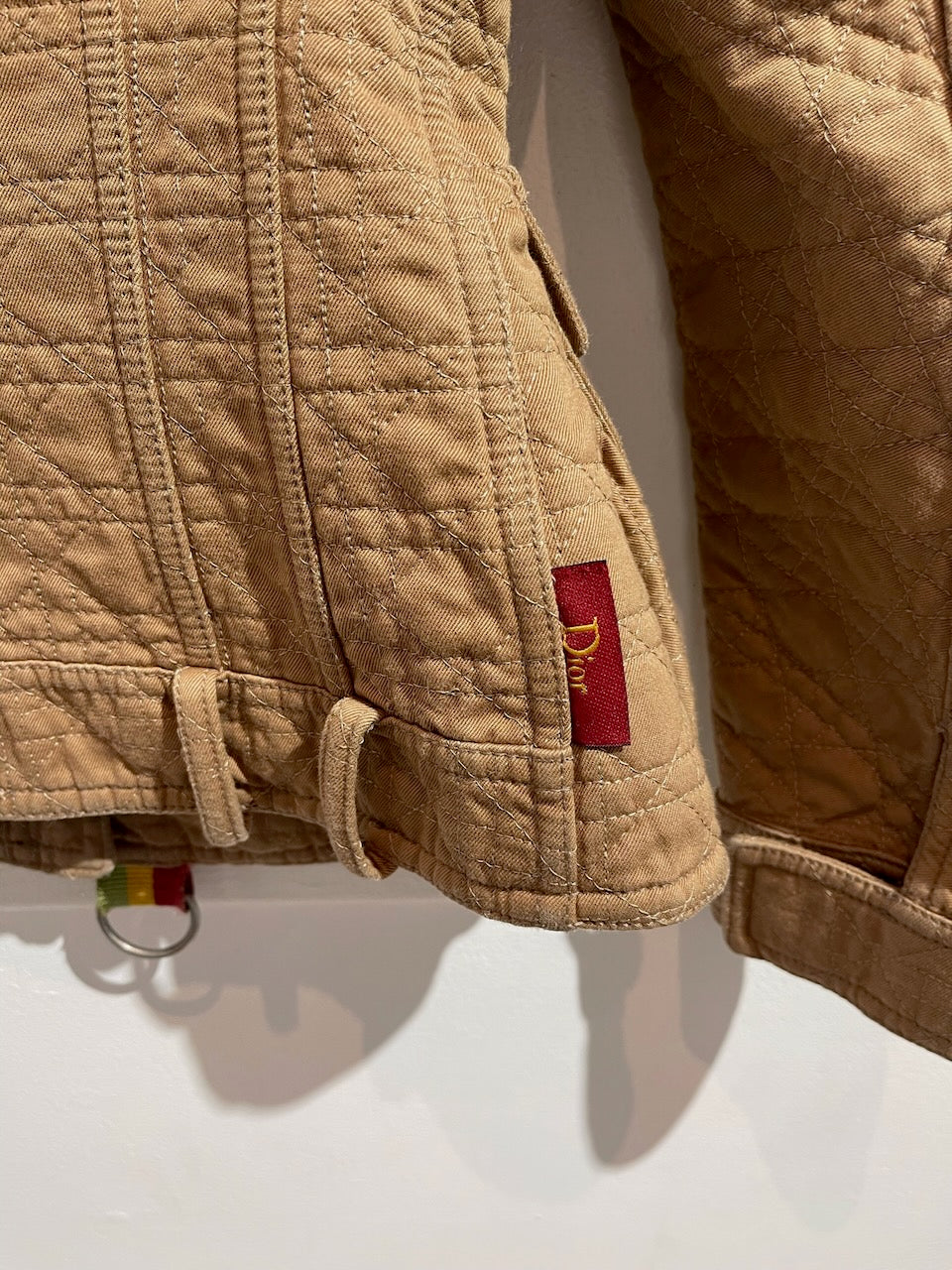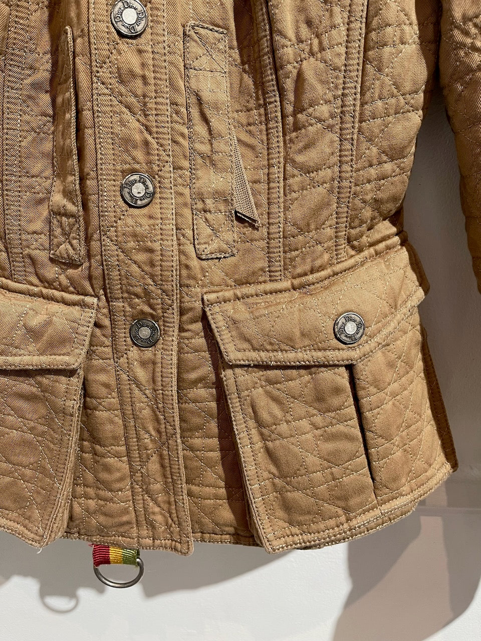 Veste en coton et lin beige foncé avec surpiqûres cannage, col effet revers et fermeture boutonnée signée Christian Dior. Poches avant et poches zip sur les manches. Poignets à scratch.
