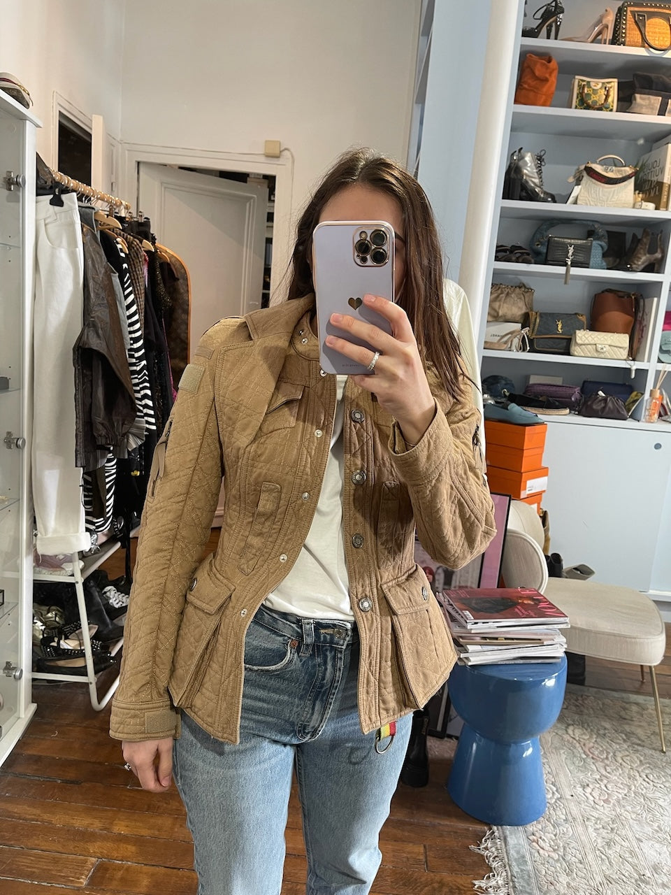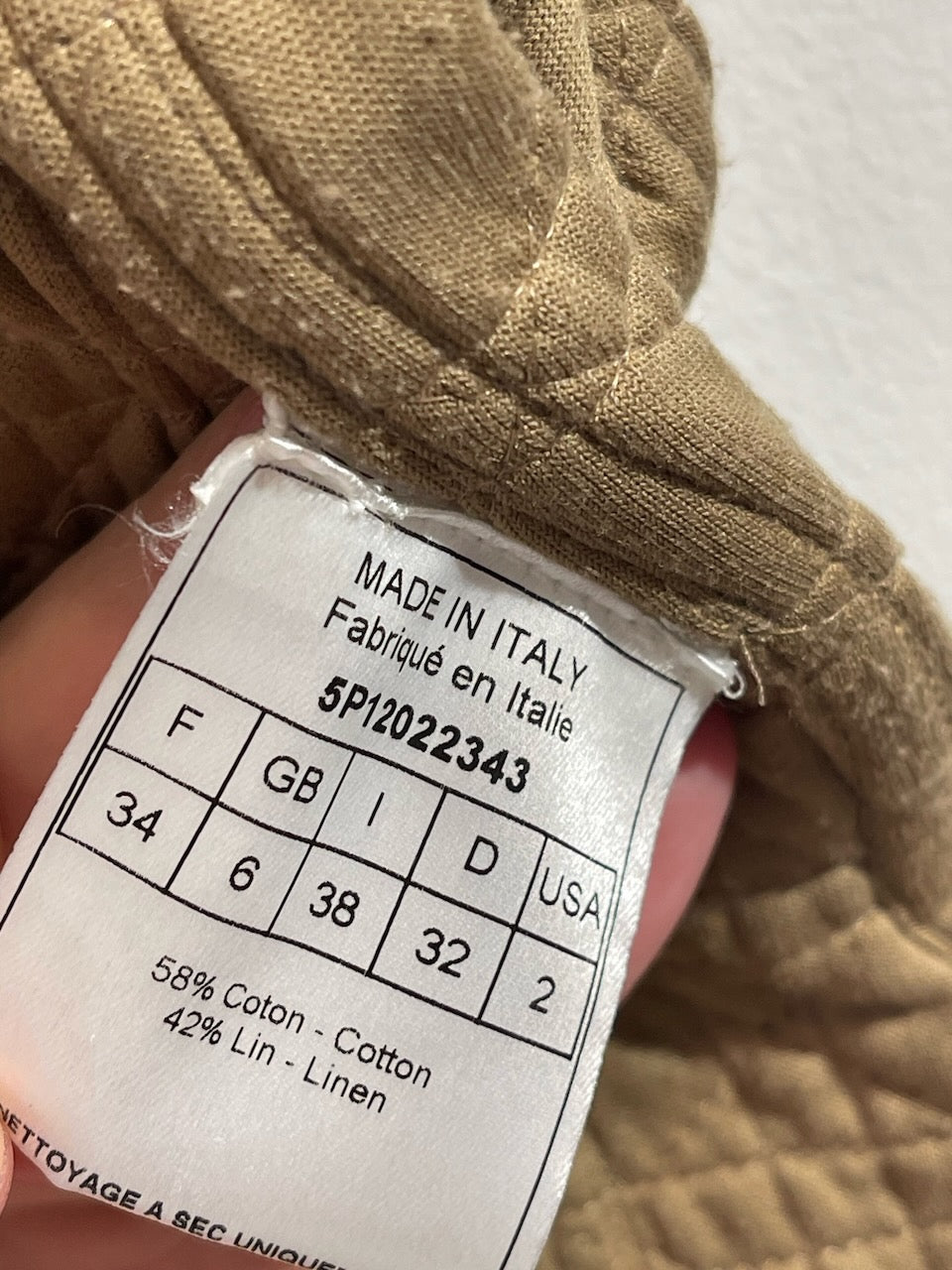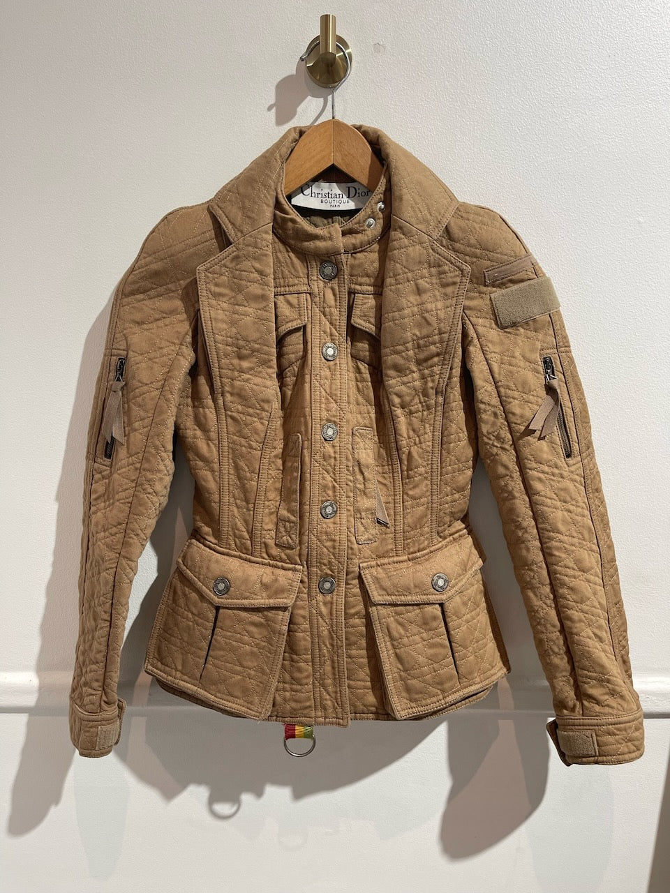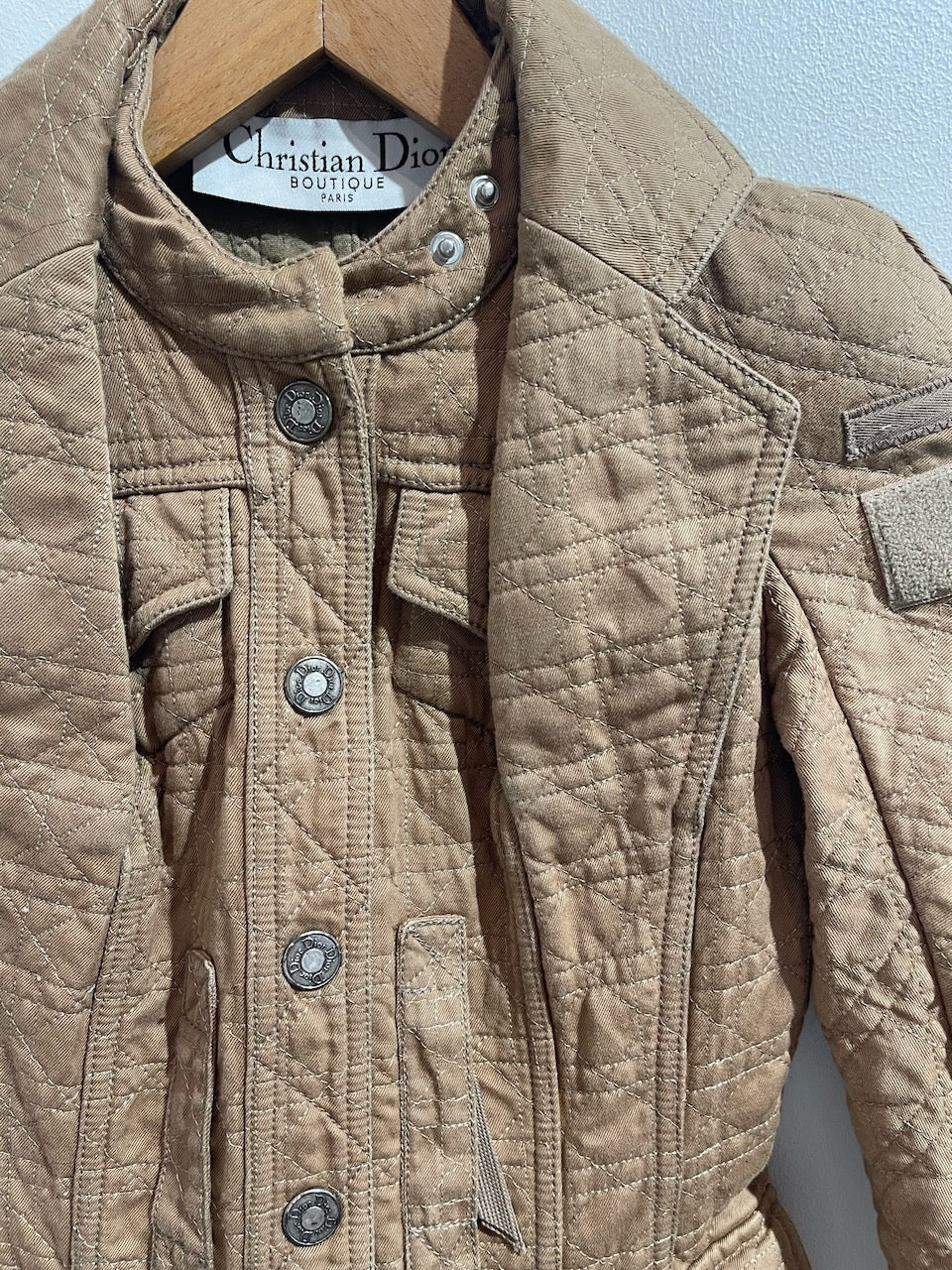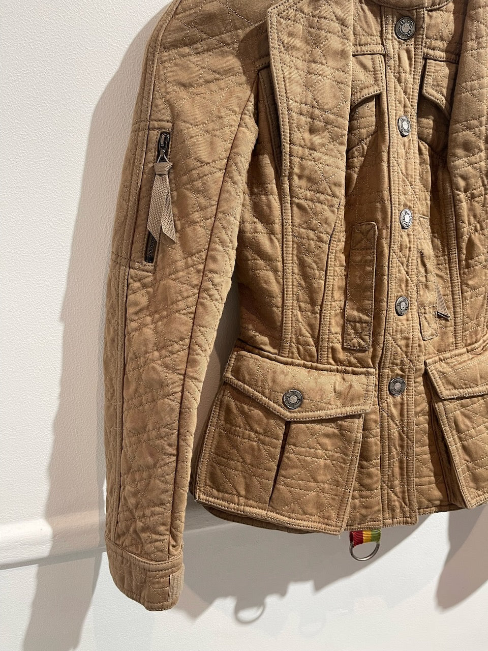 Veste en coton et lin beige foncé avec surpiqûres cannage, col effet revers et fermeture boutonnée signée Christian Dior. Poches avant et poches zip sur les manches. Poignets à scratch.