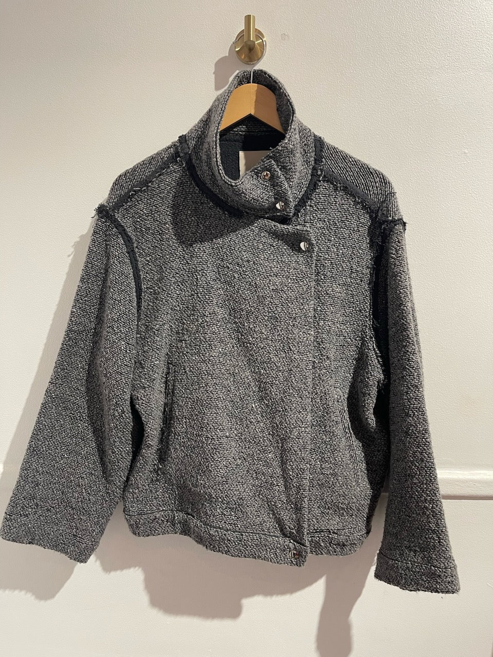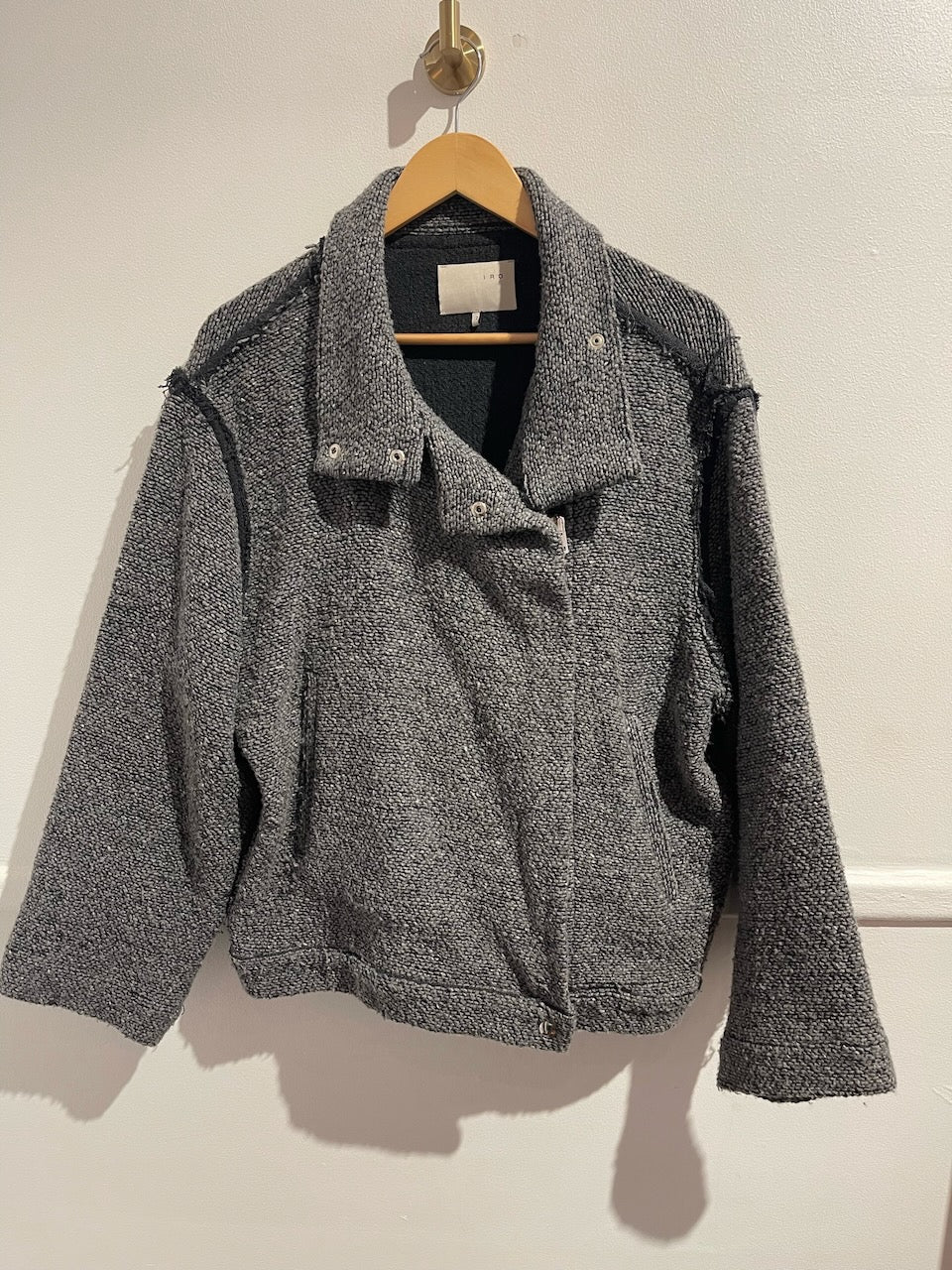 Veste style perfecto en coton mélangée gris chiné avec effet bords francs. Fermeture zip et boutons pression.