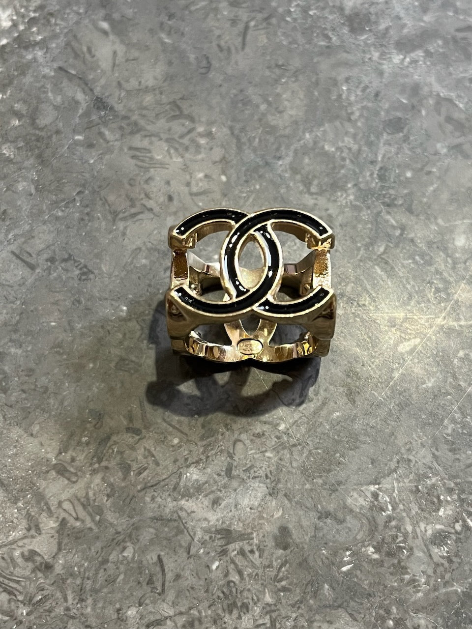 Bague en métal doré et résine noir composé de 4 logo CC.