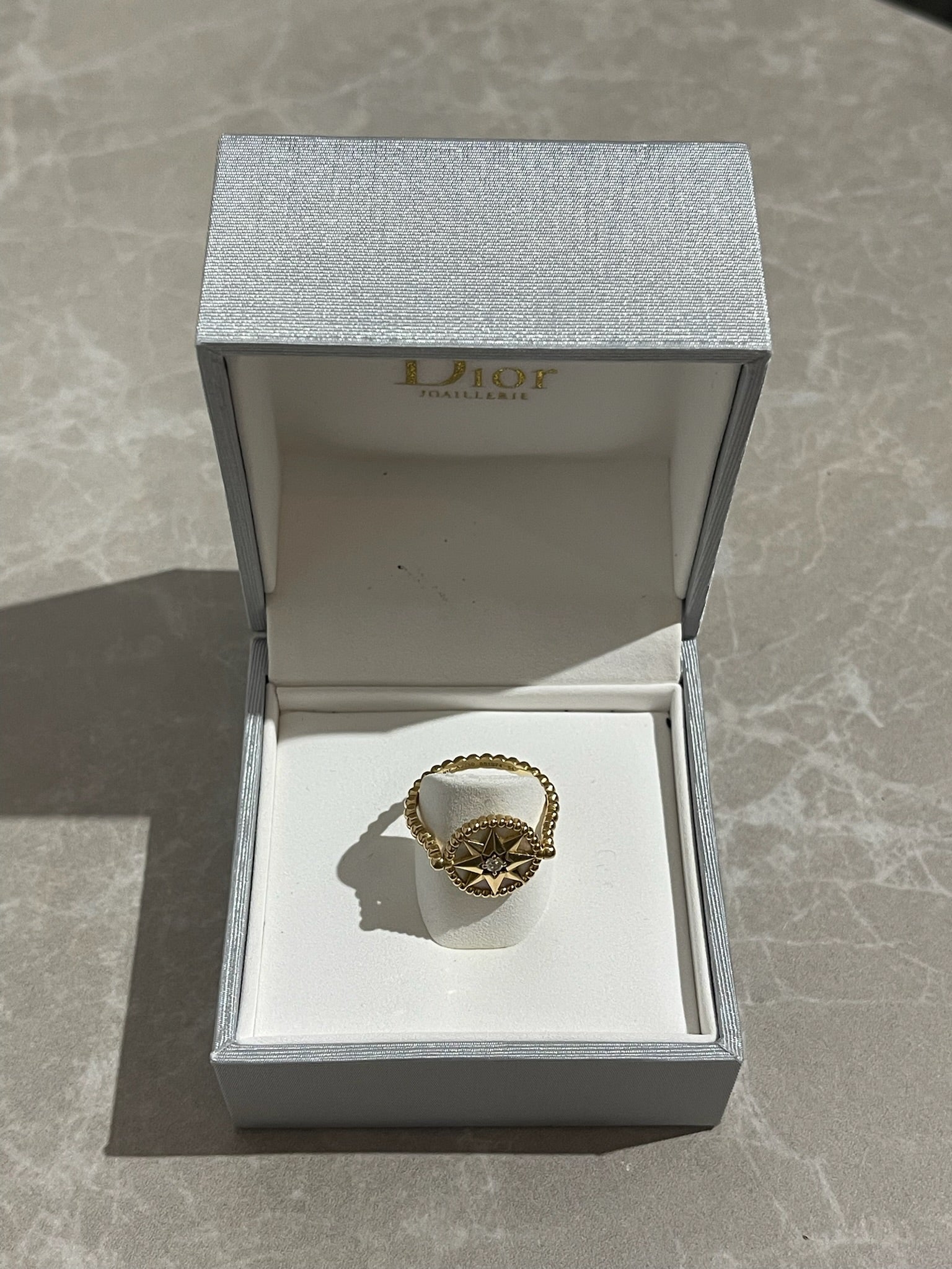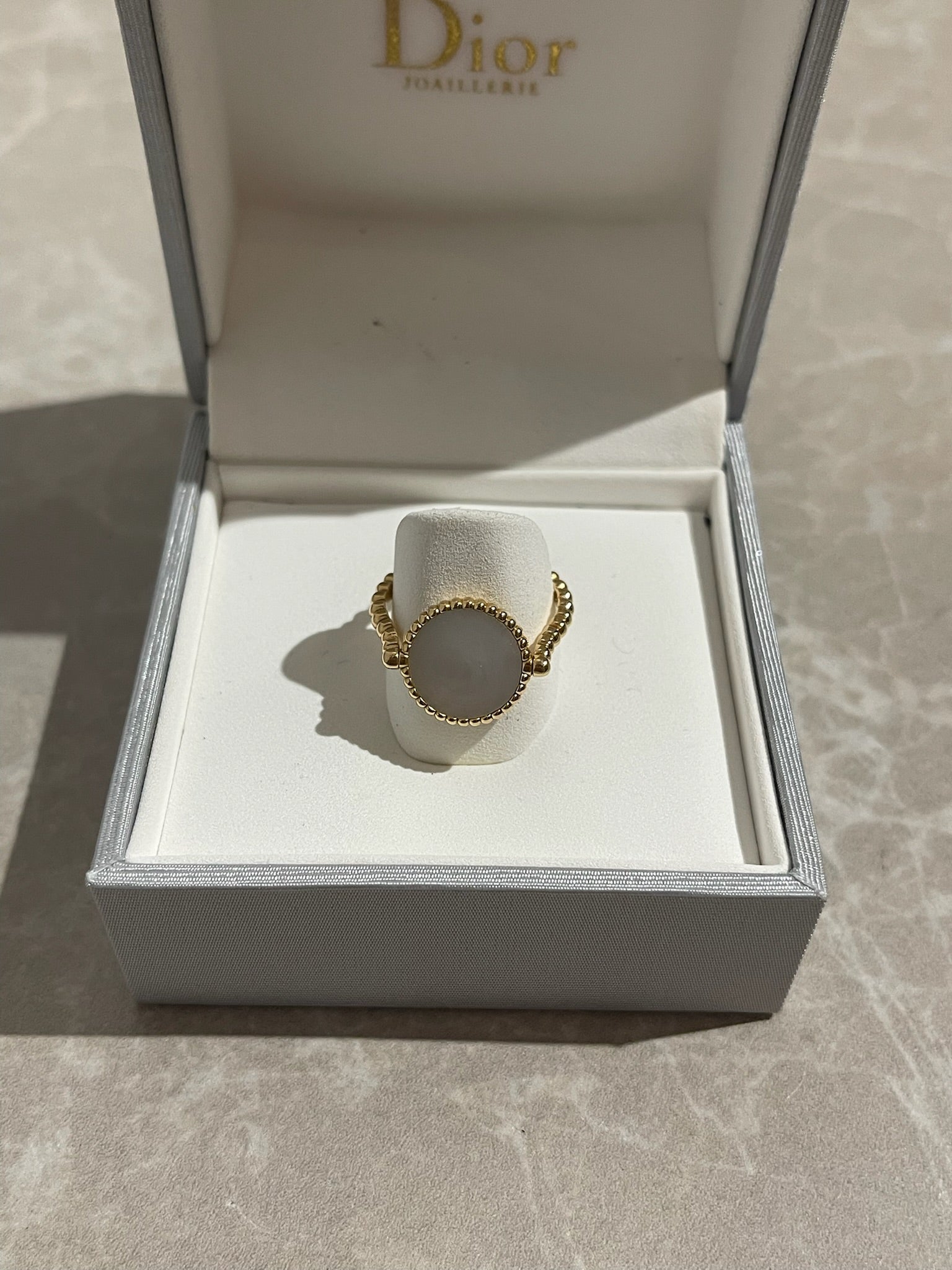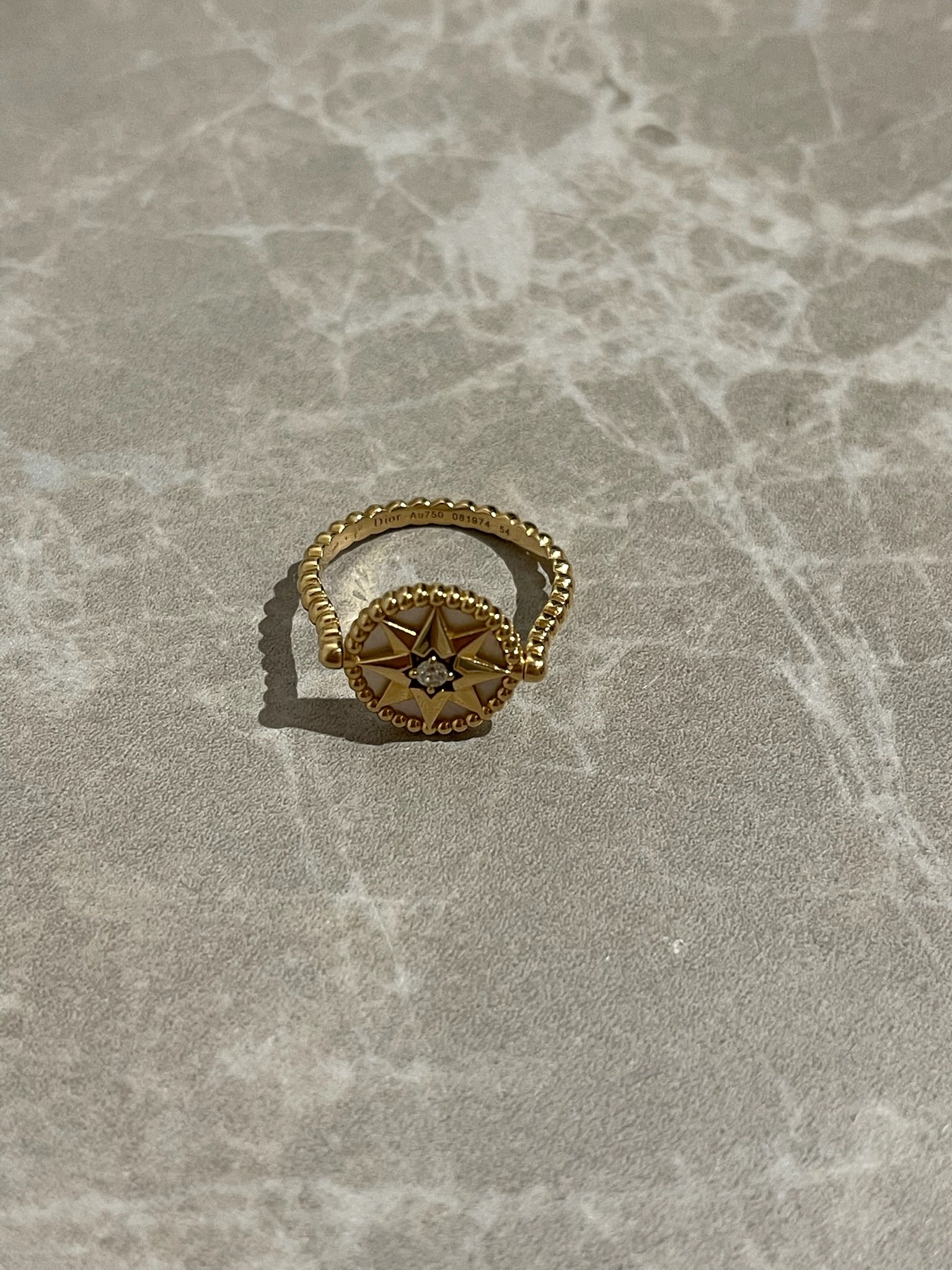 Bague en or jaune 750 millièmes (18 carats). Motif rose des vents réversible, serti de nacre blanche et d'un diamant. Poinçon tête d'aigle.